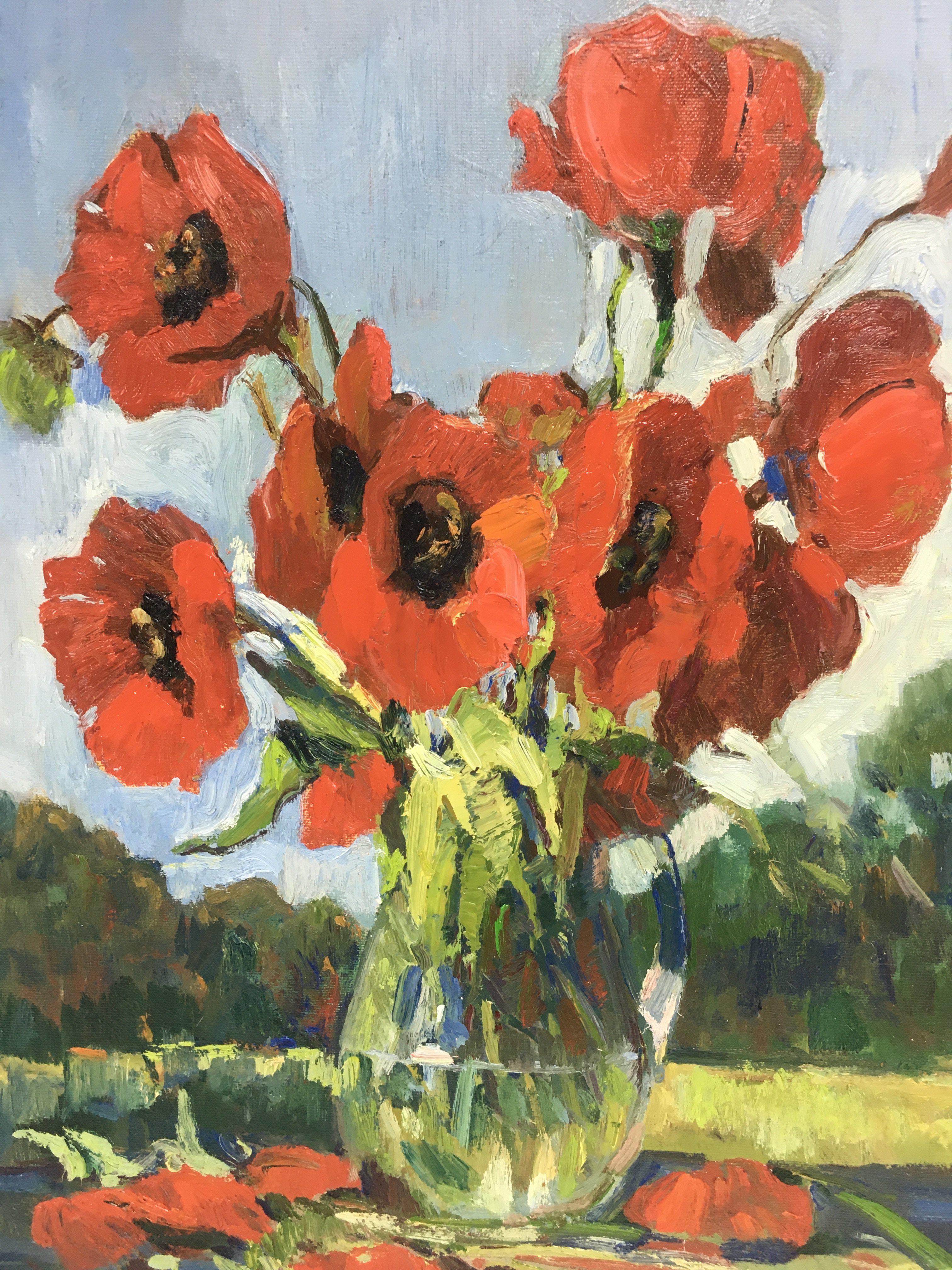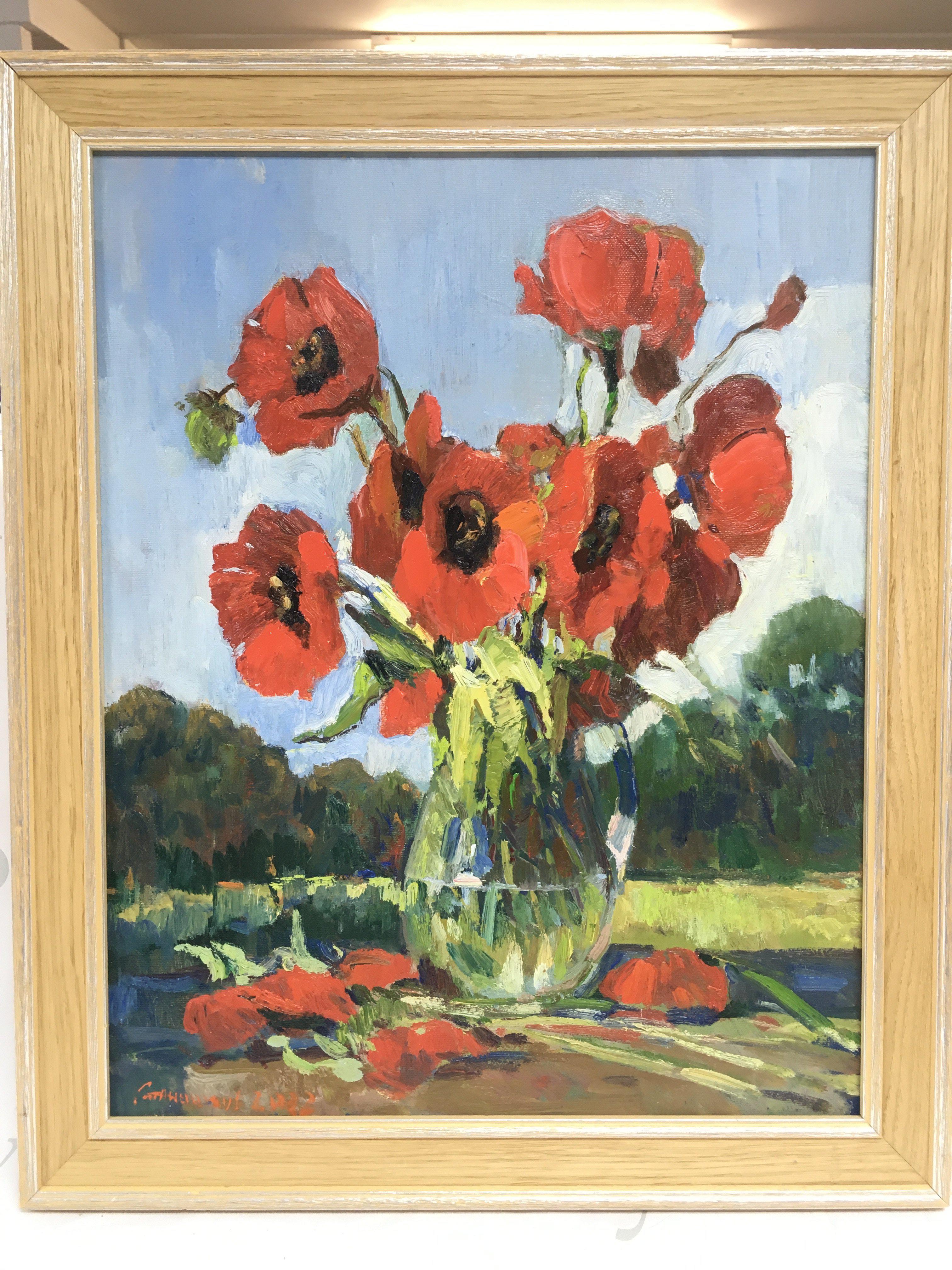 A framed oil painting depicting a vase of Poppies by Oleg Stanichnov , dimensions 48x58cm