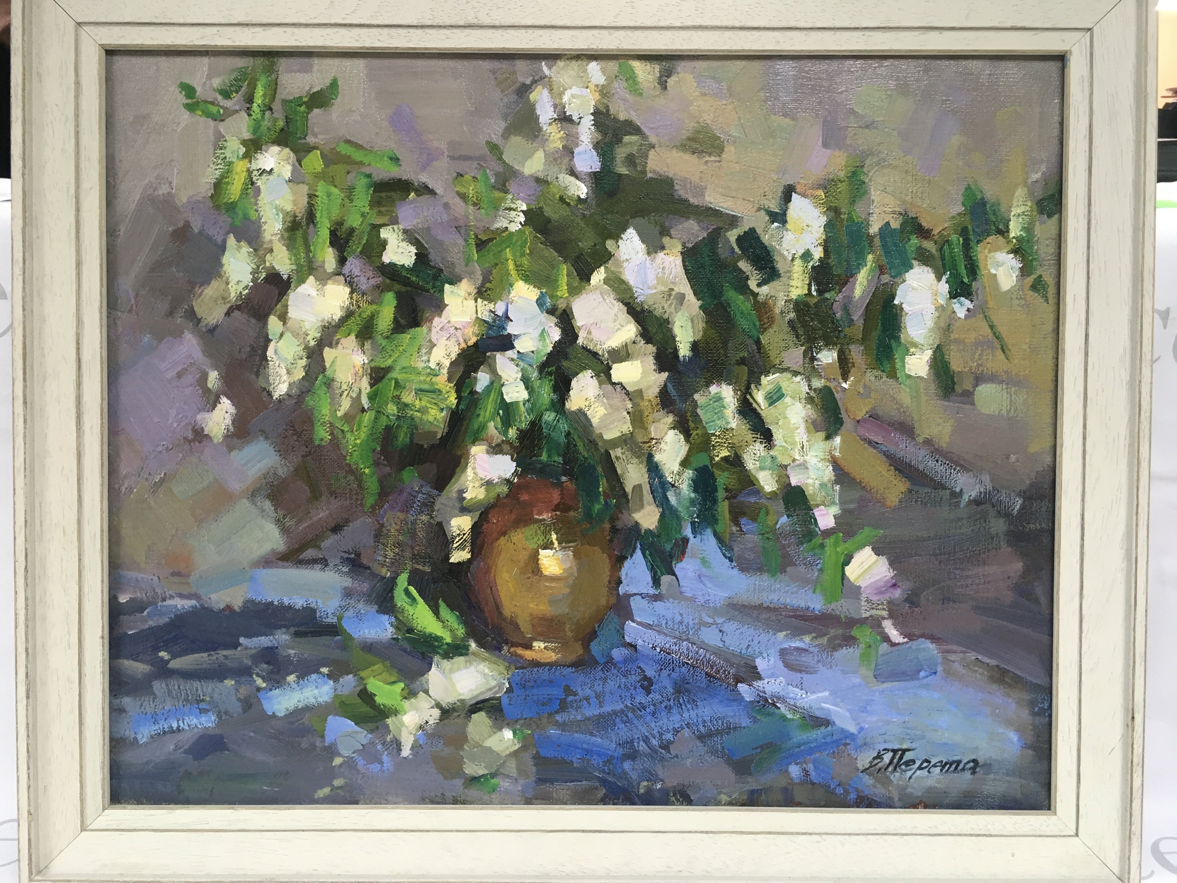 A framed White Lilac still life oil on canvas painting by Vyacheslav Pereta, 61x51cm