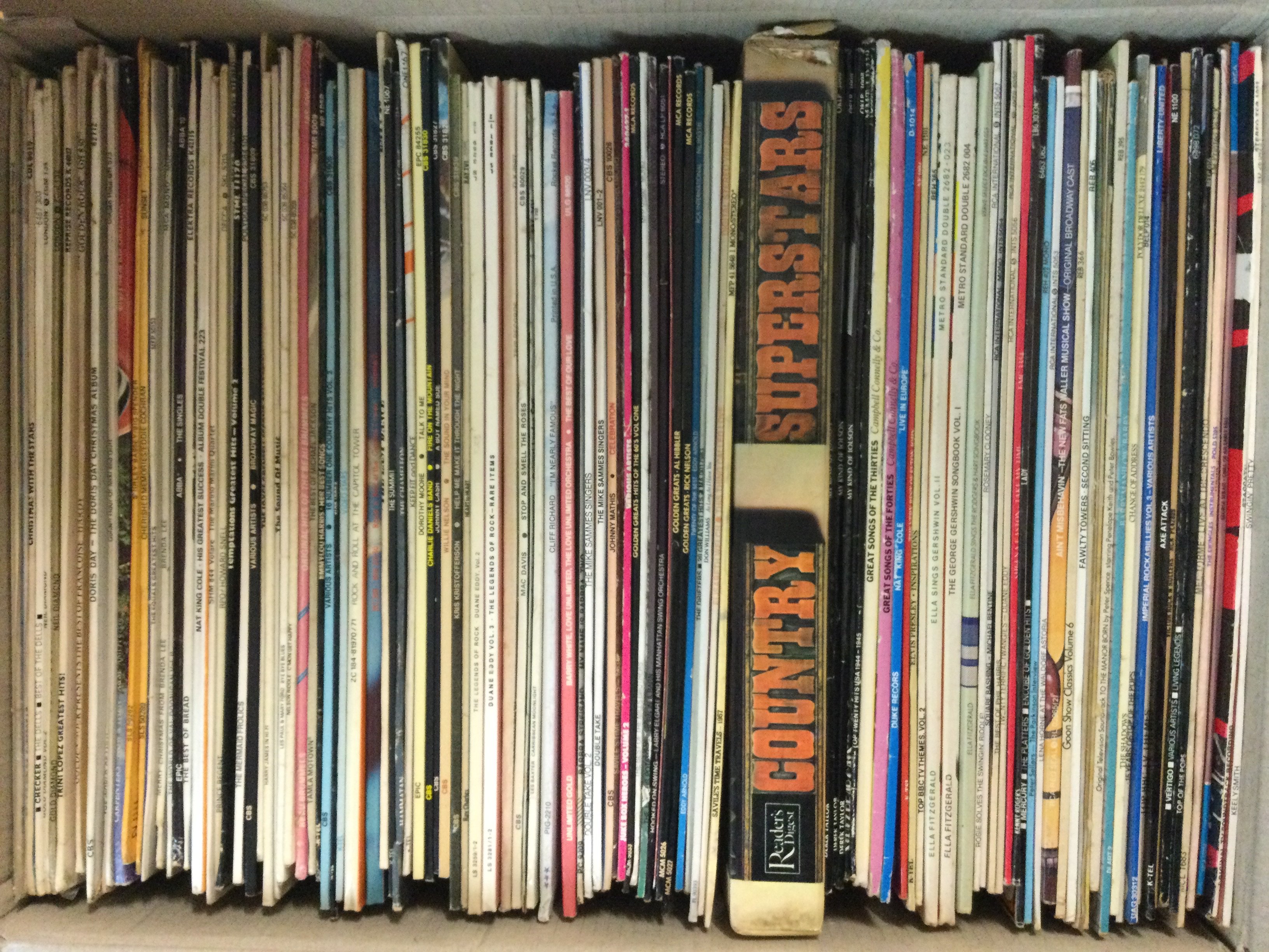 Four boxes of vinyl records including Country Superstars, Elvis, Ella Fitzgerald, Nat King Cole etc