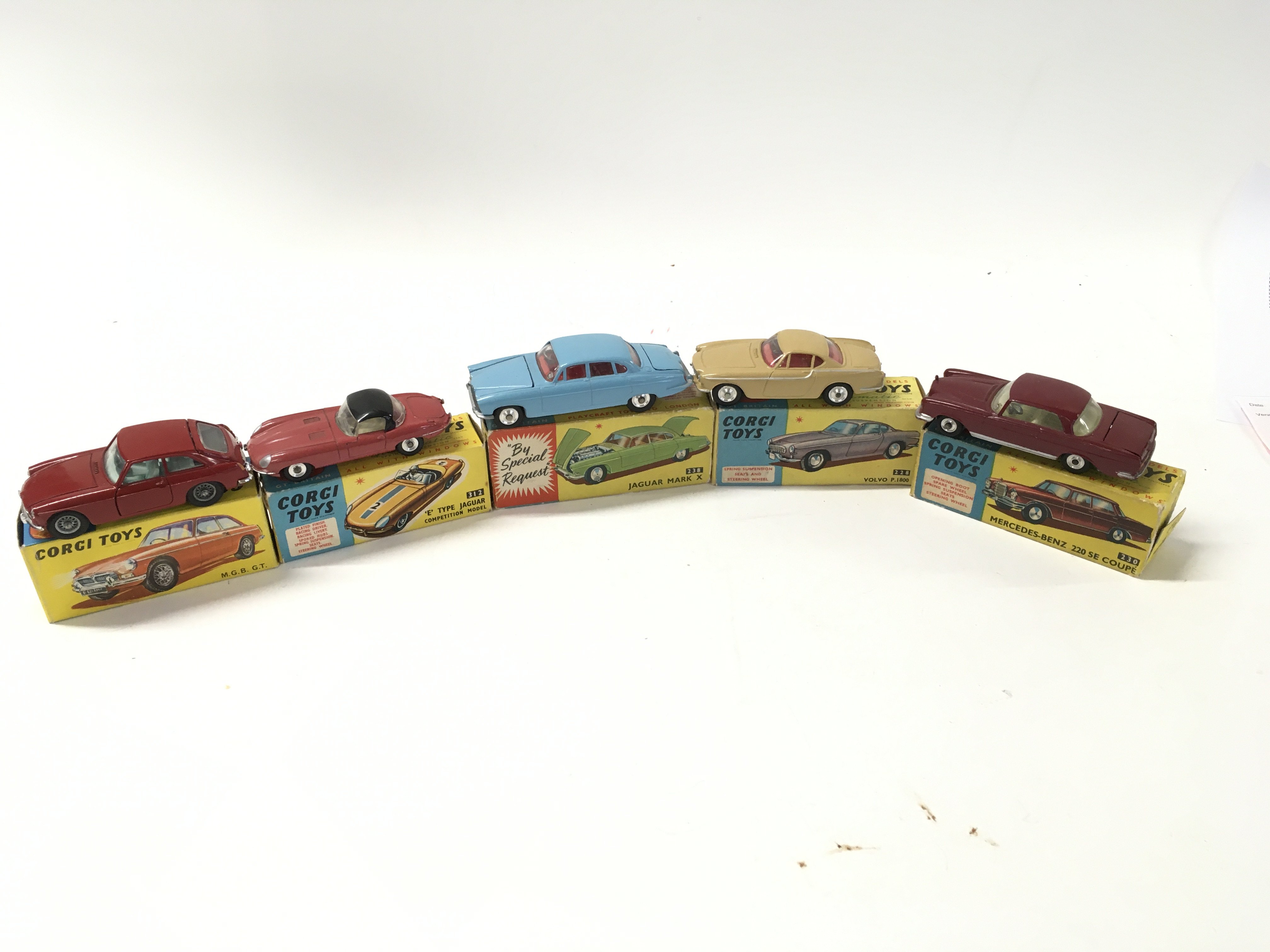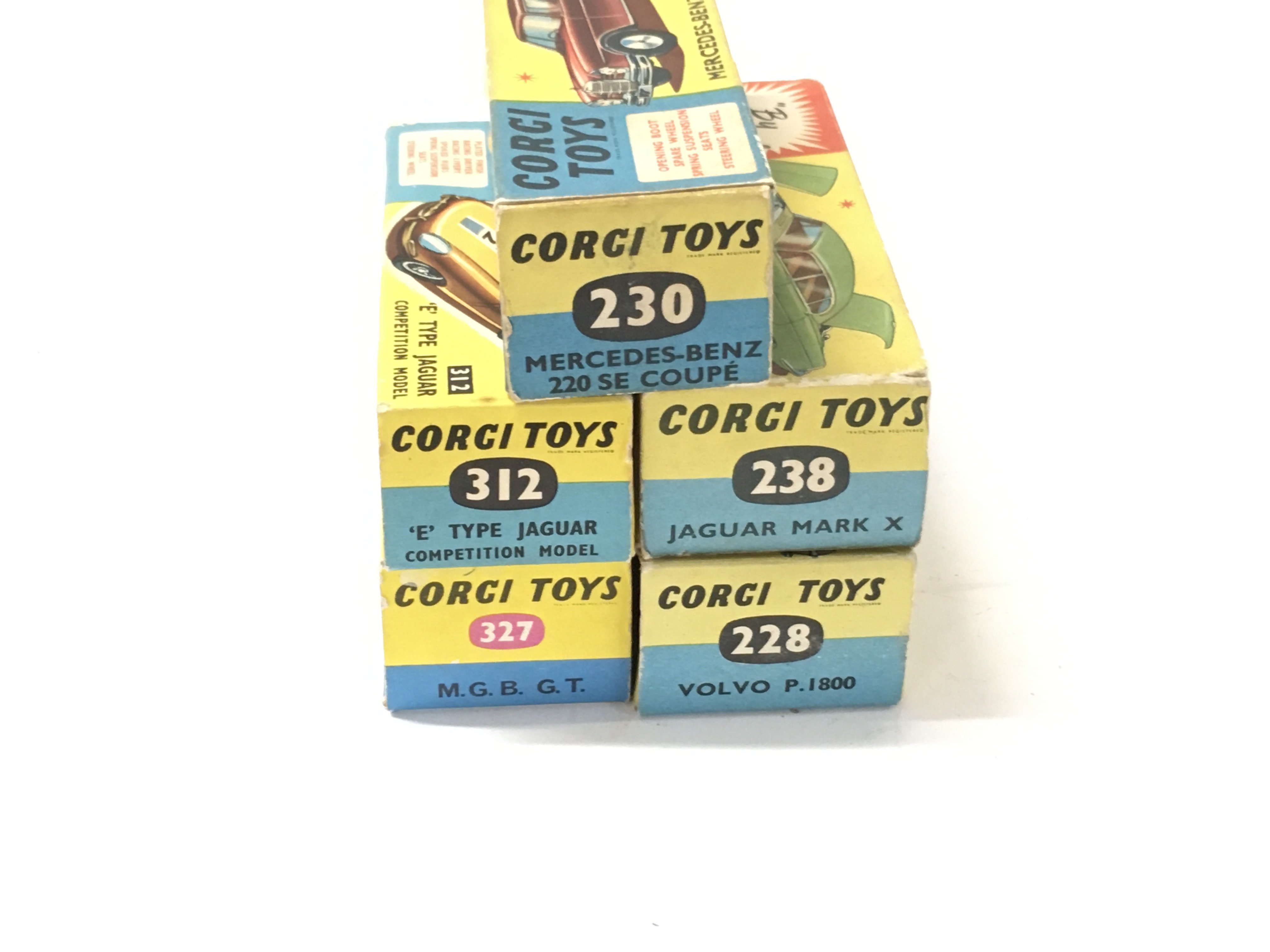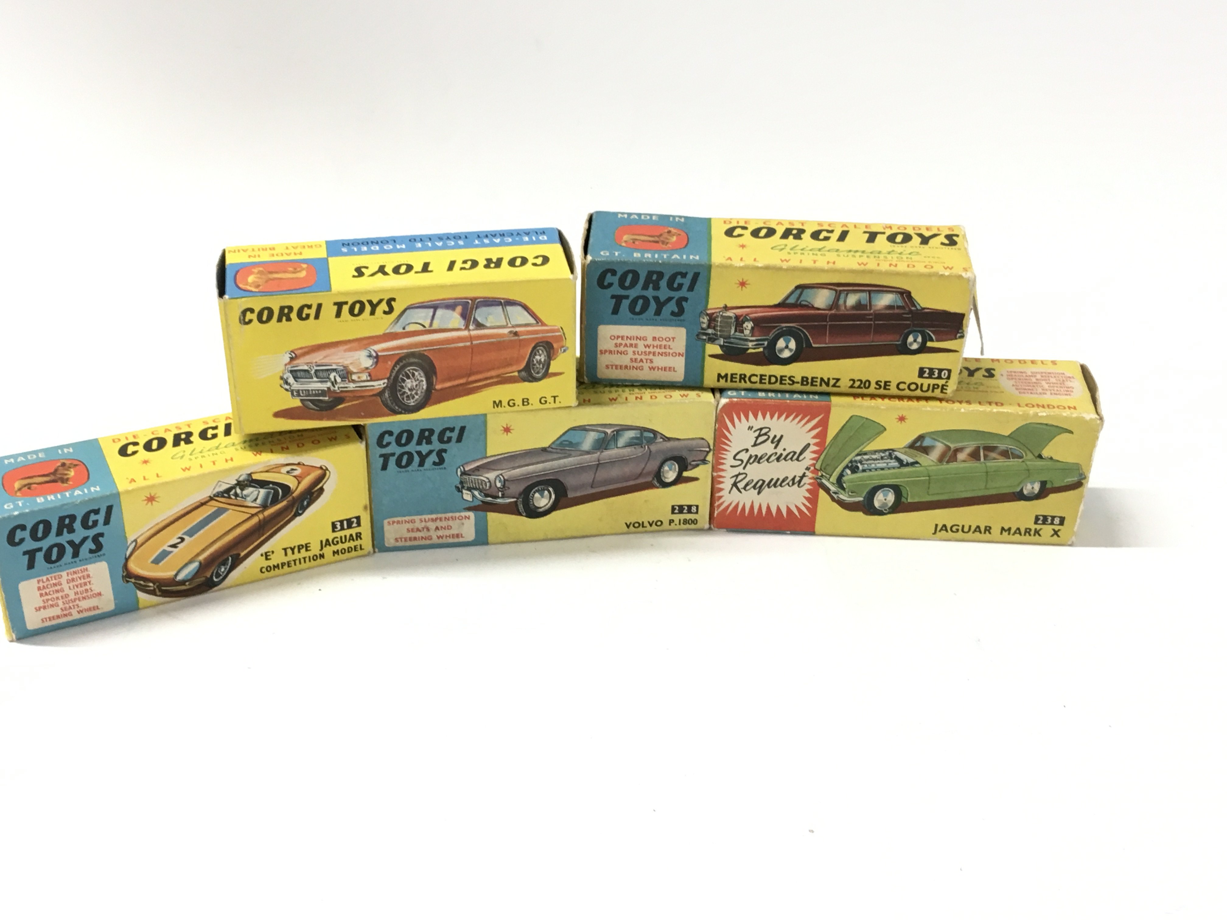 A collection of 5 boxed diecast model cars by Corgi includes No228 a Volvo P.1800..No230 a Mercedes Benz 220se Coupe..No238 a Jaguar Mark X ..No312 a E Type Jaguar and No327 a MGB GT