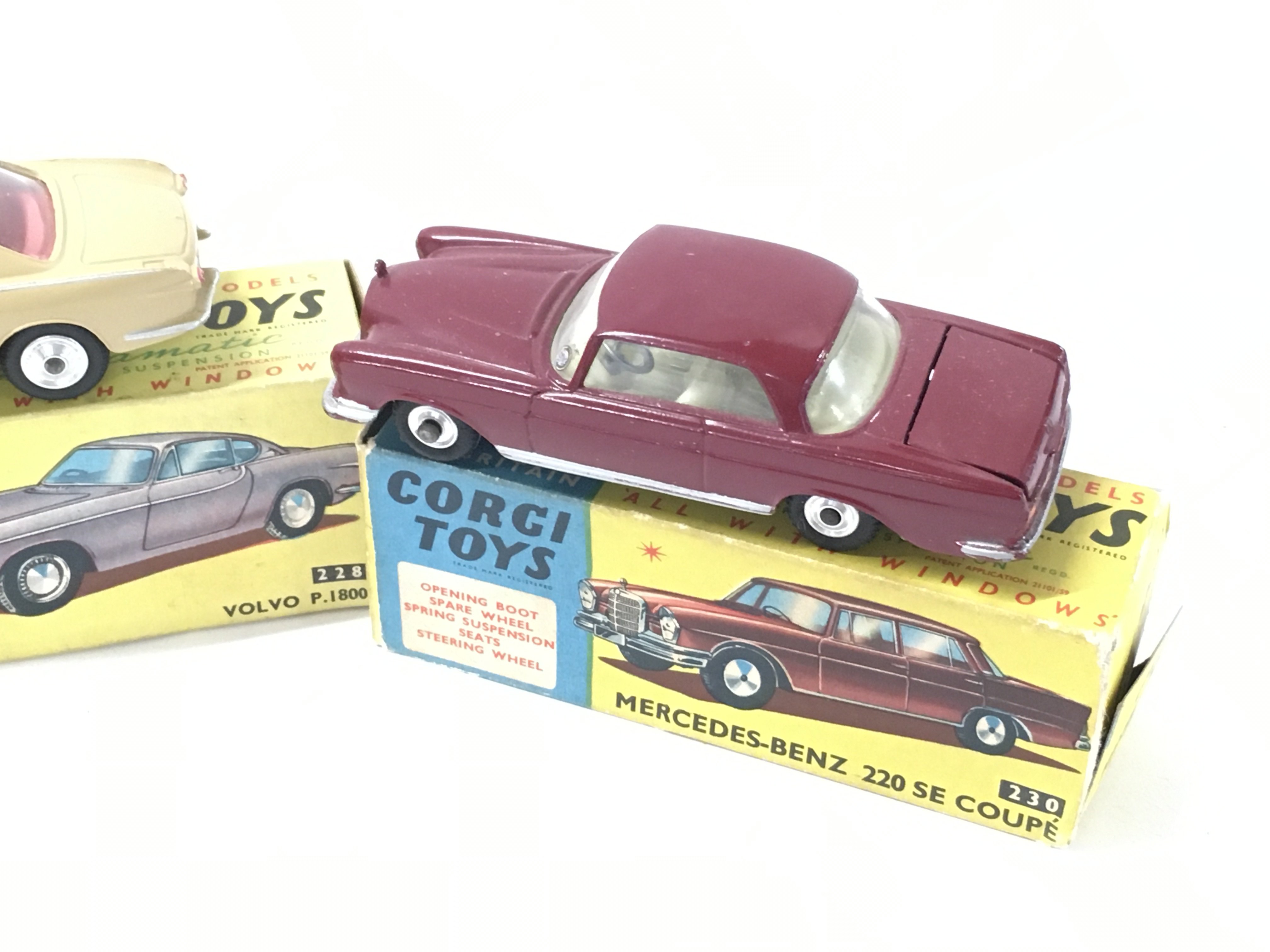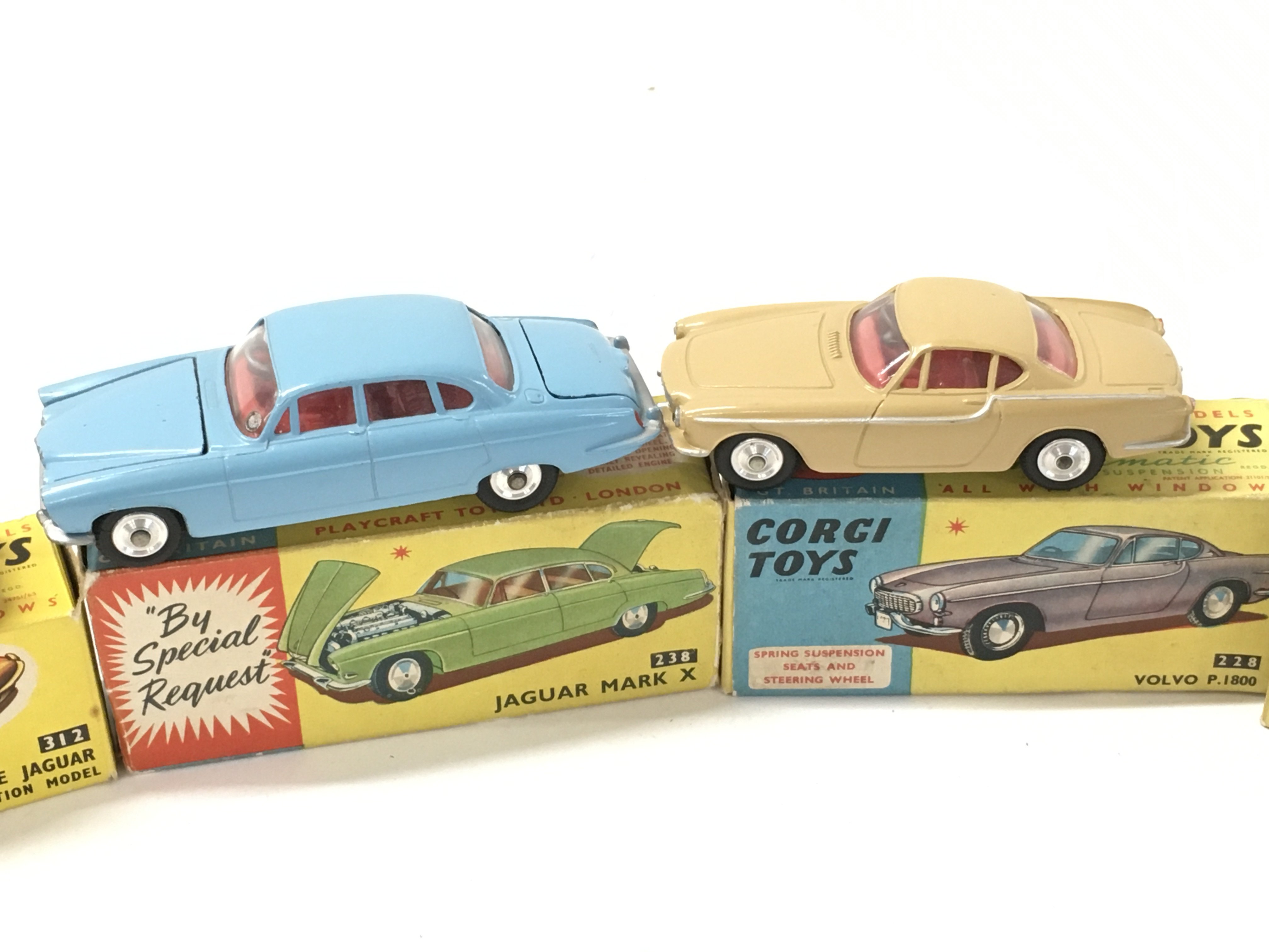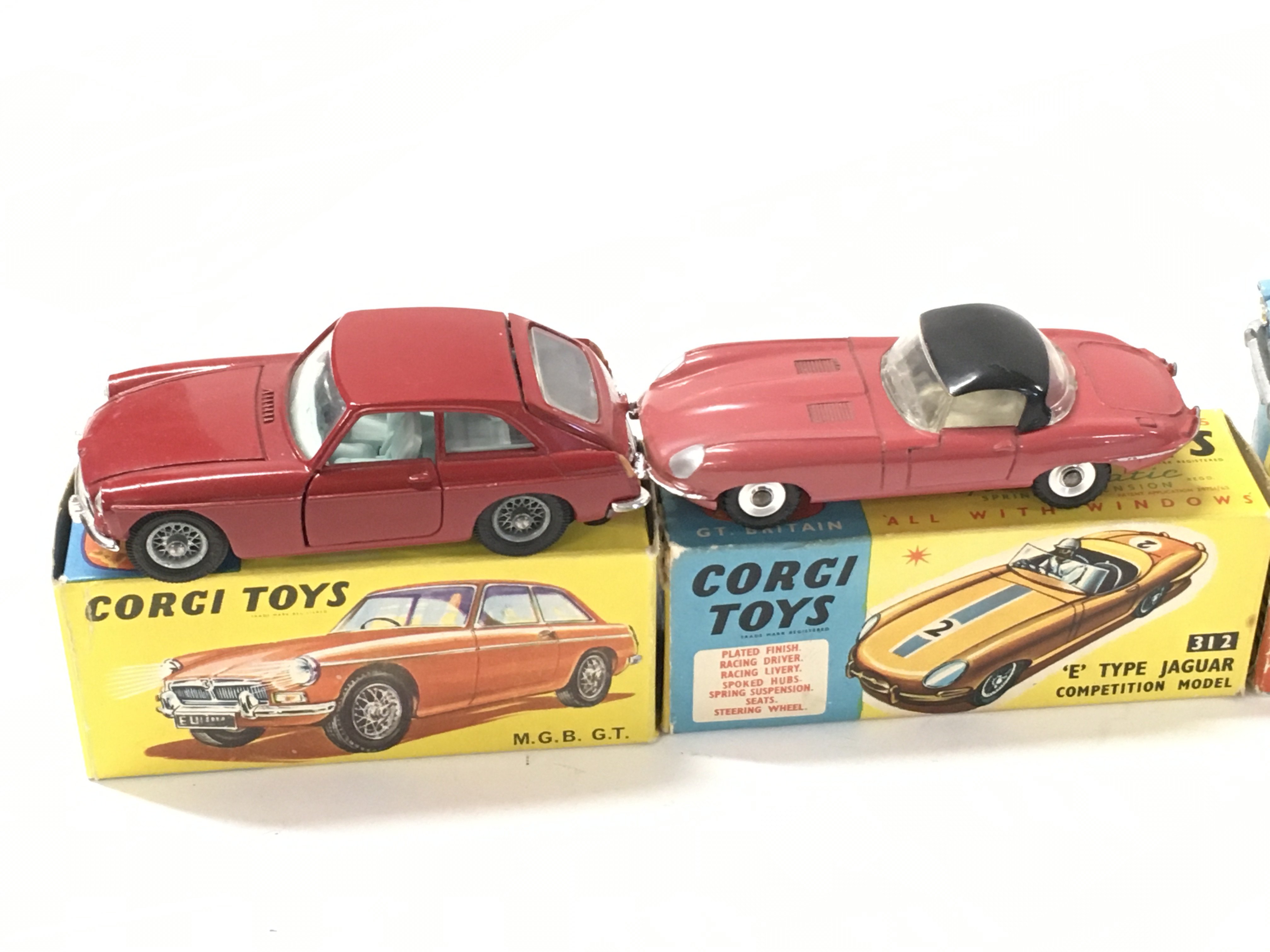 A collection of 5 boxed diecast model cars by Corgi includes No228 a Volvo P.1800..No230 a Mercedes Benz 220se Coupe..No238 a Jaguar Mark X ..No312 a E Type Jaguar and No327 a MGB GT