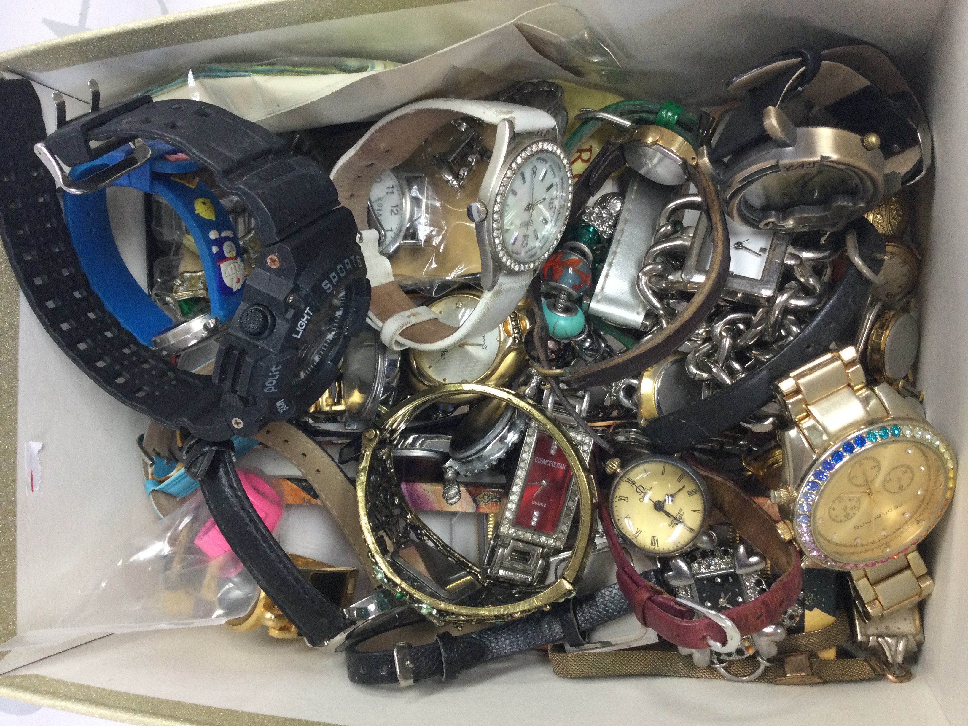 A box containing various watches including Timex, Majex, Javiva, Smiths Sekonda etc