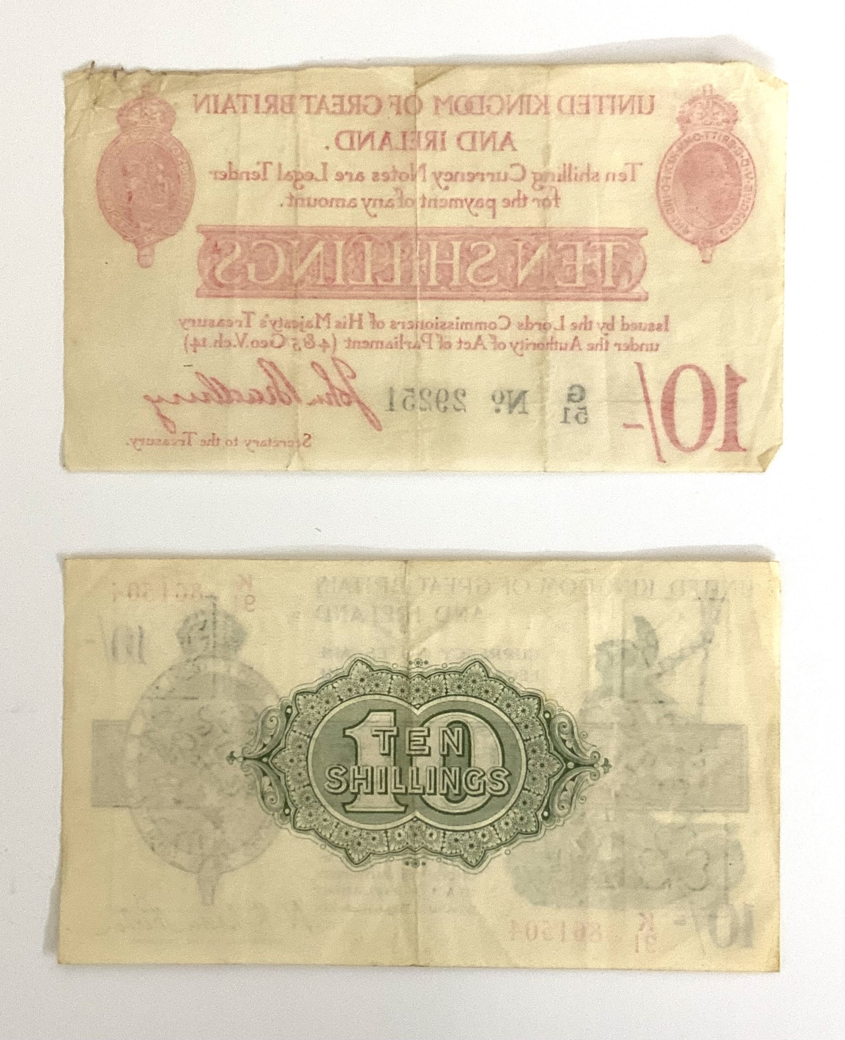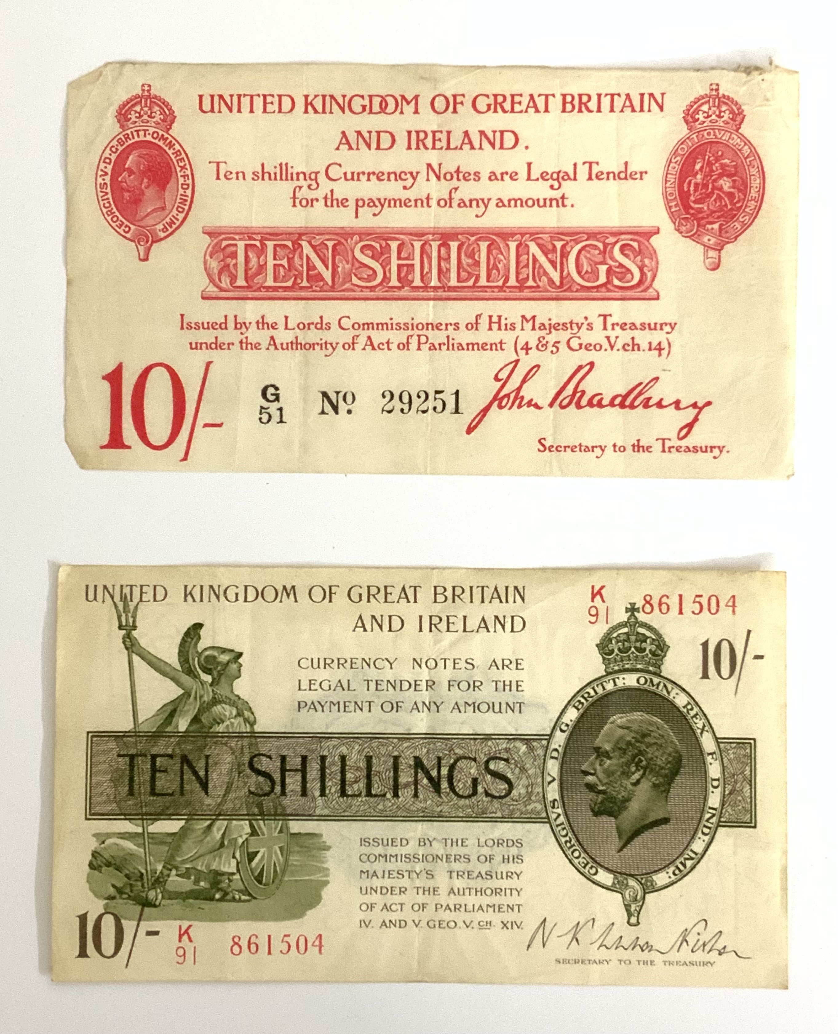 Treasury notes. John Bradbury Ten Shilling 2nd issue G/51 No.29251, Warren Fisher 2nd Issue K/91 861505.