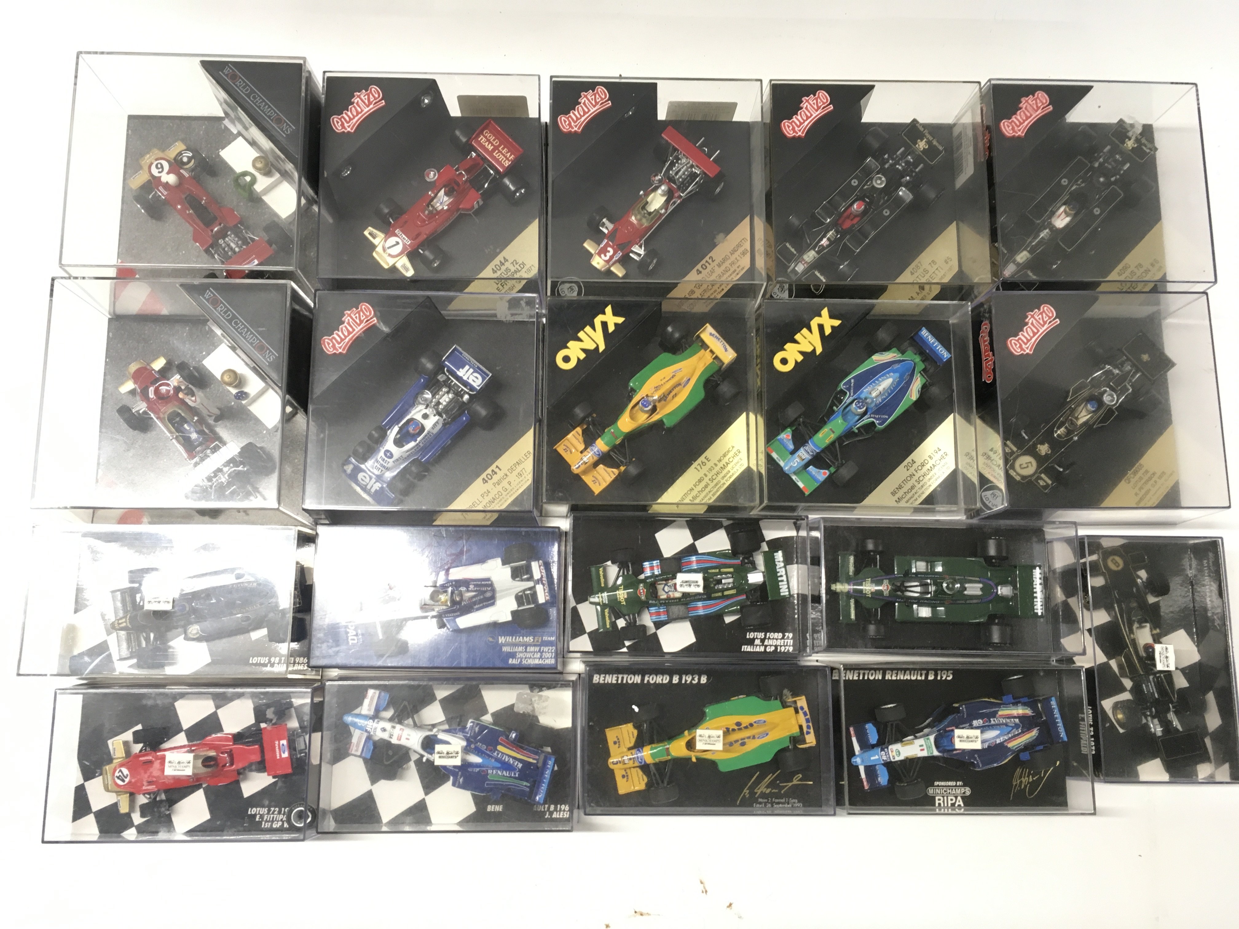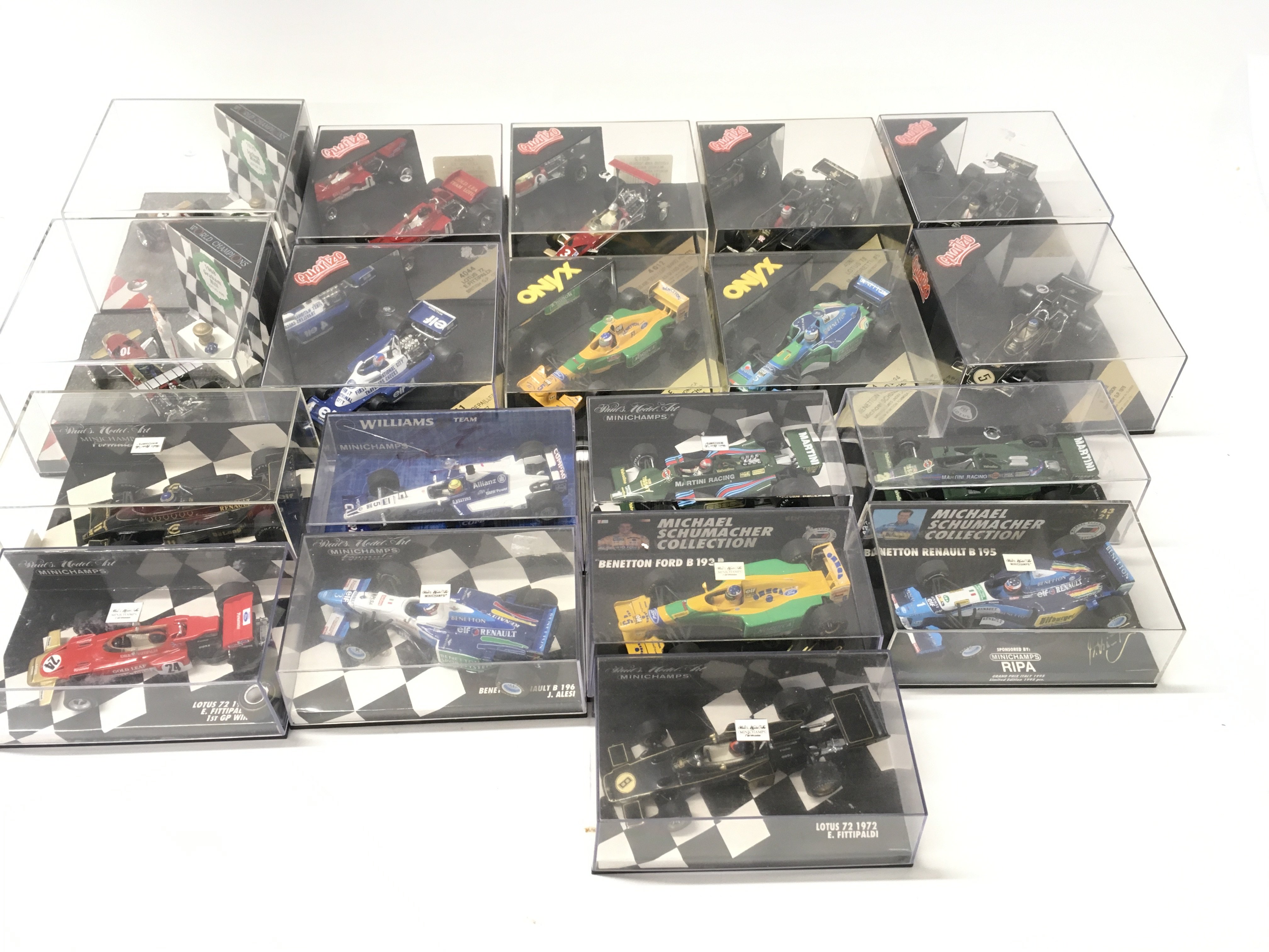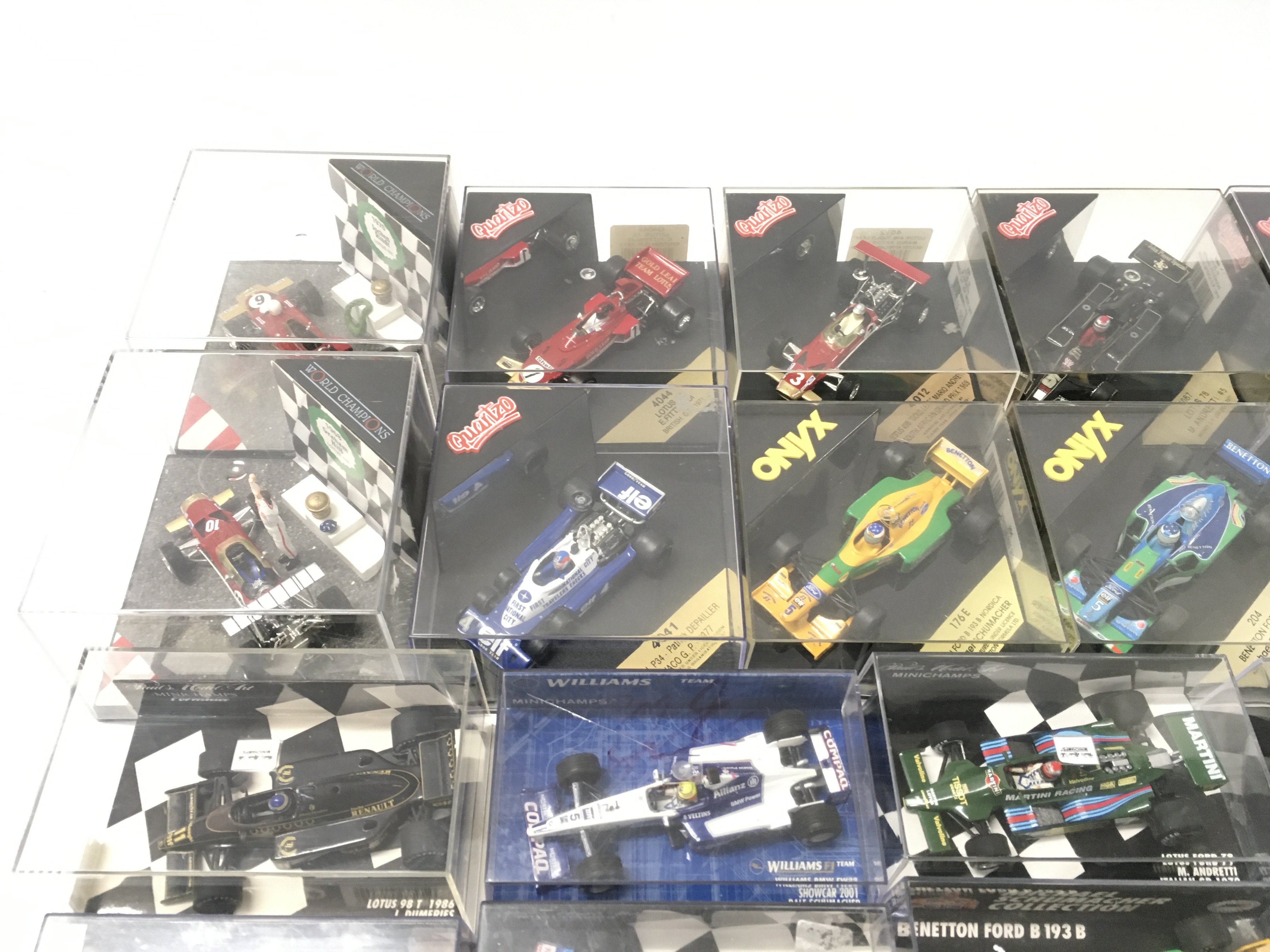 A collection of 19 model F1 racing call all in display boxes.