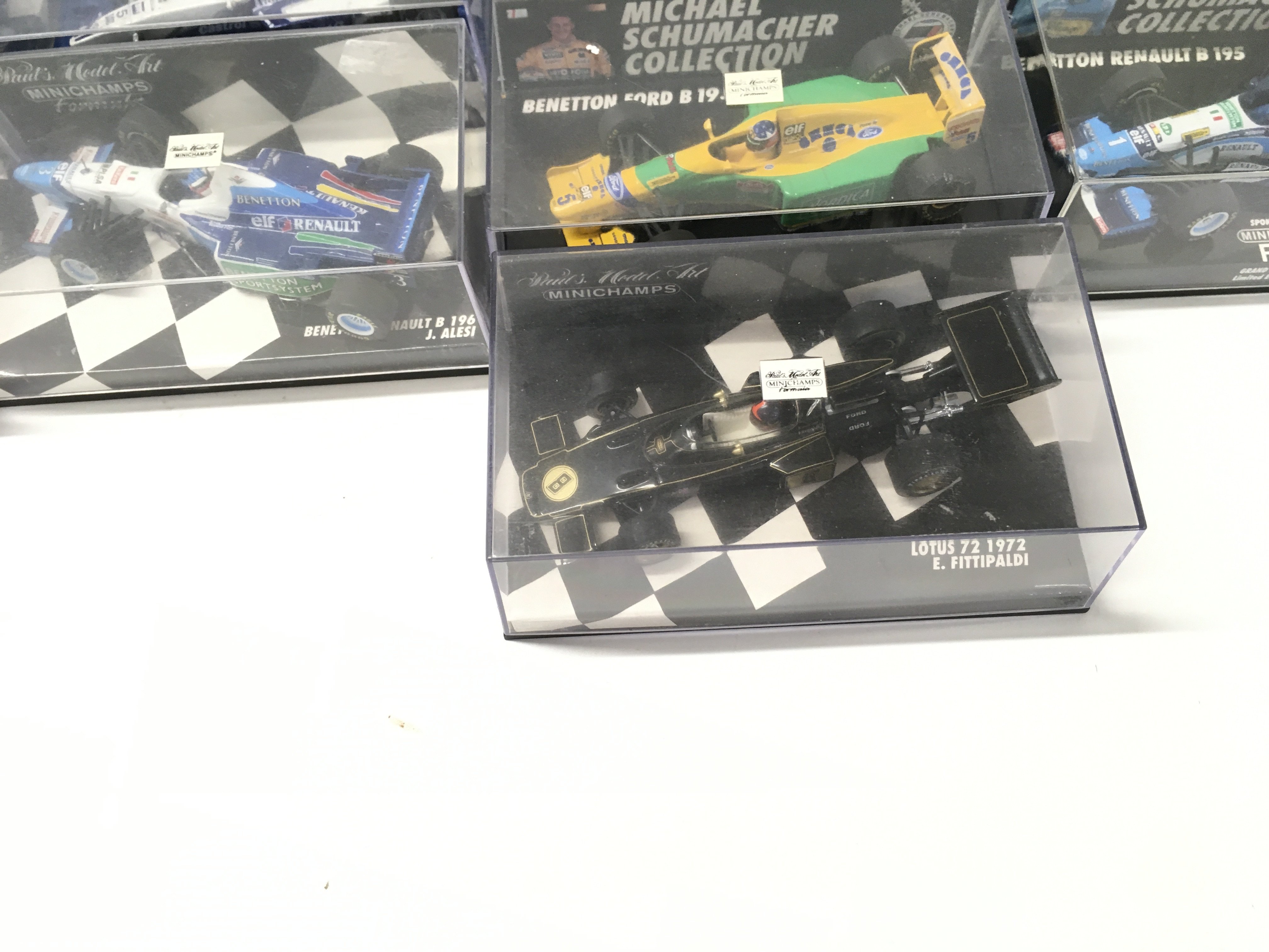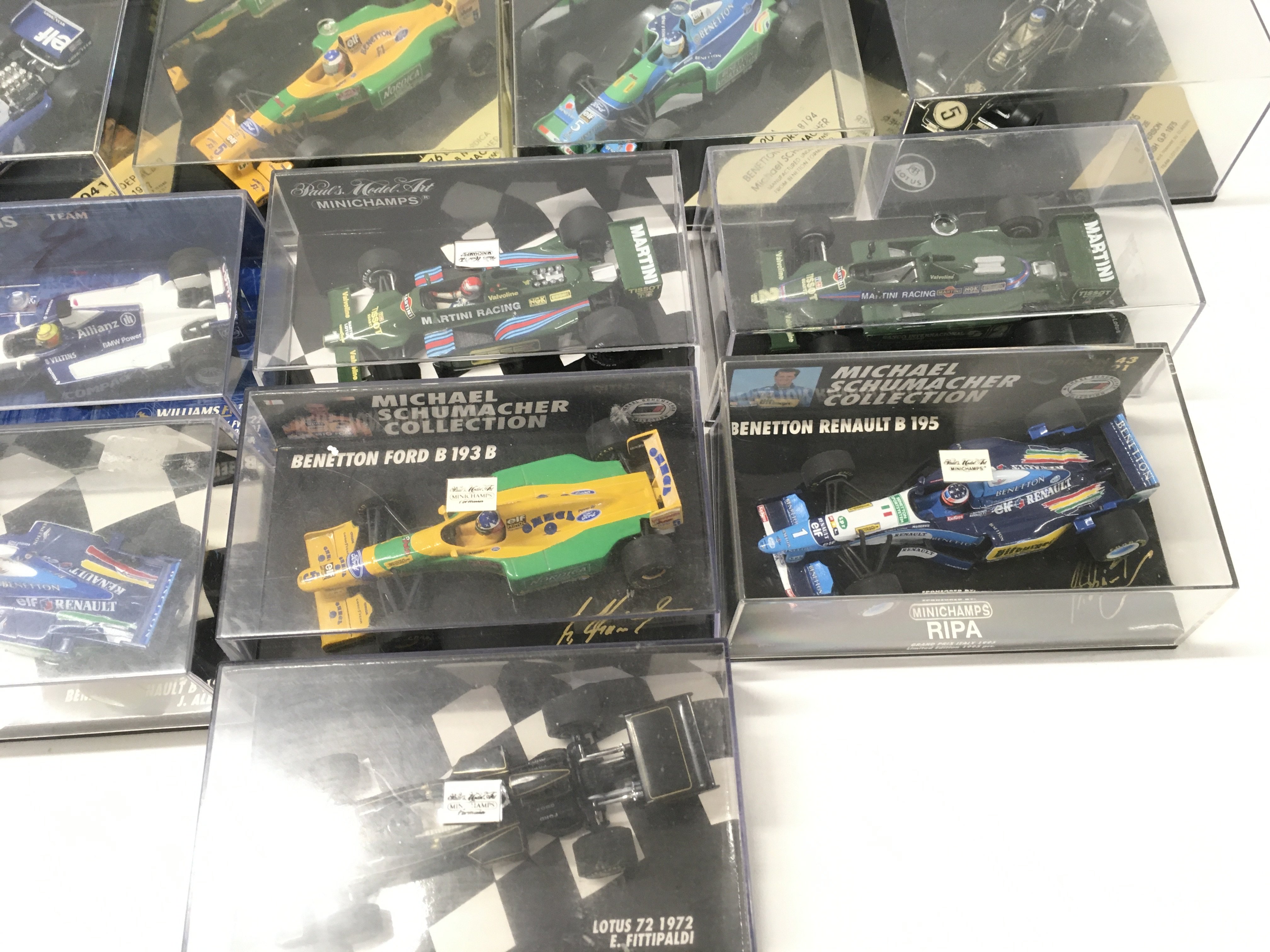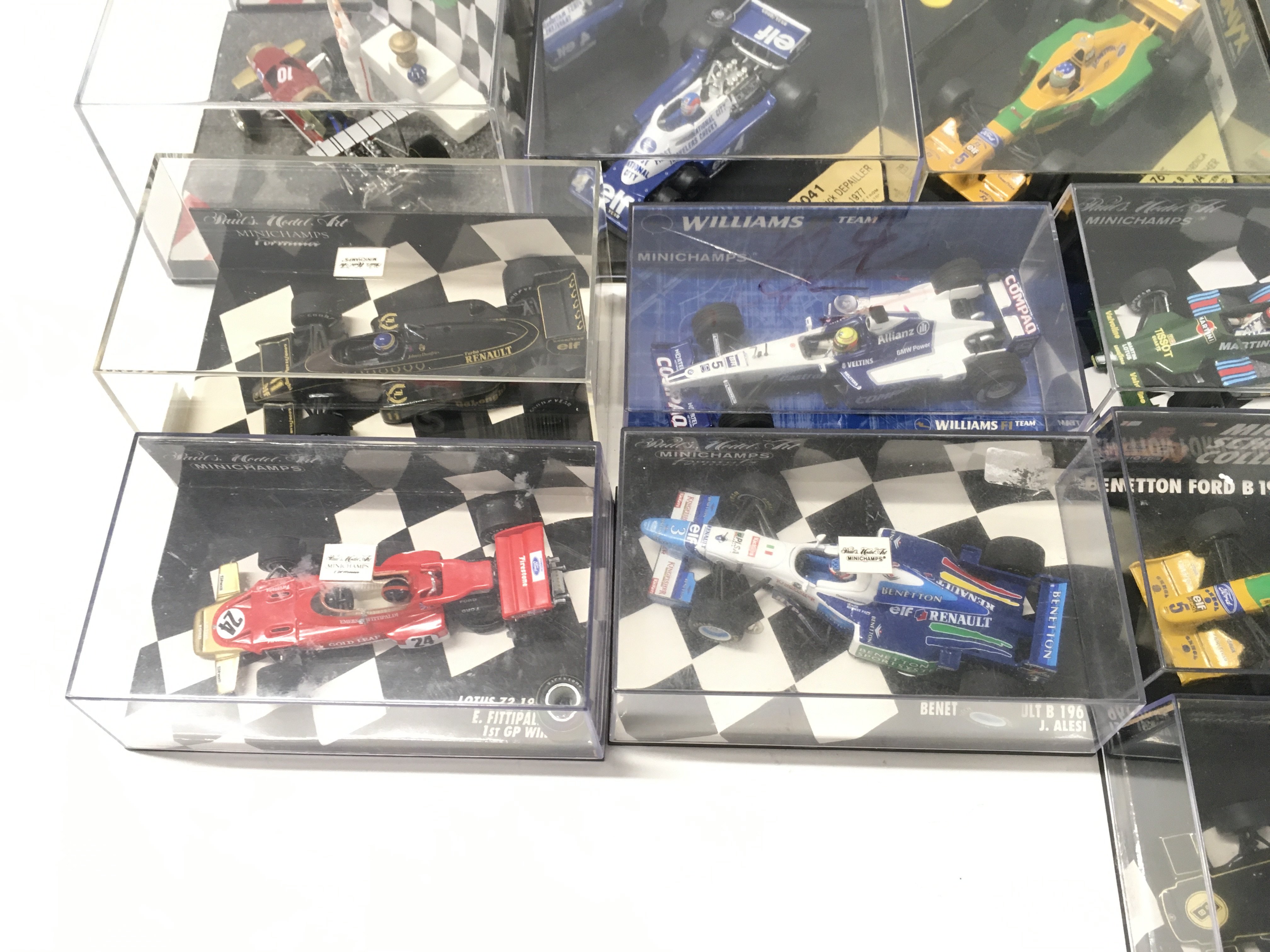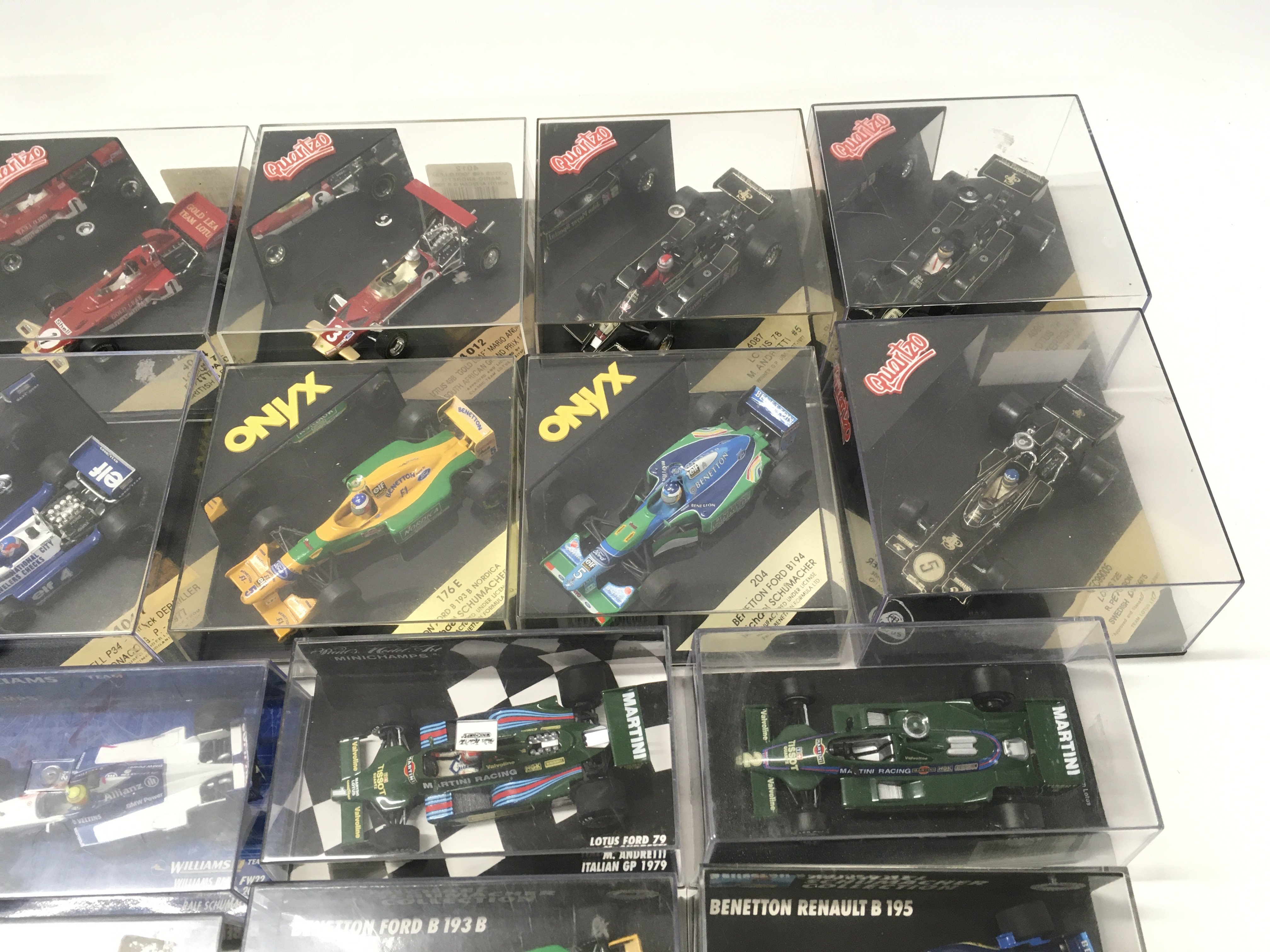 A collection of 19 model F1 racing call all in display boxes.
