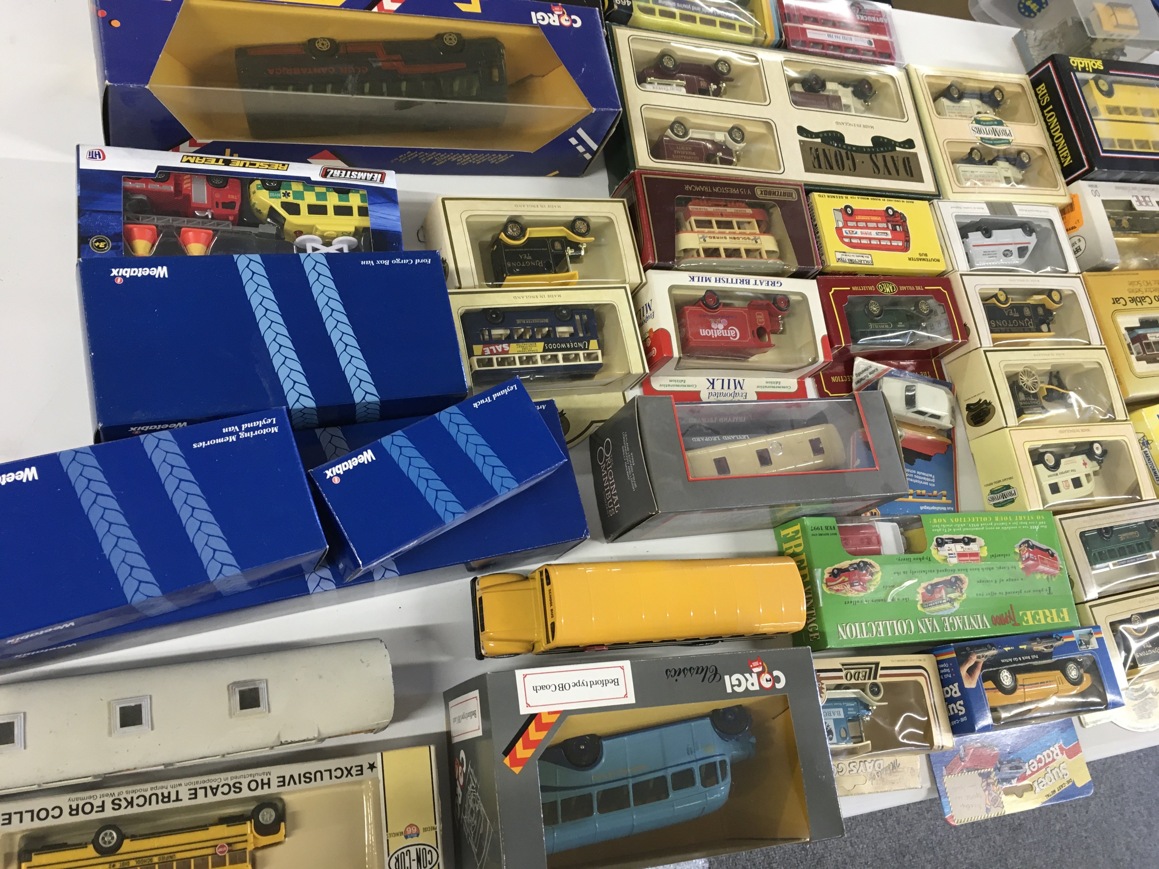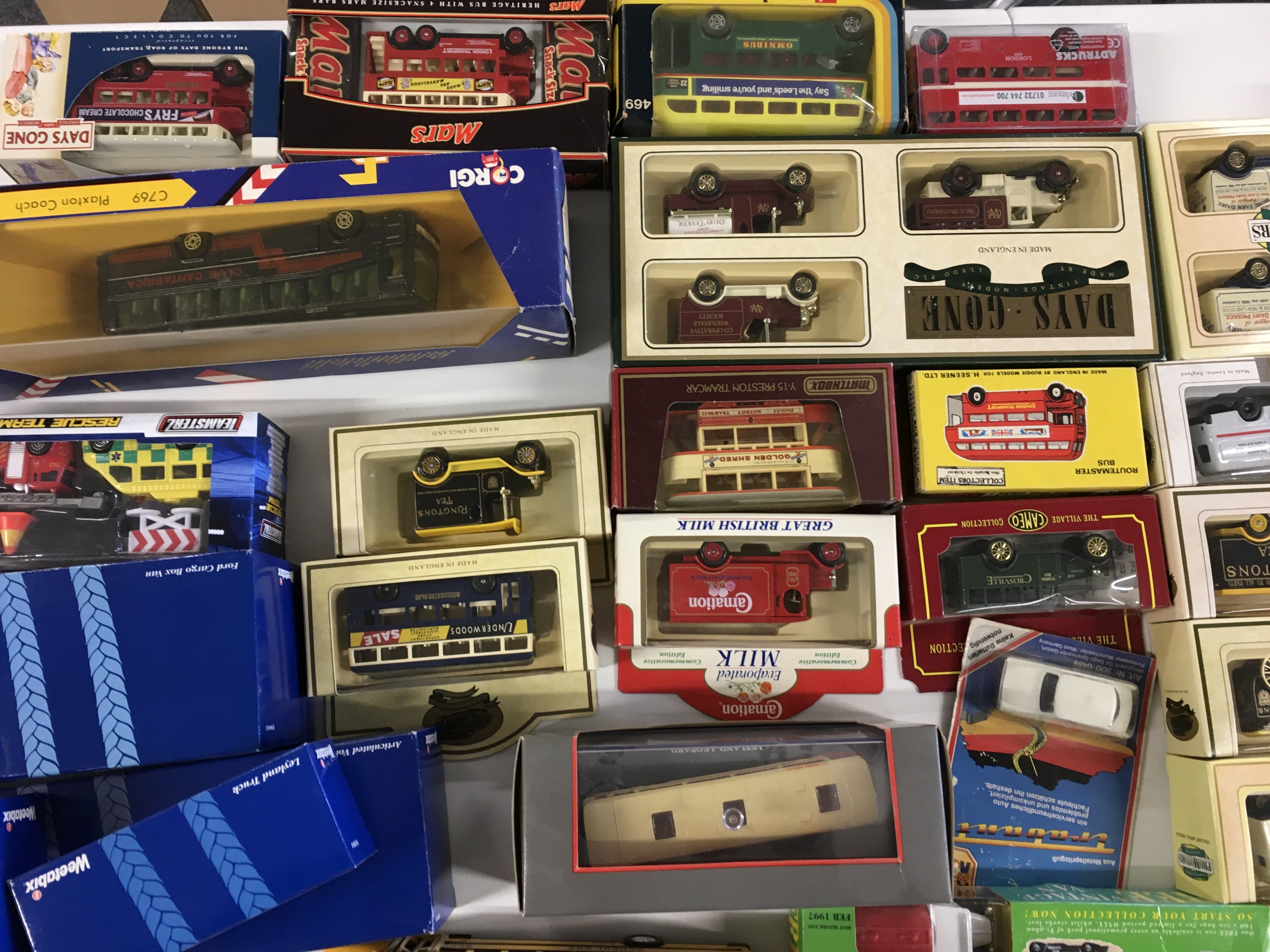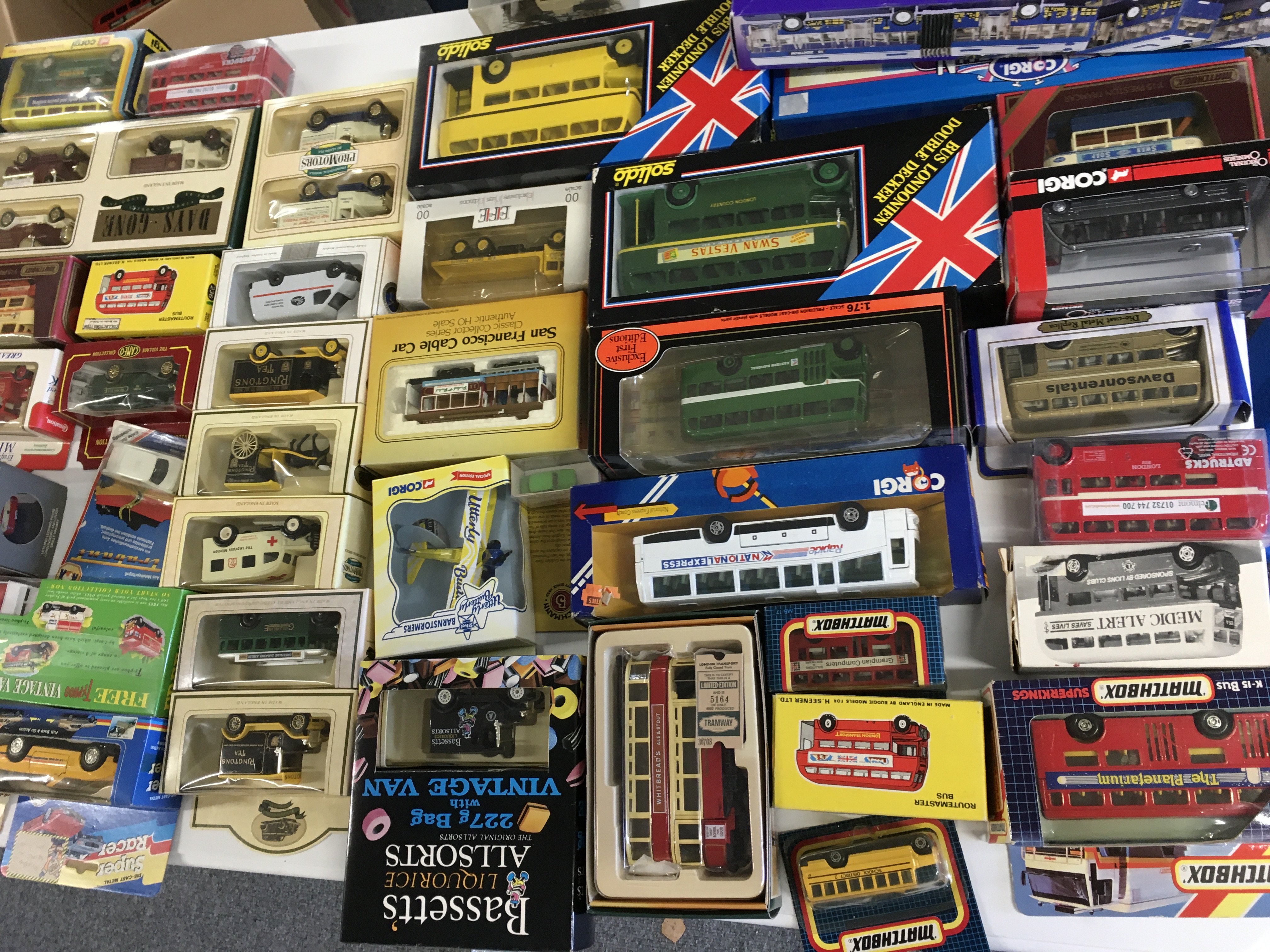 A collection in excess of 50 model vehicles including buses.cars and commercial mostly boxed in the original packaging.