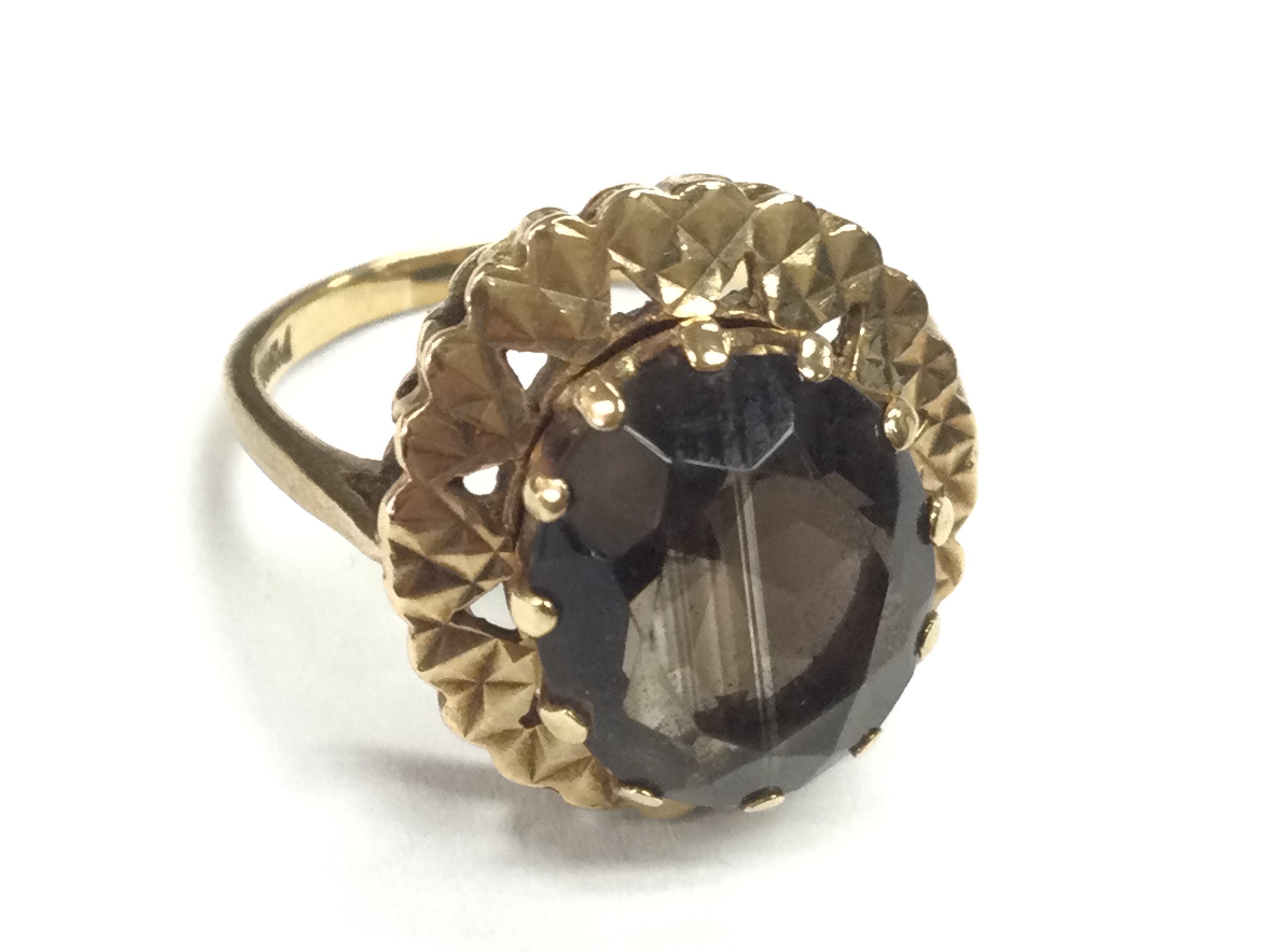 A 9ct gold ring set with a smoked quartz stone , size O. 5.1g Postage category A