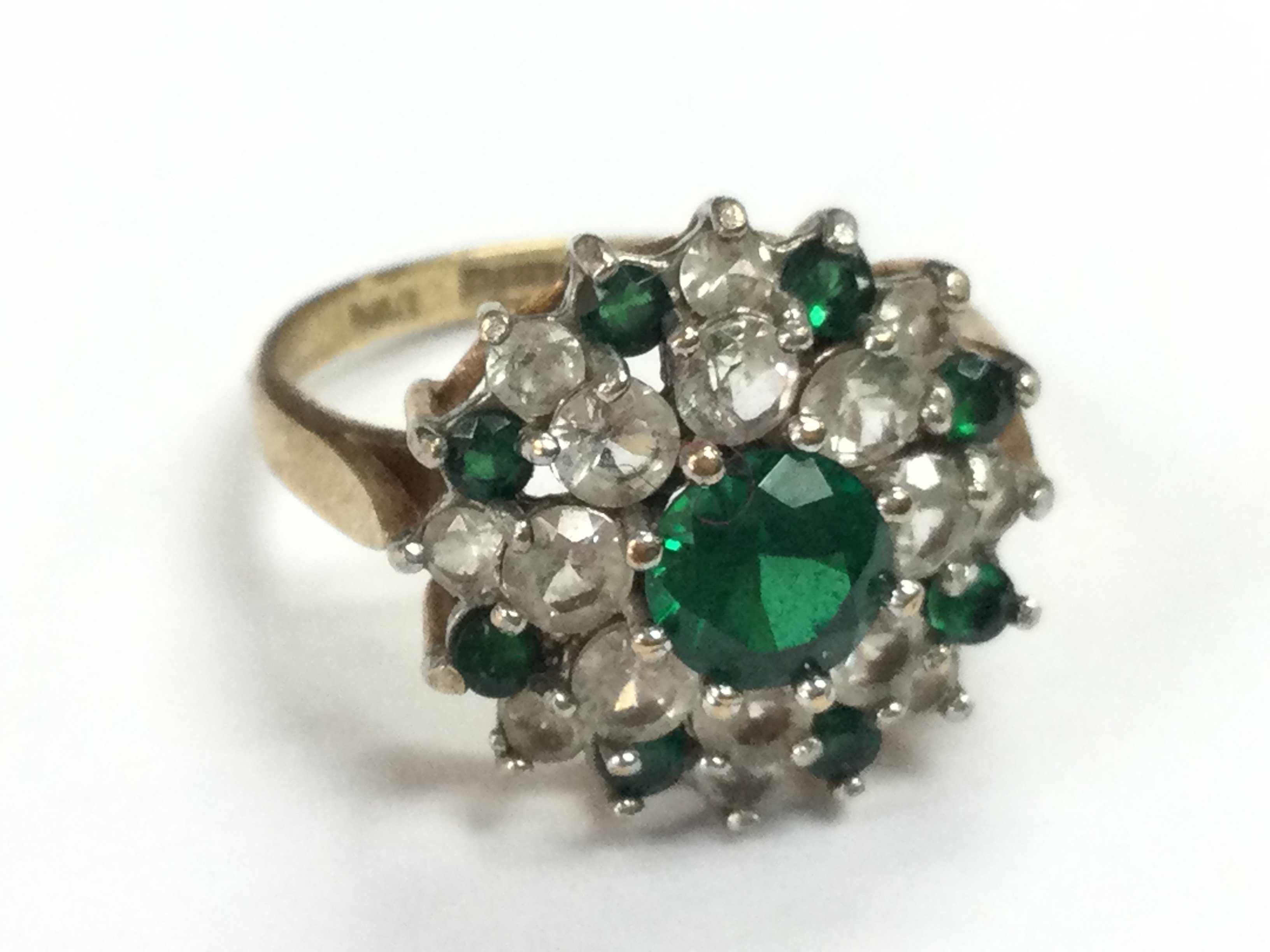 A 9ct gold ring set with green stones and simulated diamonds , size M. 3g total weight. Postage category A