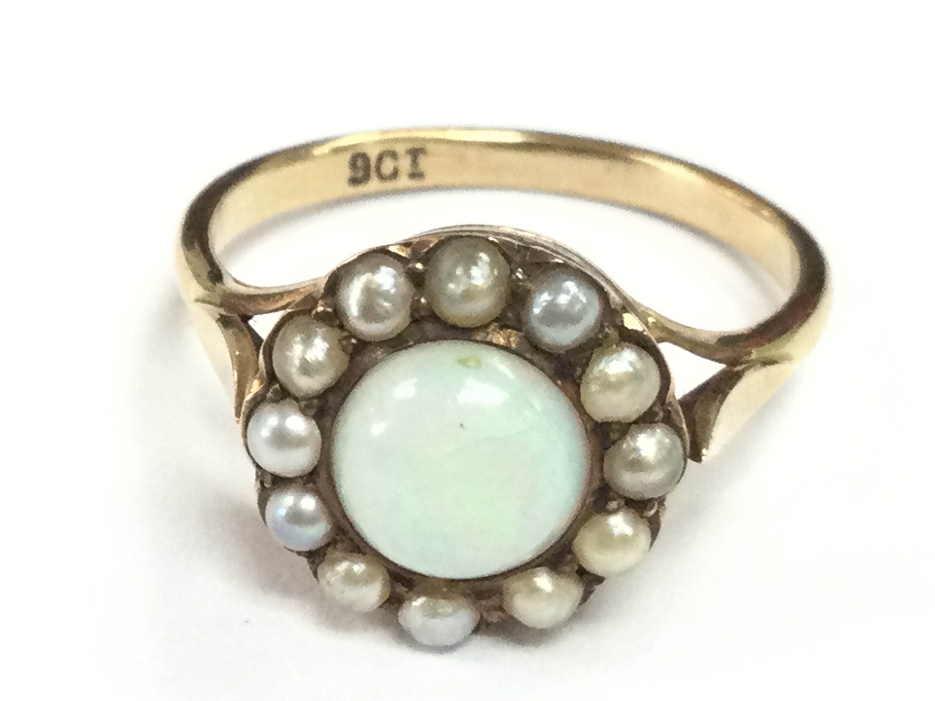 A 9ct gold opal and seed pearl set ring, total weight 3.4g . Size Q. Postage category A