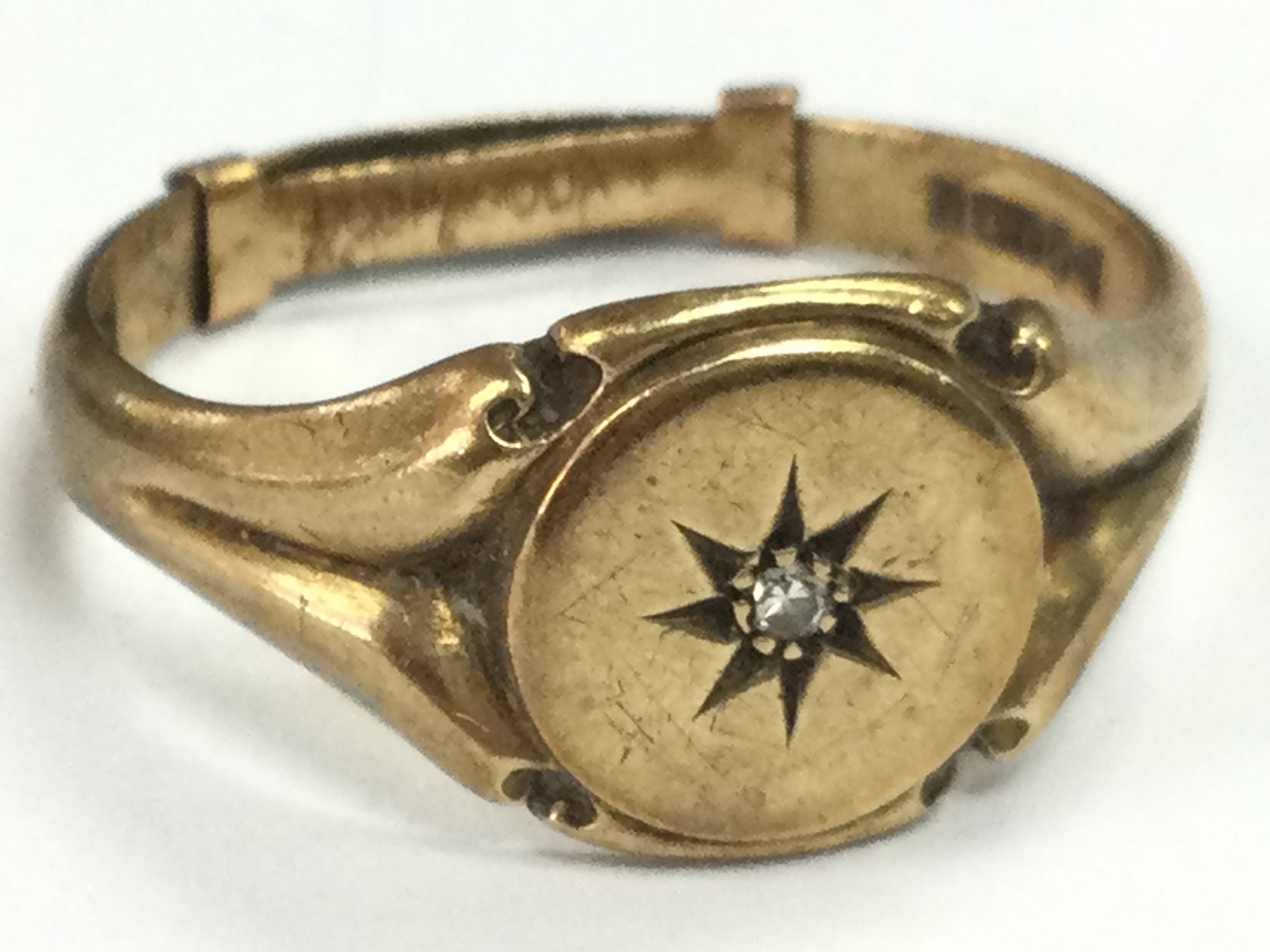 A Gents 9ct gold ring set with a small diamond , size 2. 6.2g Postage cat A