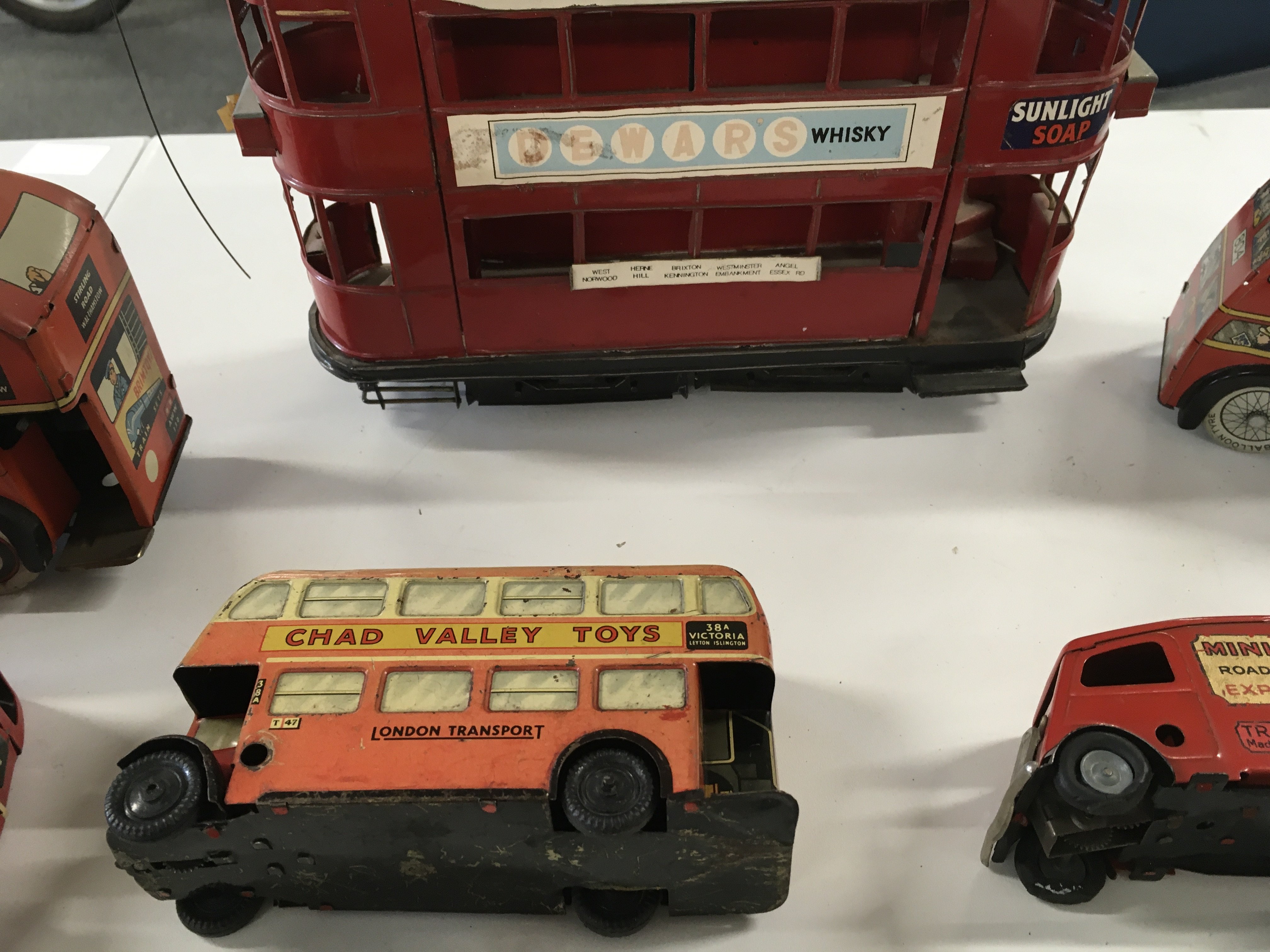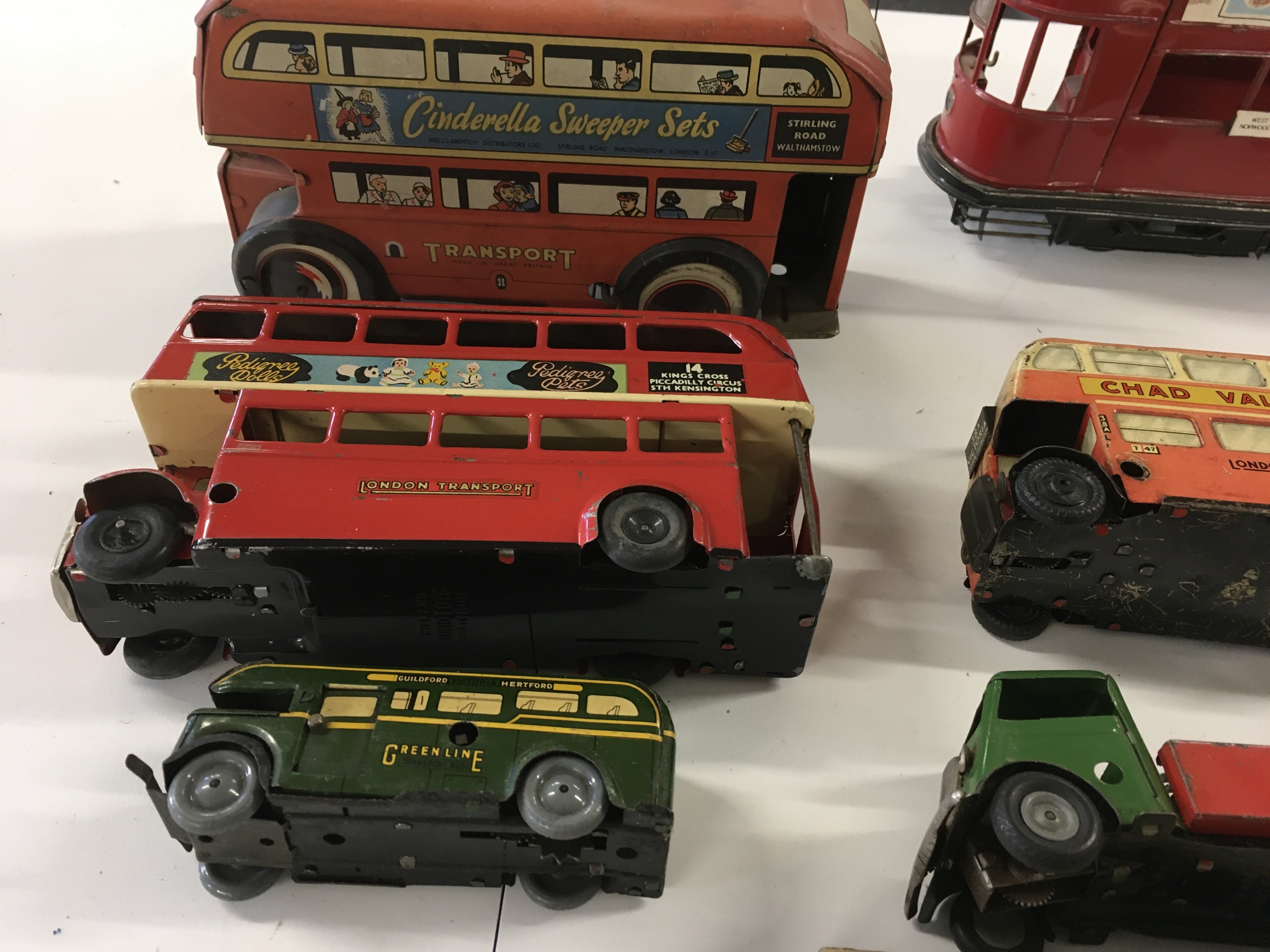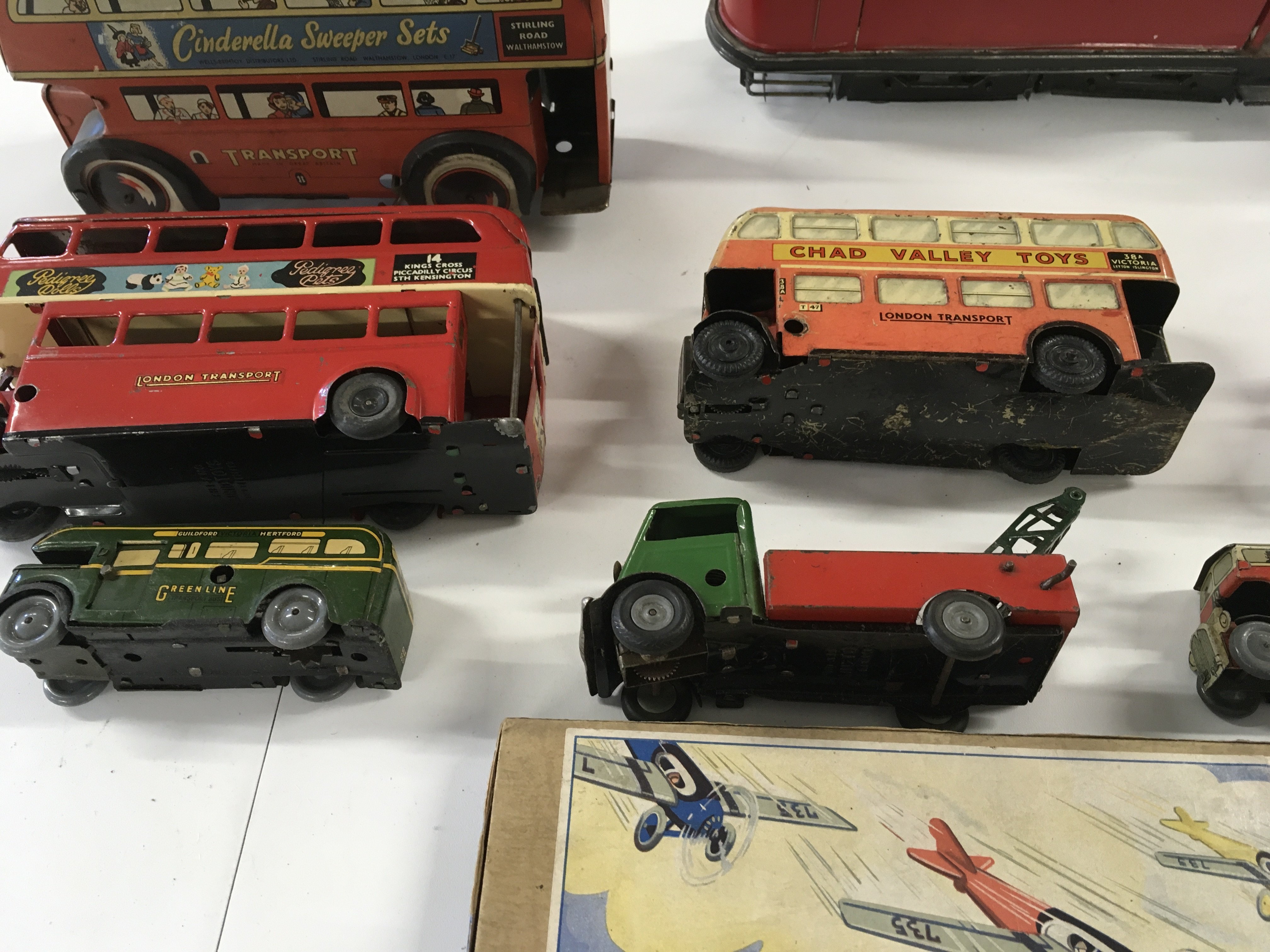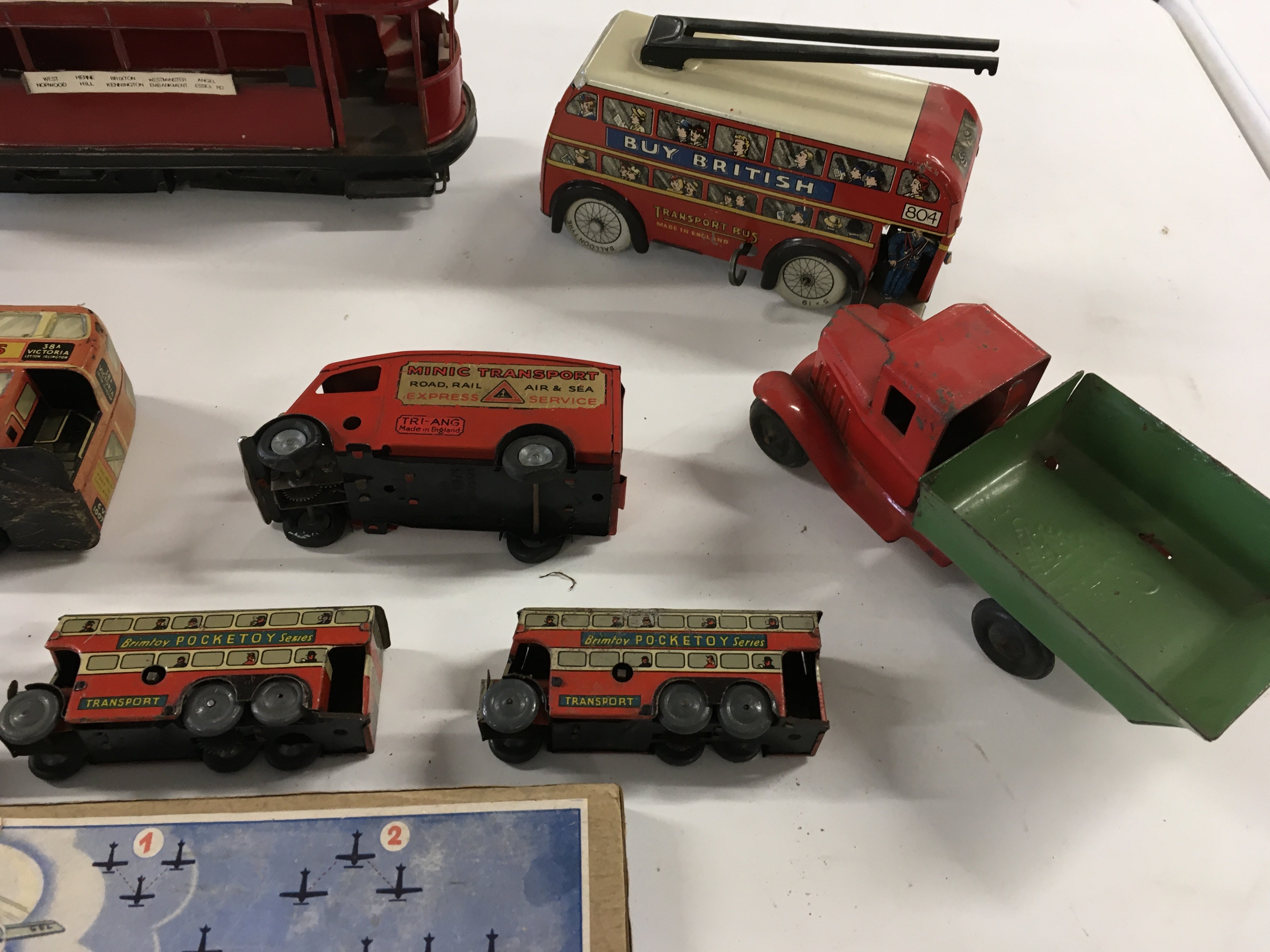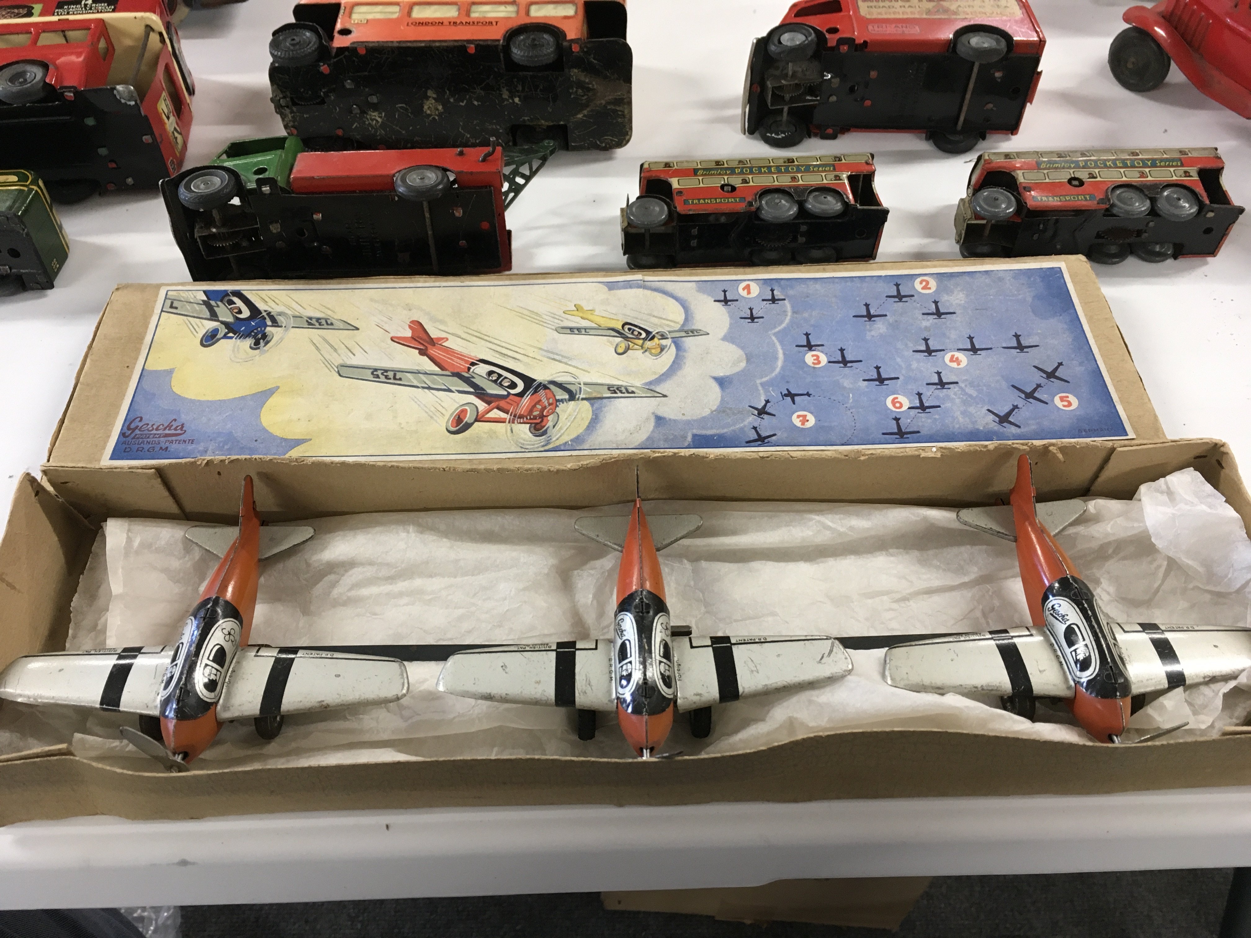 A collection of mainly clockwork tin plate toys by various manufacturers including from Gescha DRGM.. Triang..Wells etc includes buses and a set of 3 formation flying planes. Some keys missing.