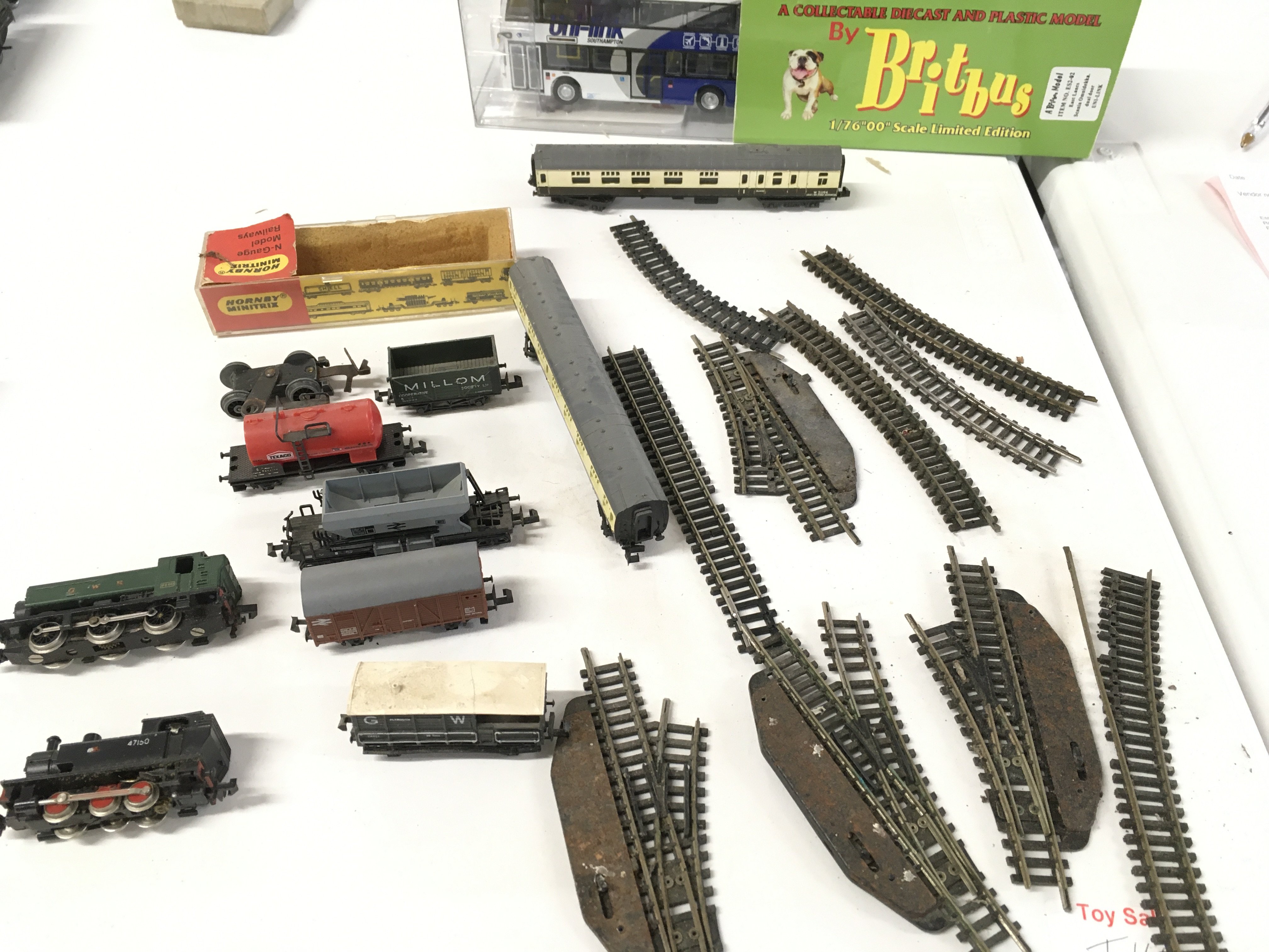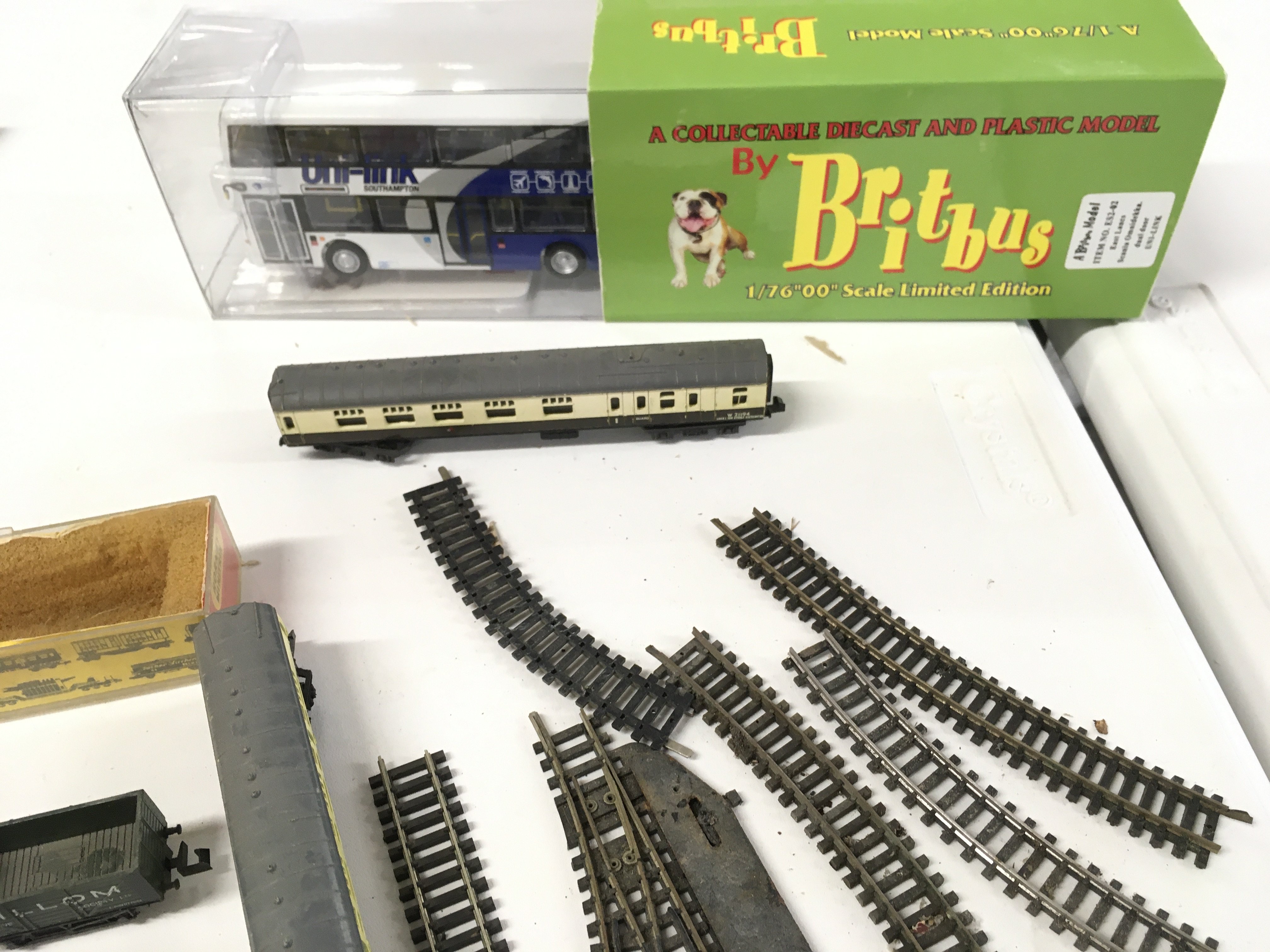 A collection oh n gauge track ..locos .wagons and coaches. Also a boxed Britbus Scalia