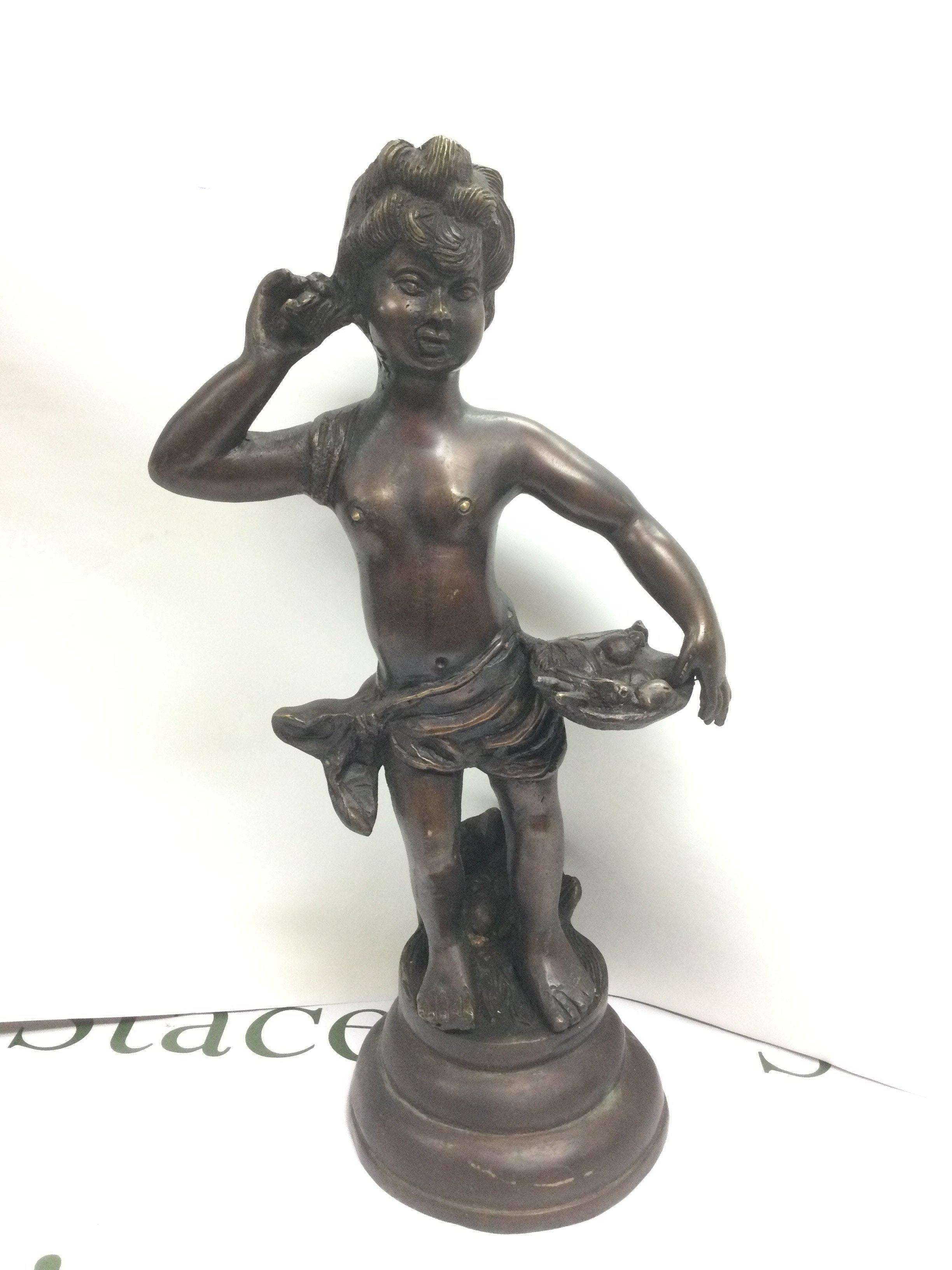 A bronzed figure of a young boy raised on a circular base, approx height 42cm. Shipping category D. NO RESERVE