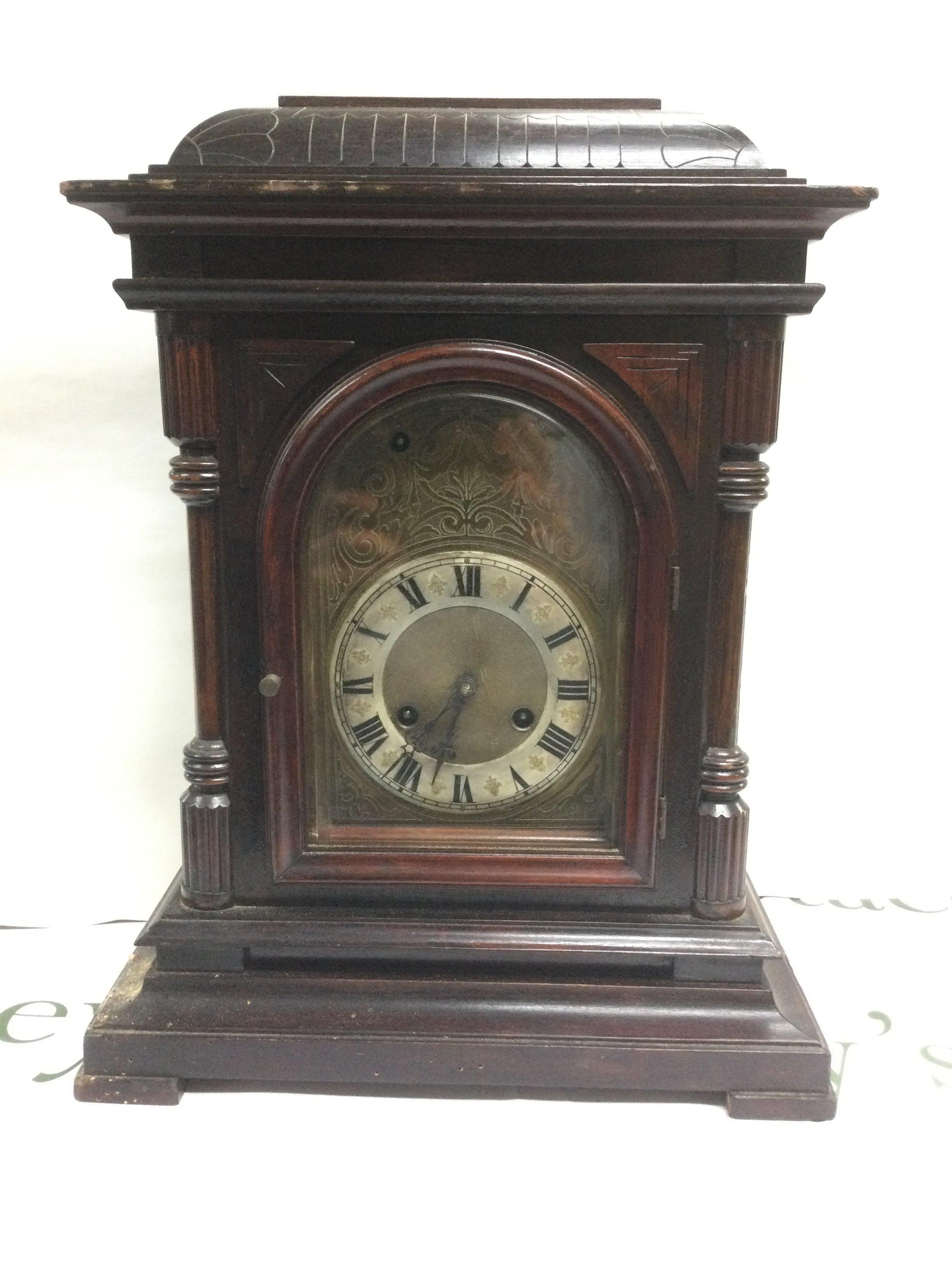 Two eight day mahogany cased mantle clocks with silvered dials. Shipping category D. NO RESERVE