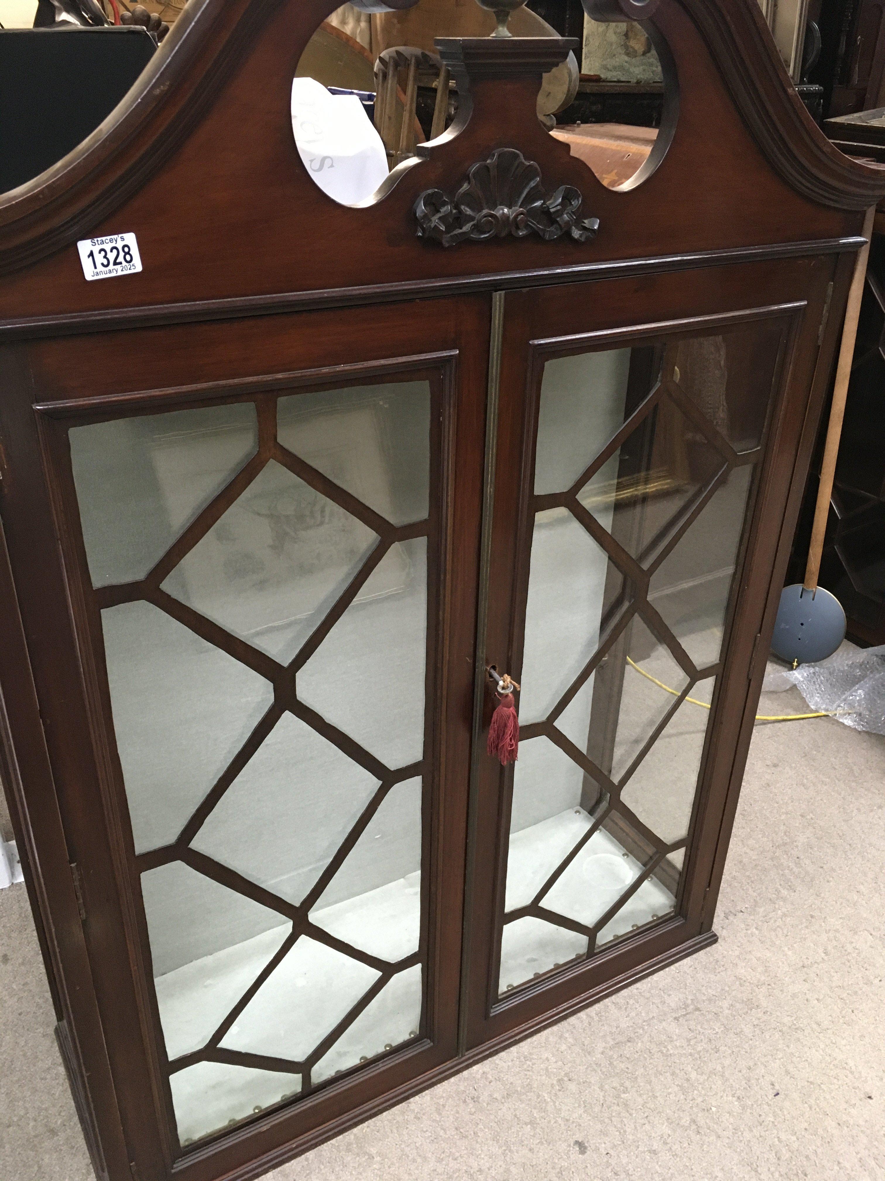 A mahogany display cabinet the swan neck pediment above a pair of glazed doors. NO RESERVE