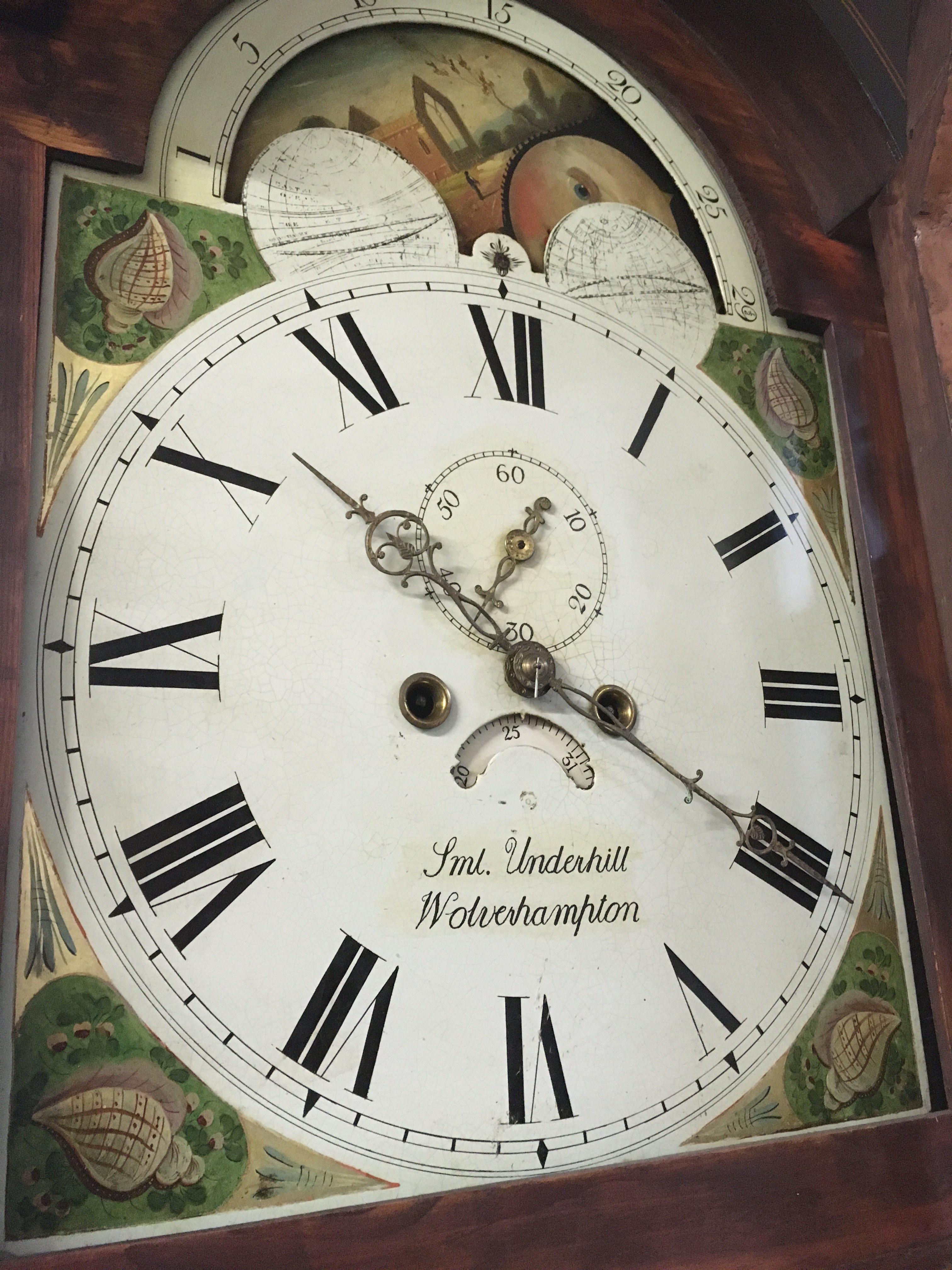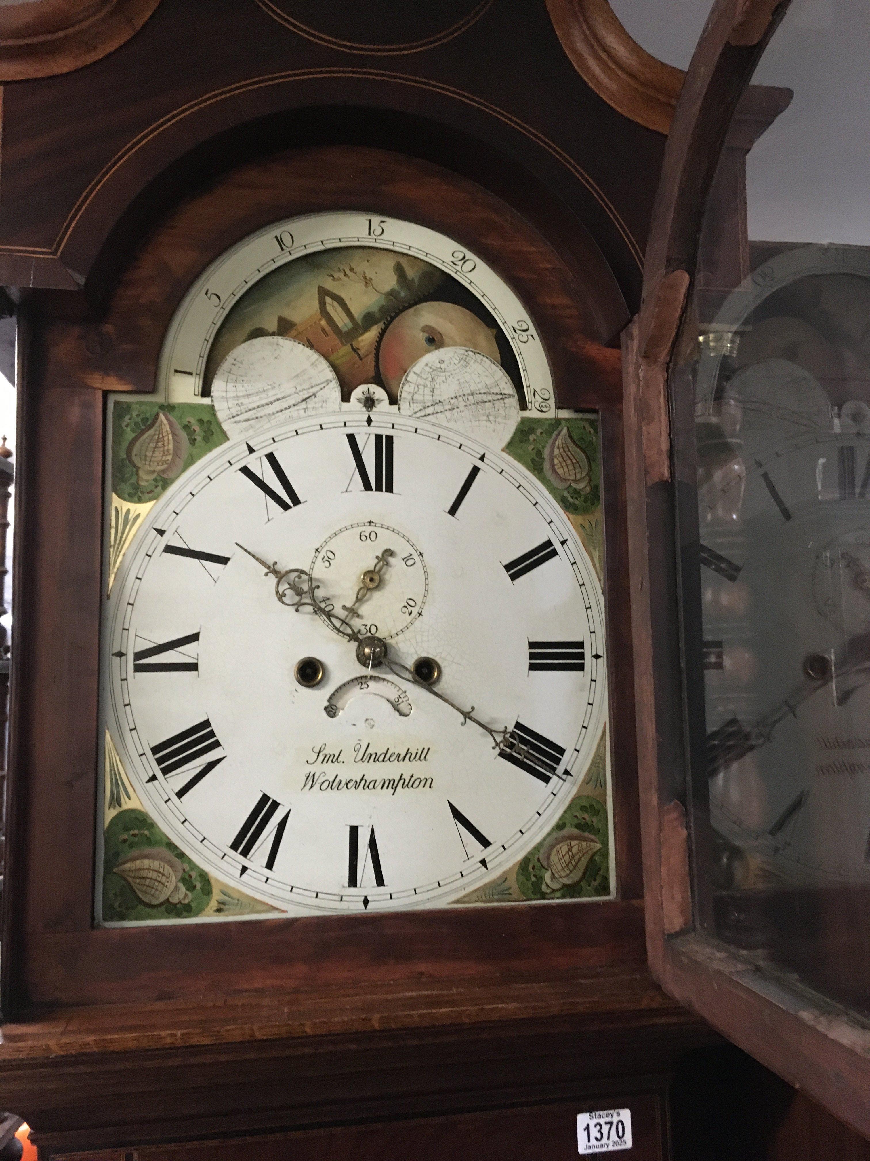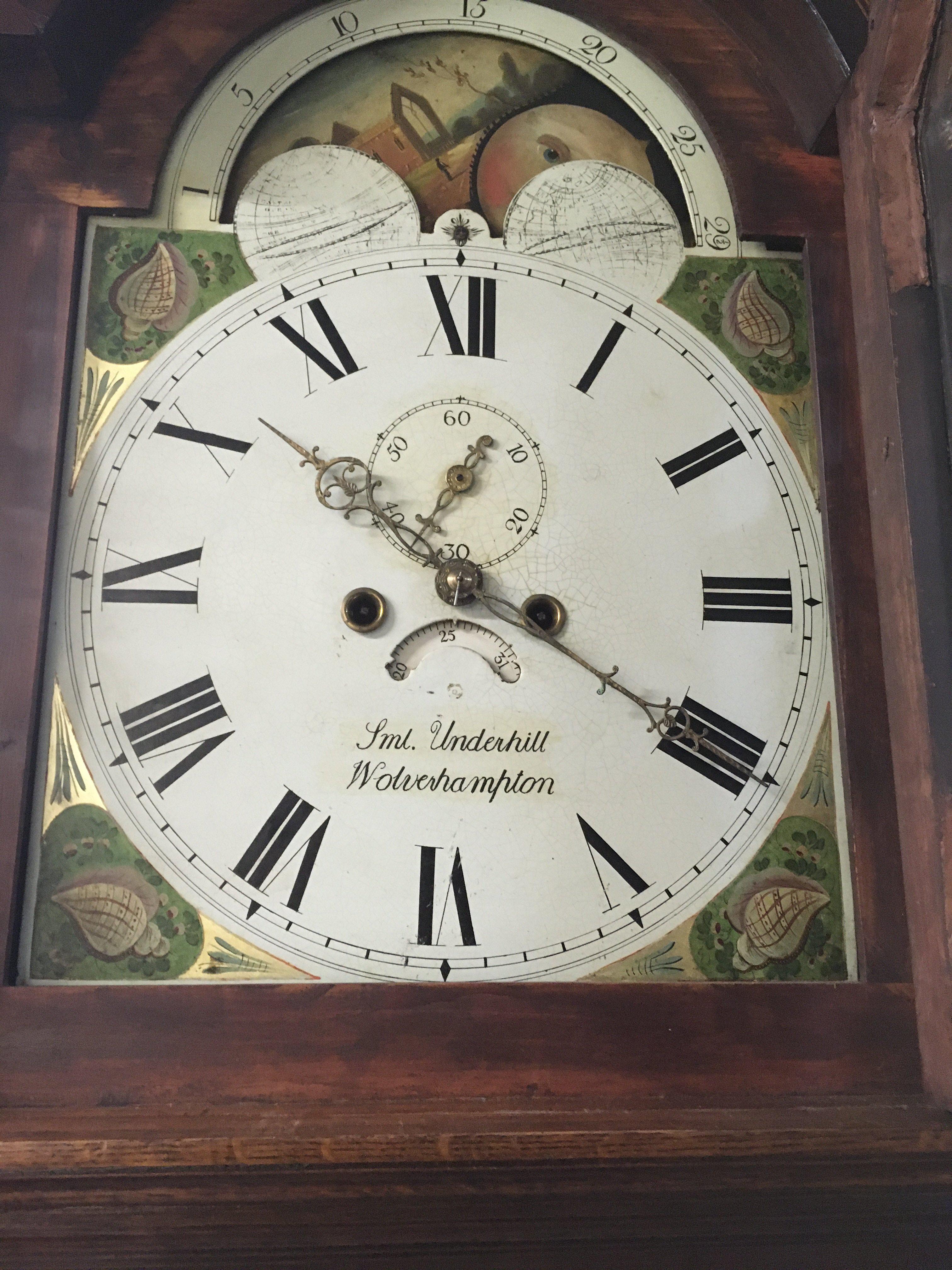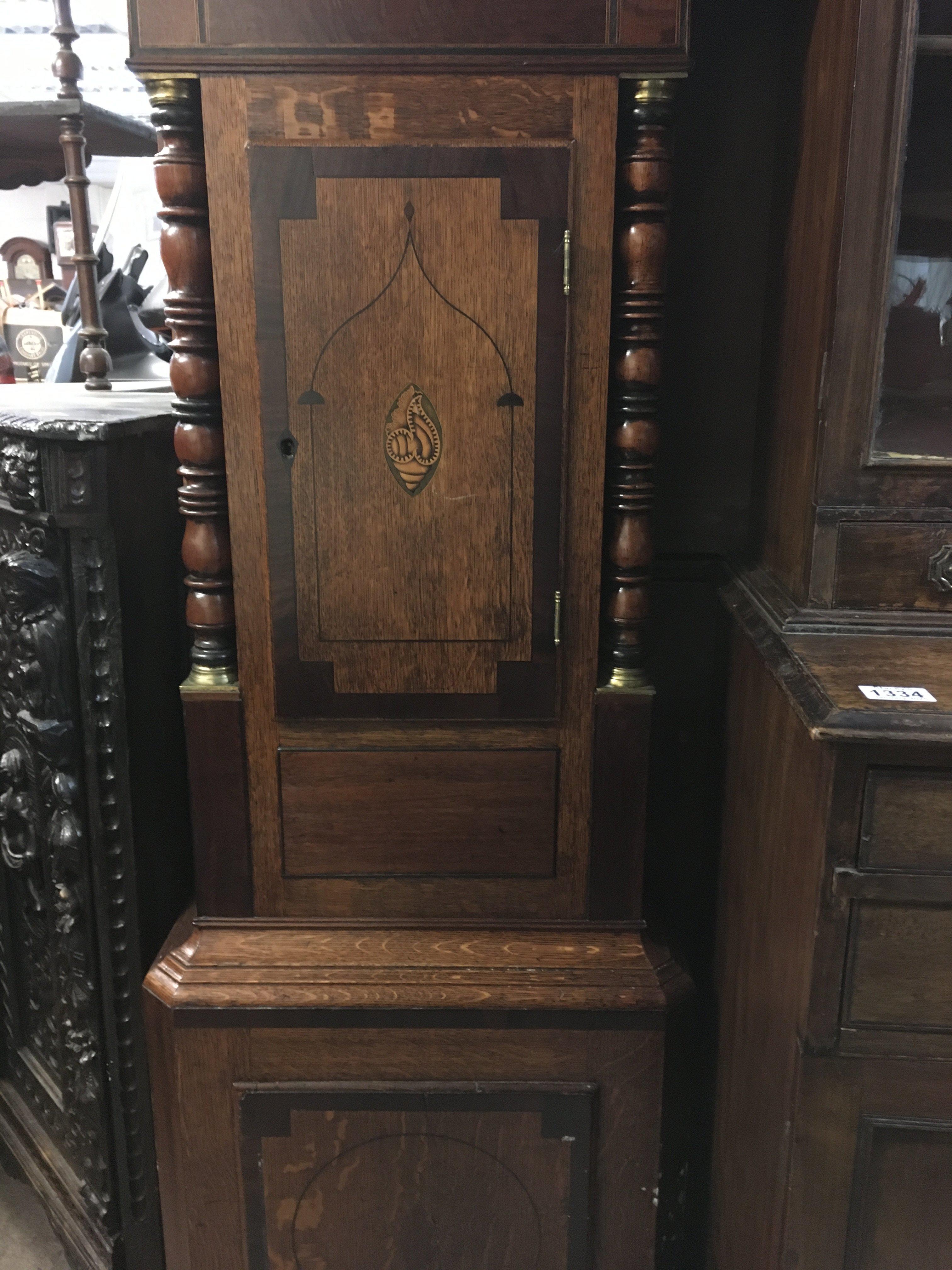 A oak long case clock the arched panted dial with moon roller Roman numerals and second dial . NO RESERVE