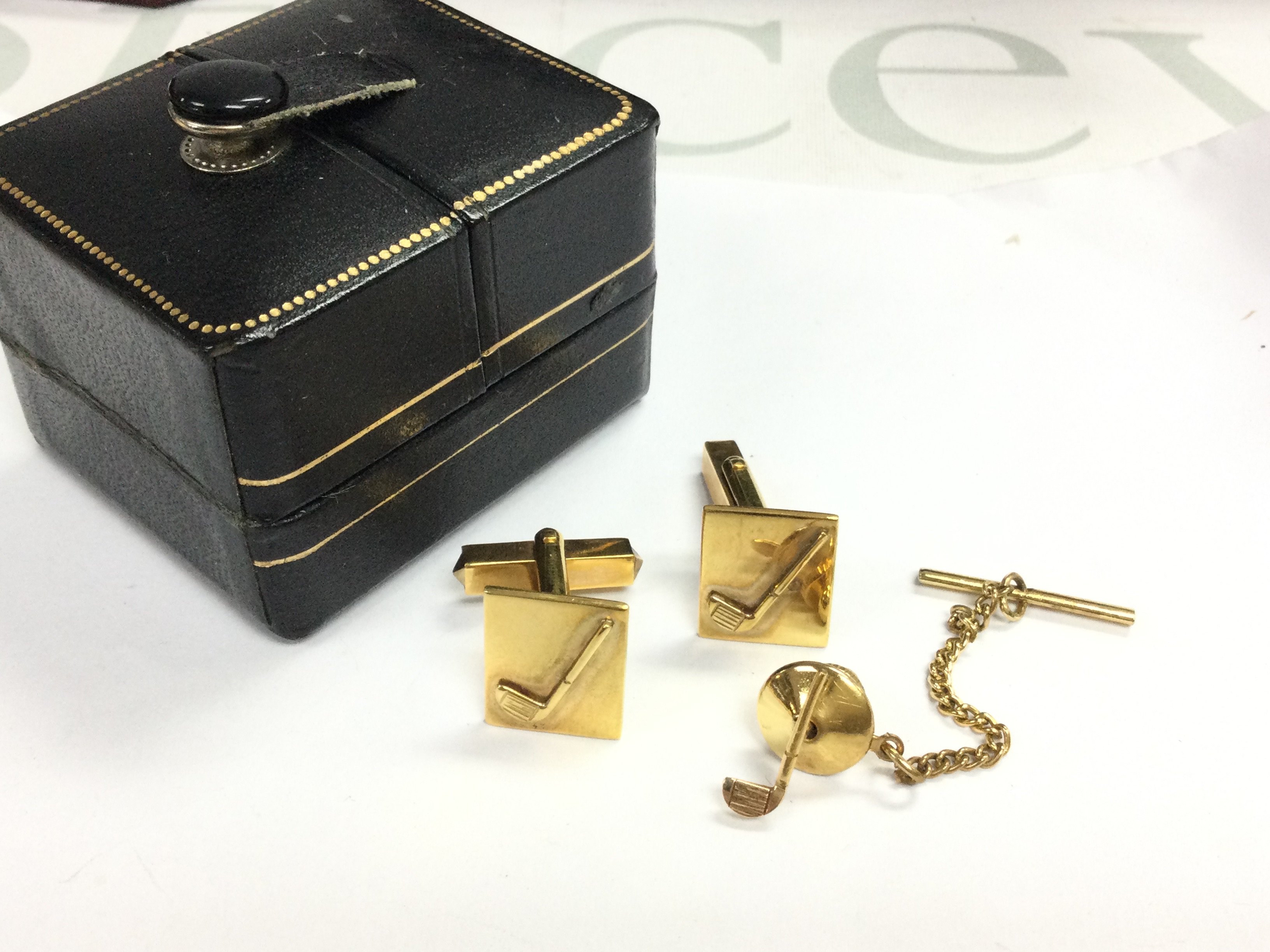 A pair of 9ct gold golf cufflinks and a 9ct gold tie pin. 11.4g total weight Postage category A