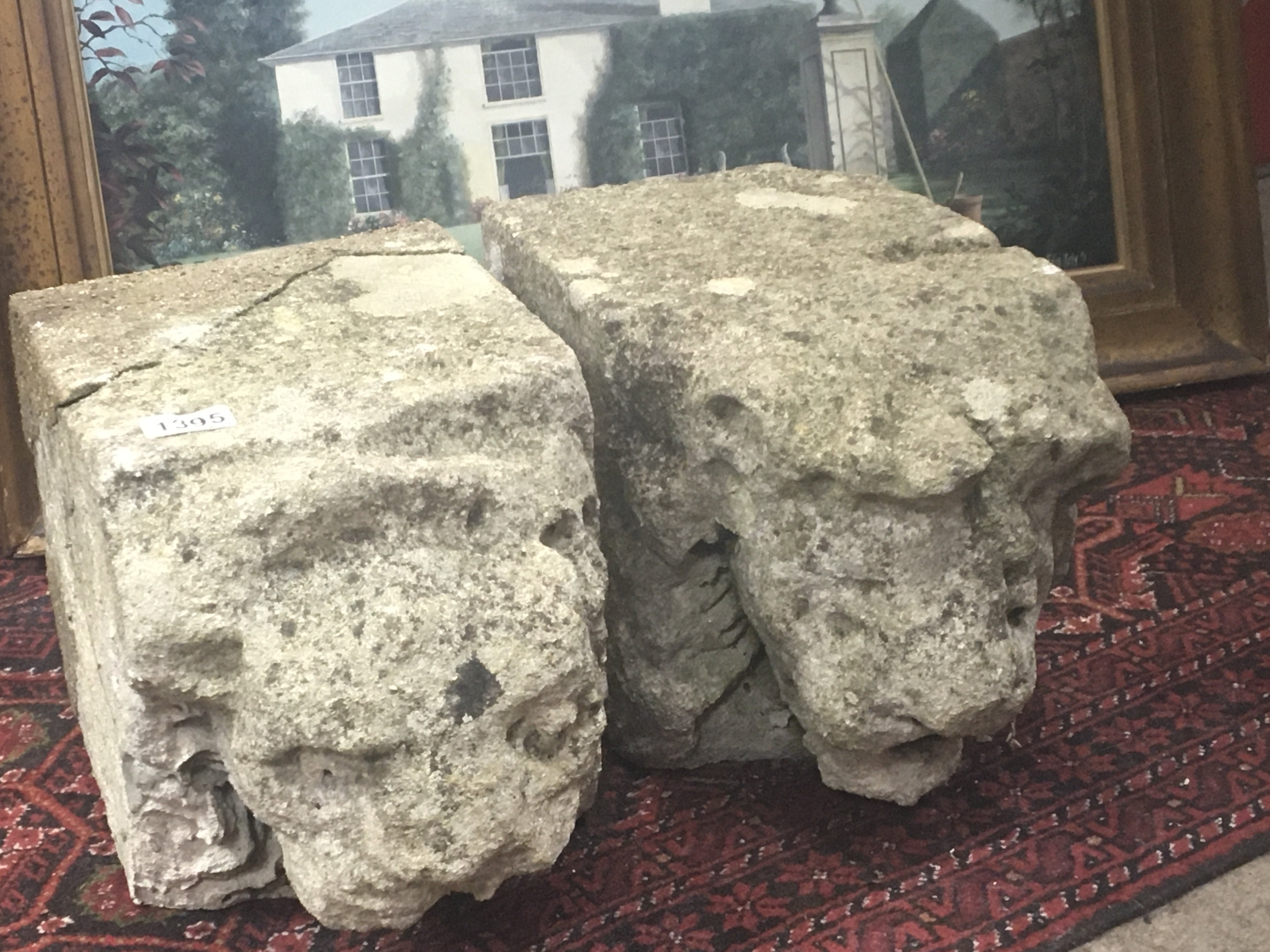 Two carved stone Ancient architectural Gargoyles the raised masks protruding from stone blocks.37x23 cm (2)