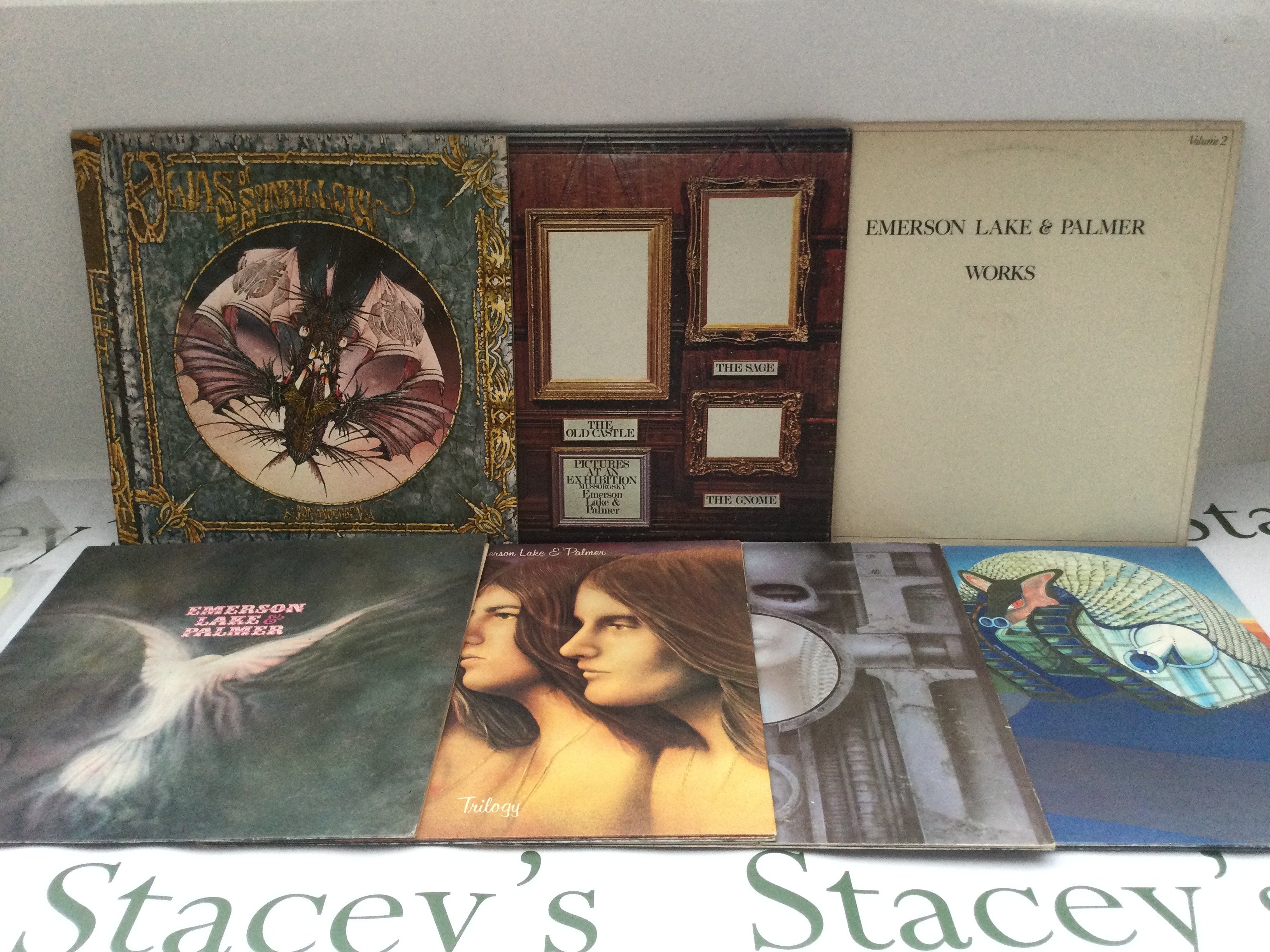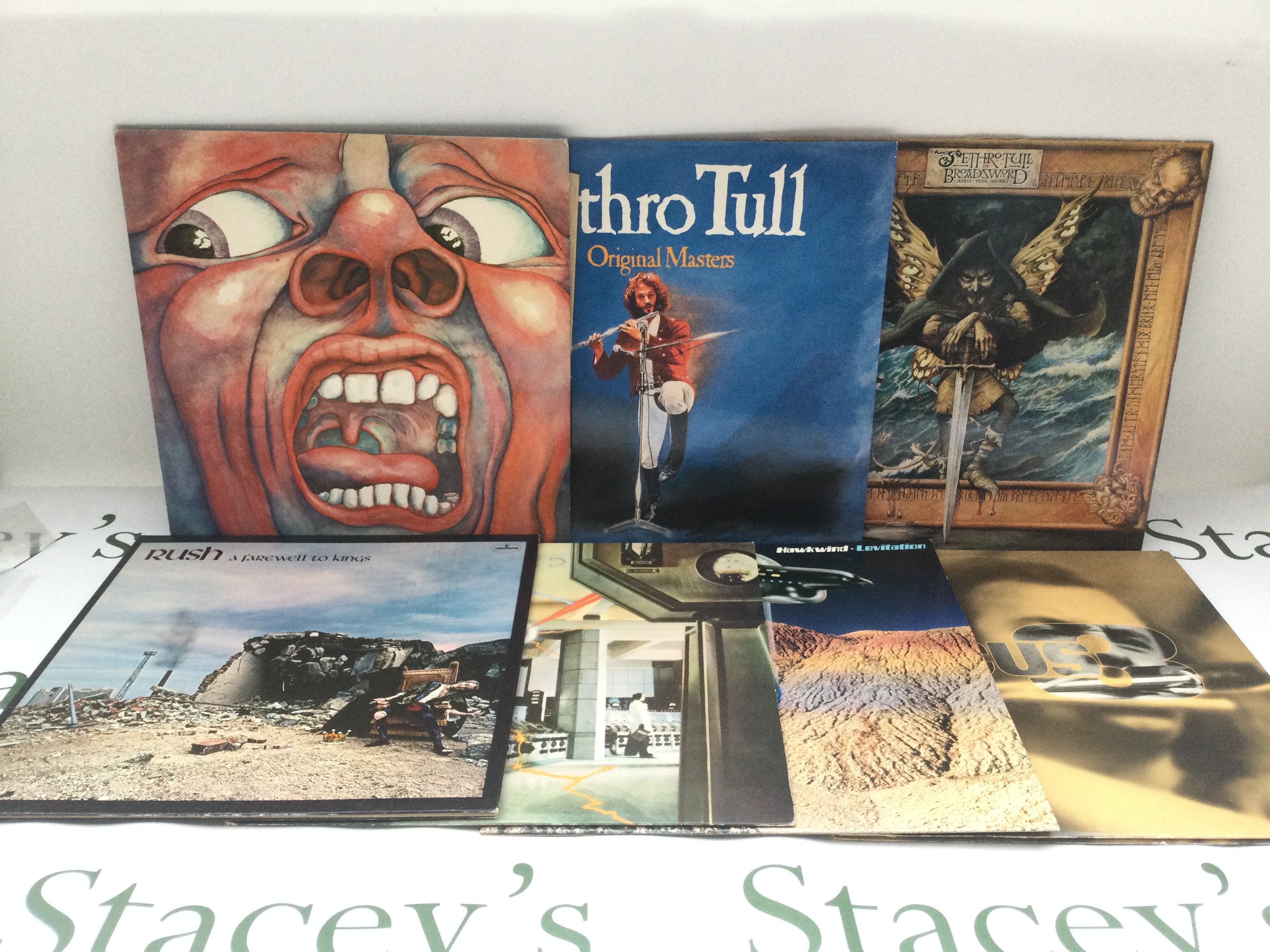 Fourteen rock and prog rock LPs by various artists including King Crimson (Polydor reissue), Rush, ELP and others.