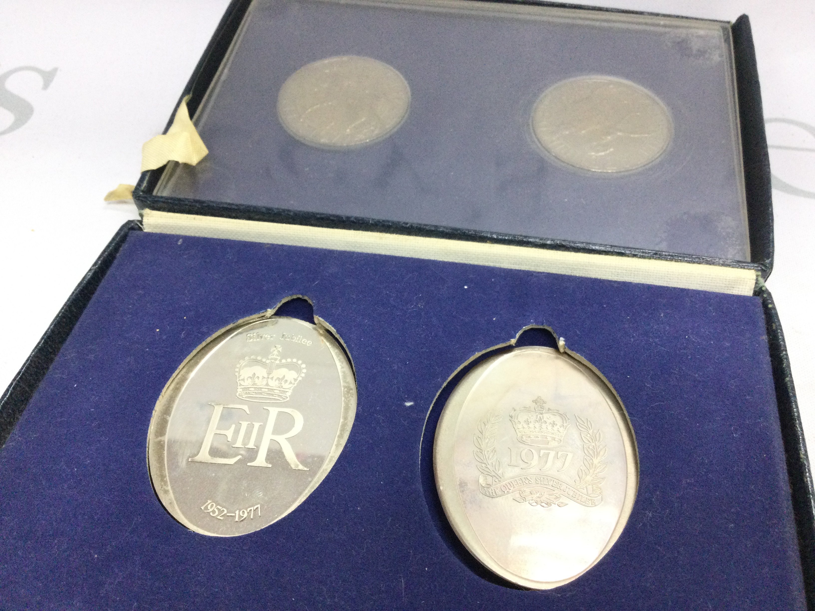 Two 1977 silver medallions and two nickel coins . Postage cat B