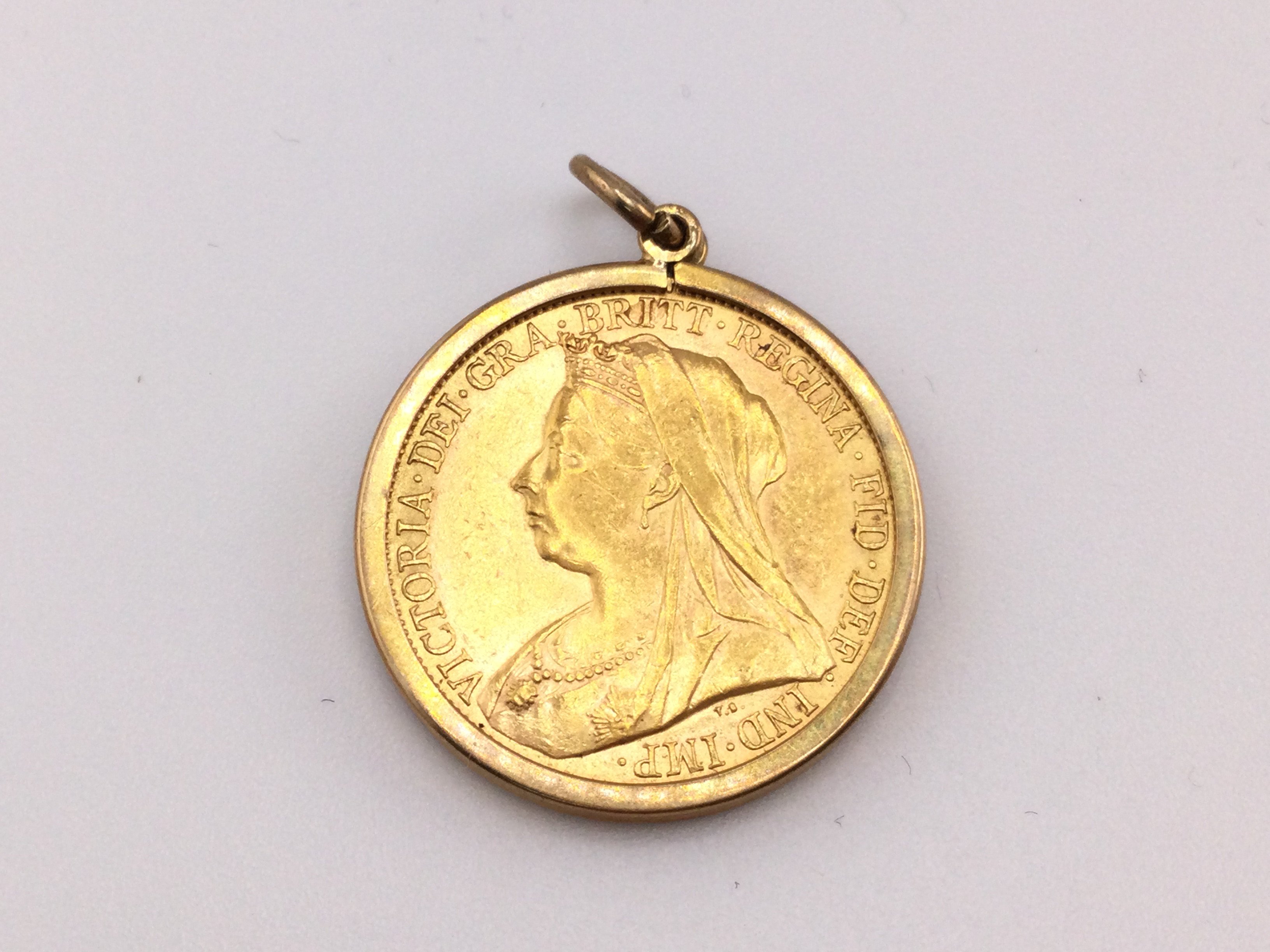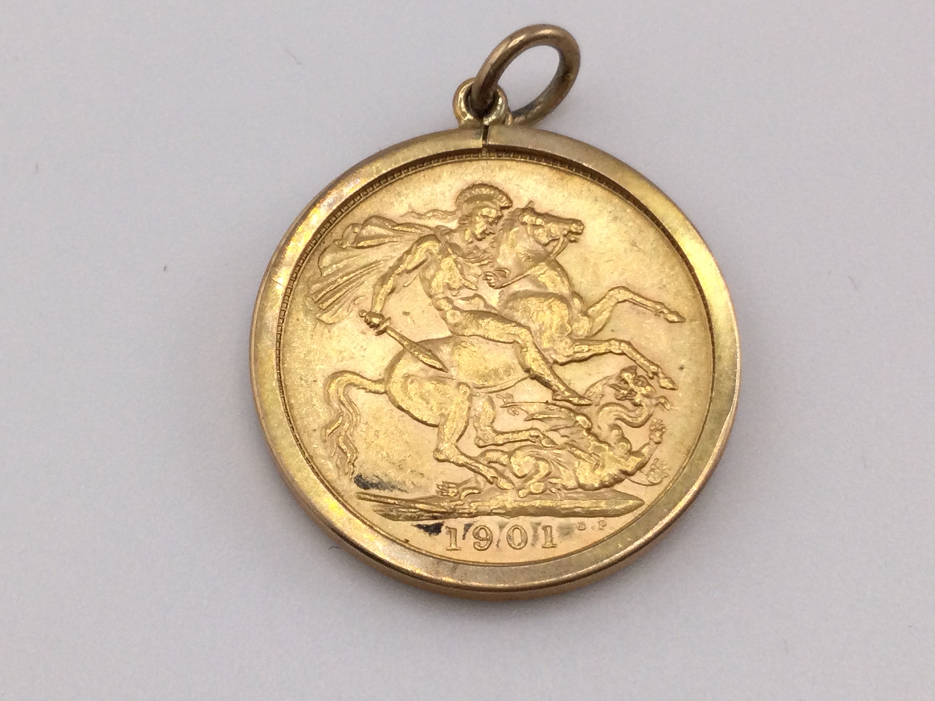 A 1901 full sovereign in pendant mount. 9.36g total. Postage A