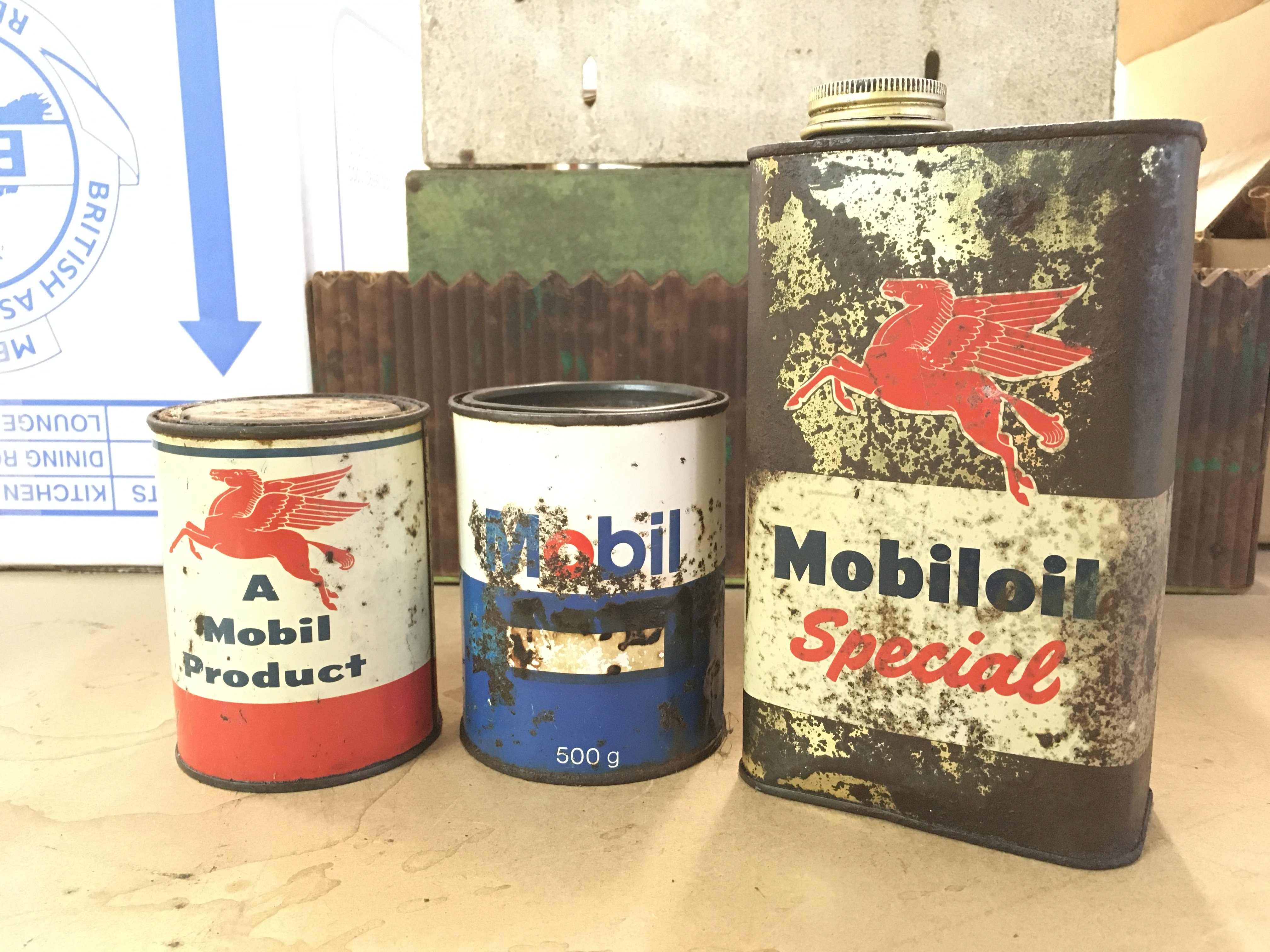 Vintage Mobil oil special can, Mobil oil grease tin and Mobil oil 116 grease tin