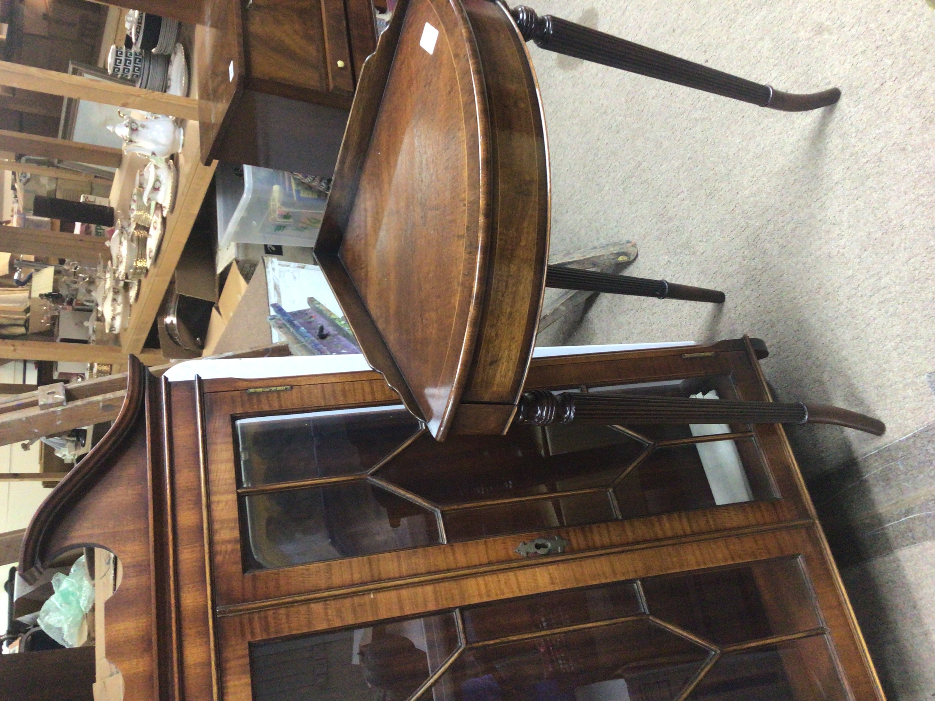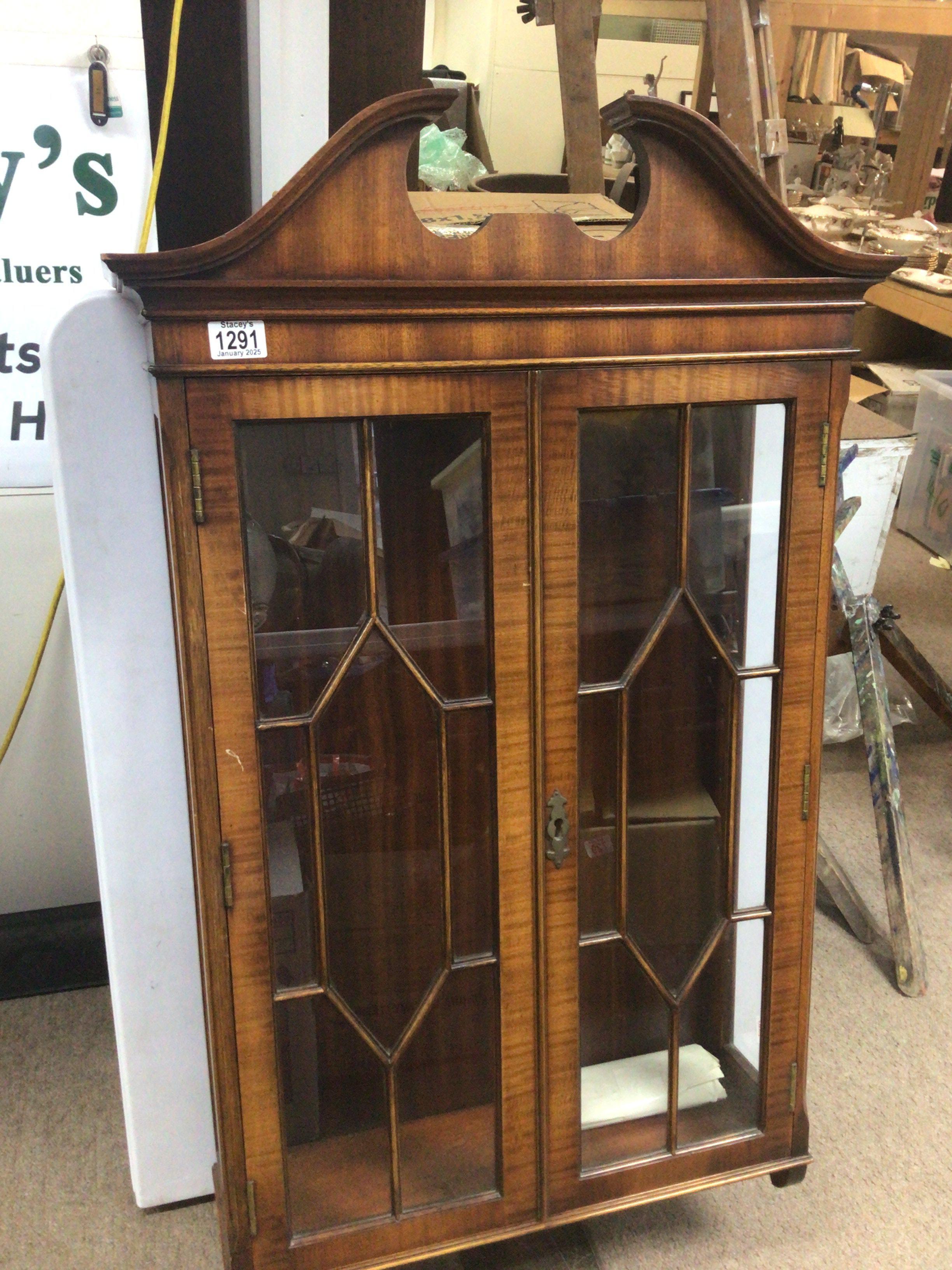 A Mahogany wall cabinet with a shaped pediment the cabinet has three adjustable glass shelfs but no key and a small mahogany corner table. (2) NO RESERVE