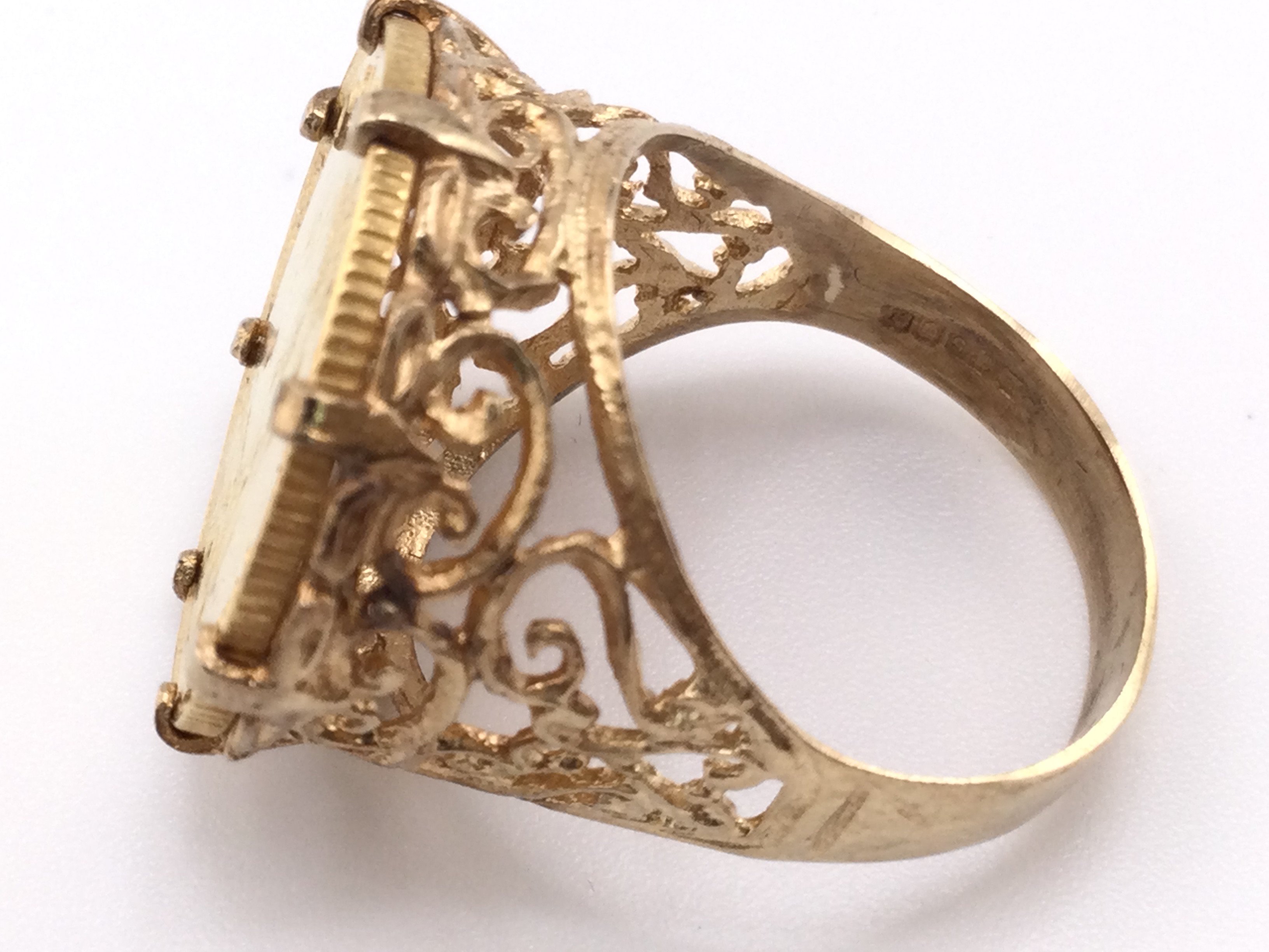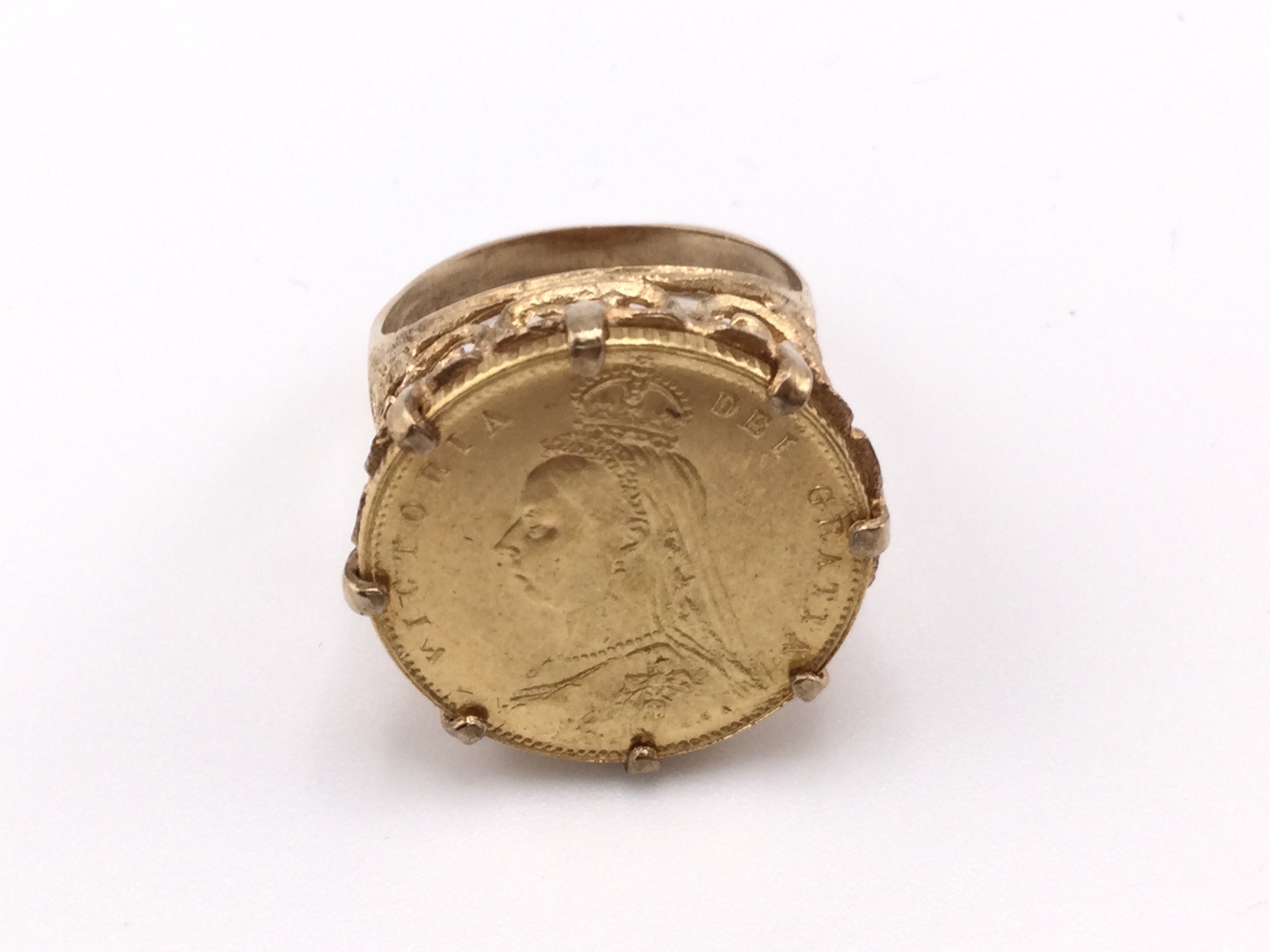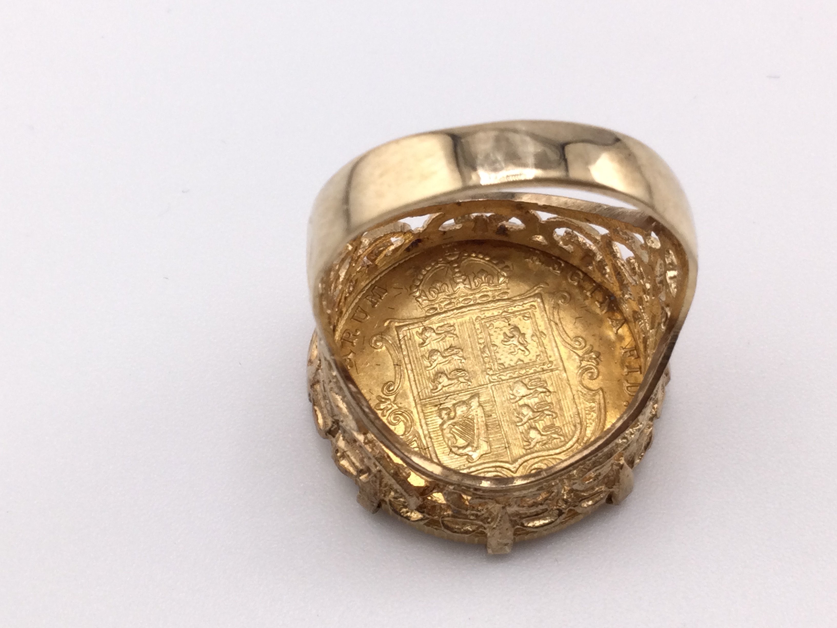 An 1887 shield back half sovereign ring. Size P and 7.44g