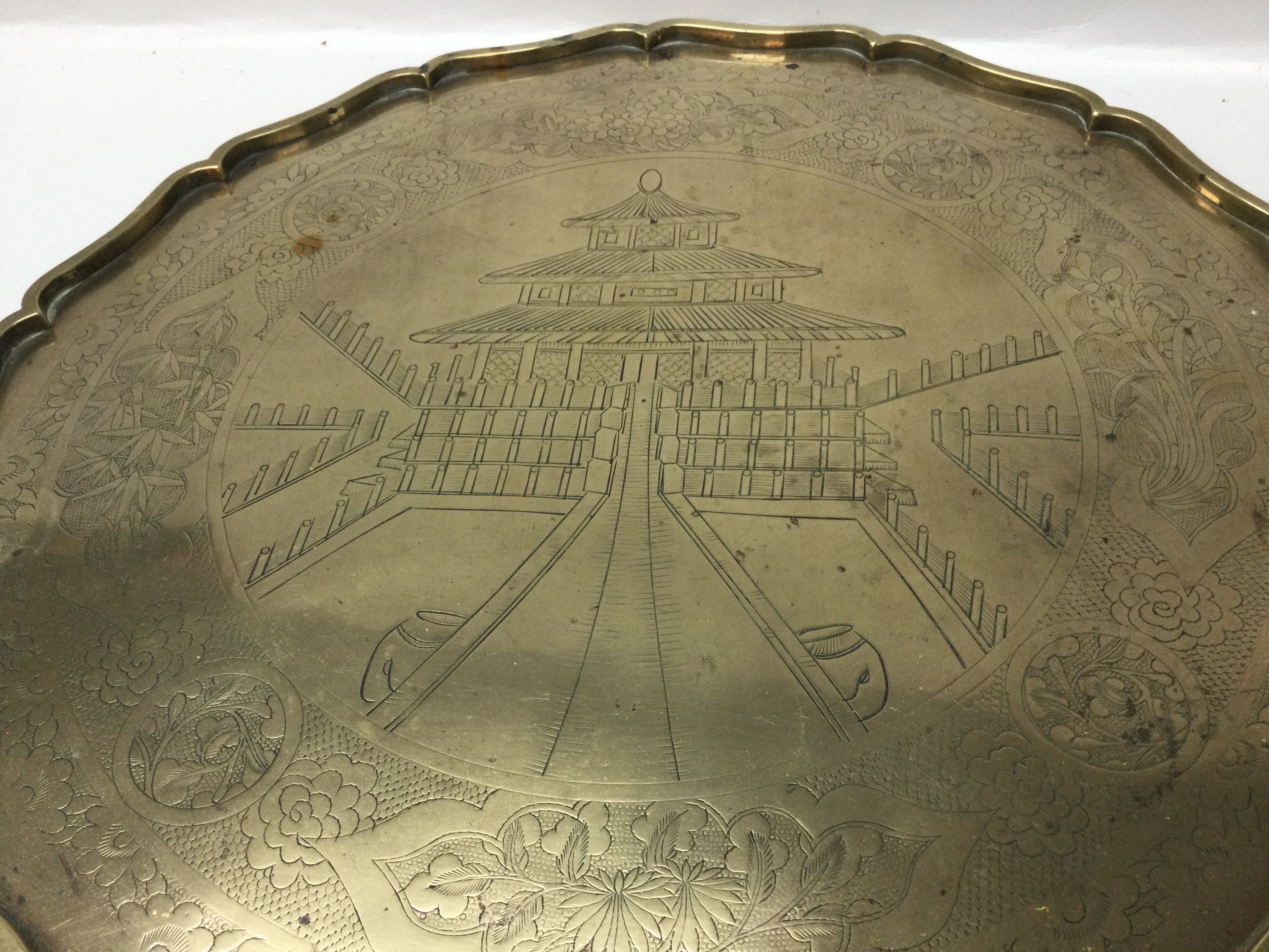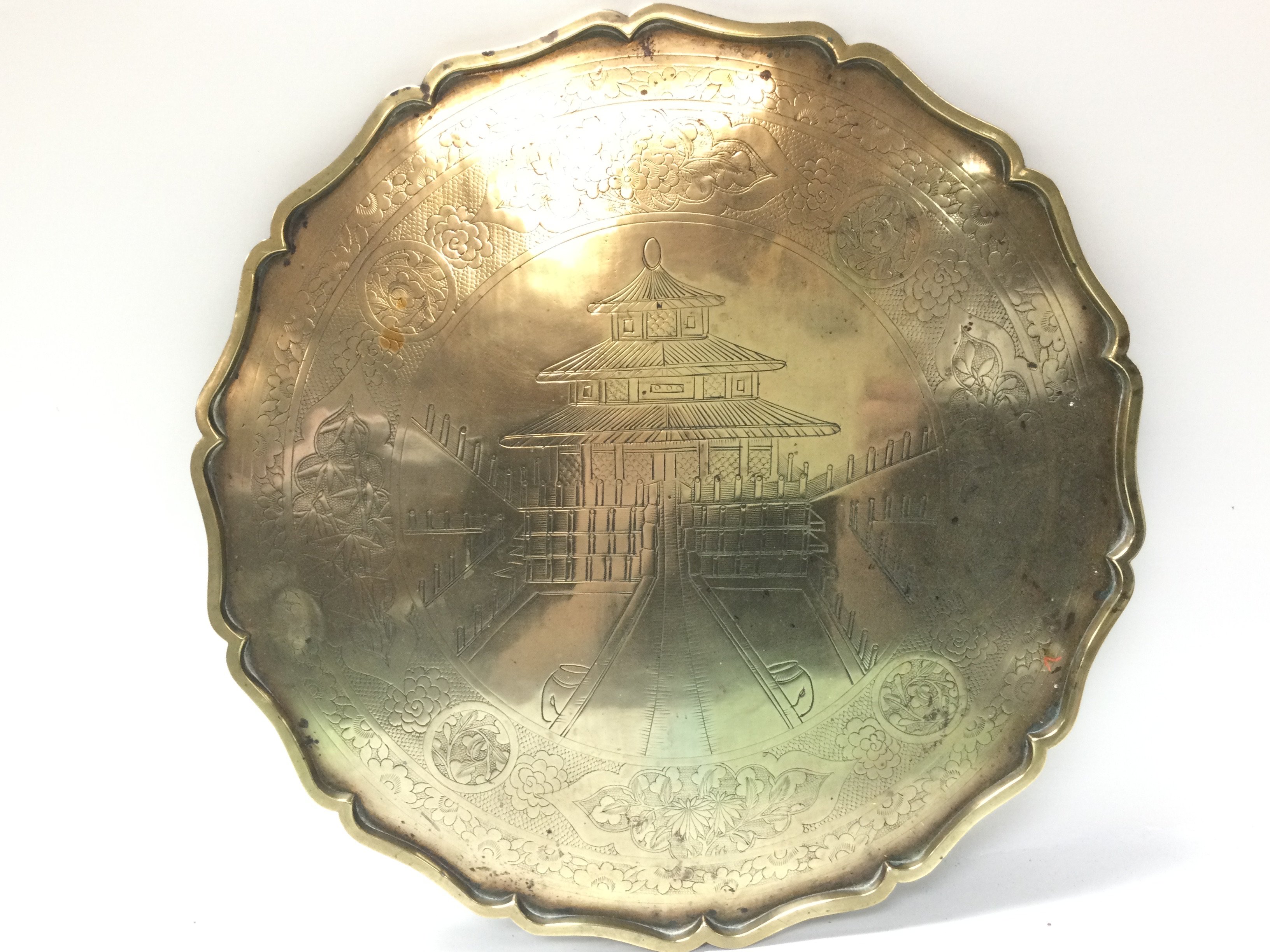 A Japanese brass tray with Pagoda design, dimensions 40x40cm .postage category C. NO RESERVE