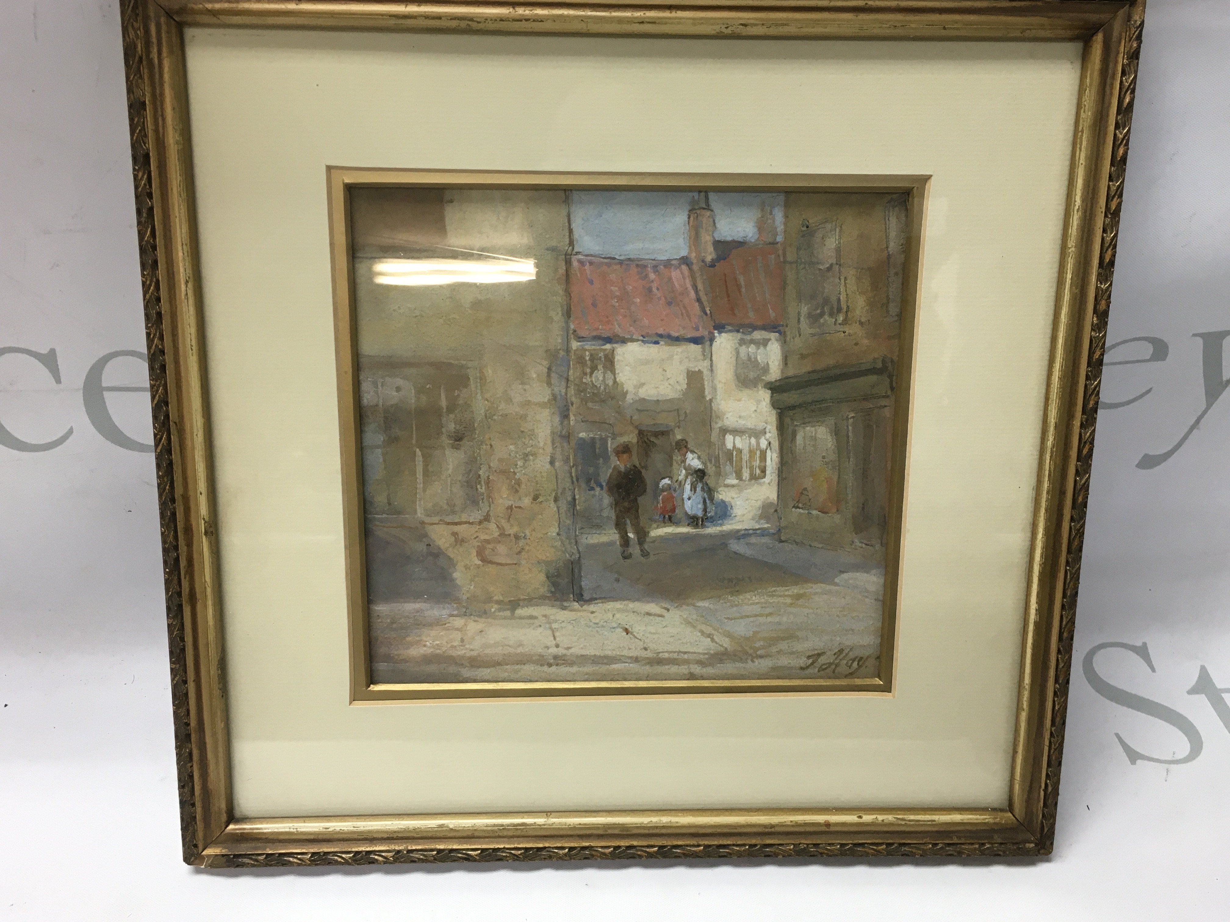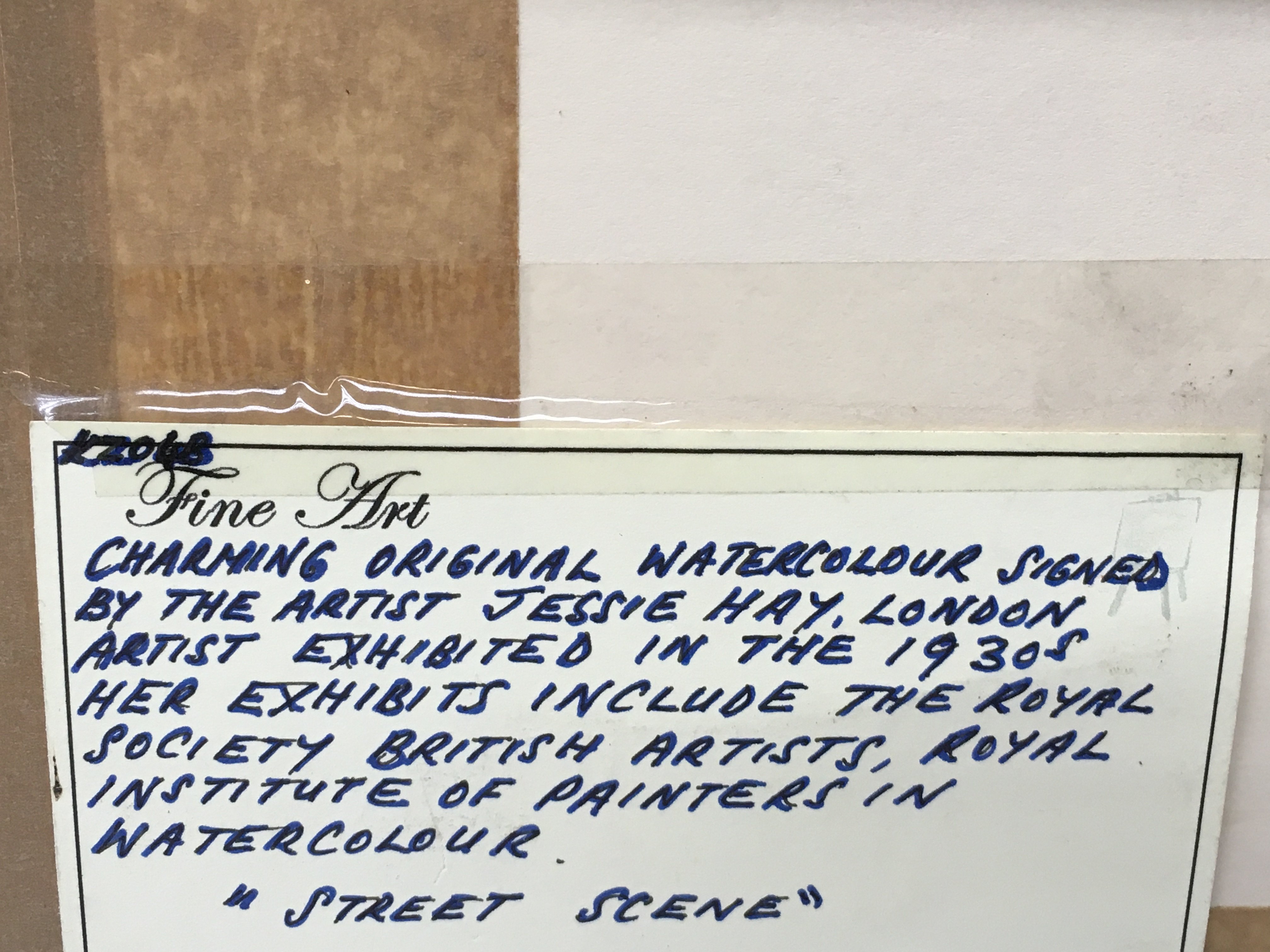 A framed watercolour by Jessie Hay of a street scene. 30x29cm Postage D.