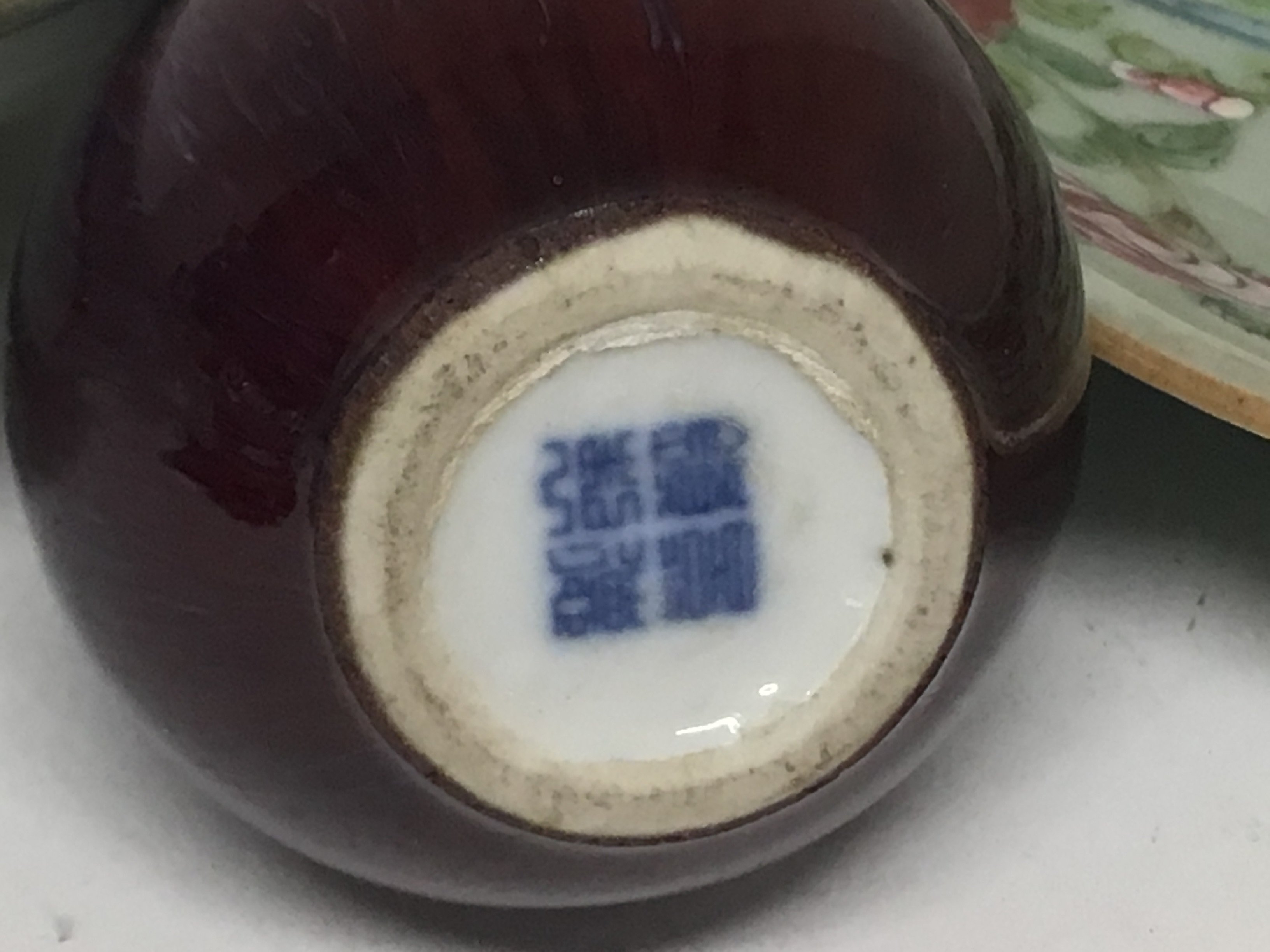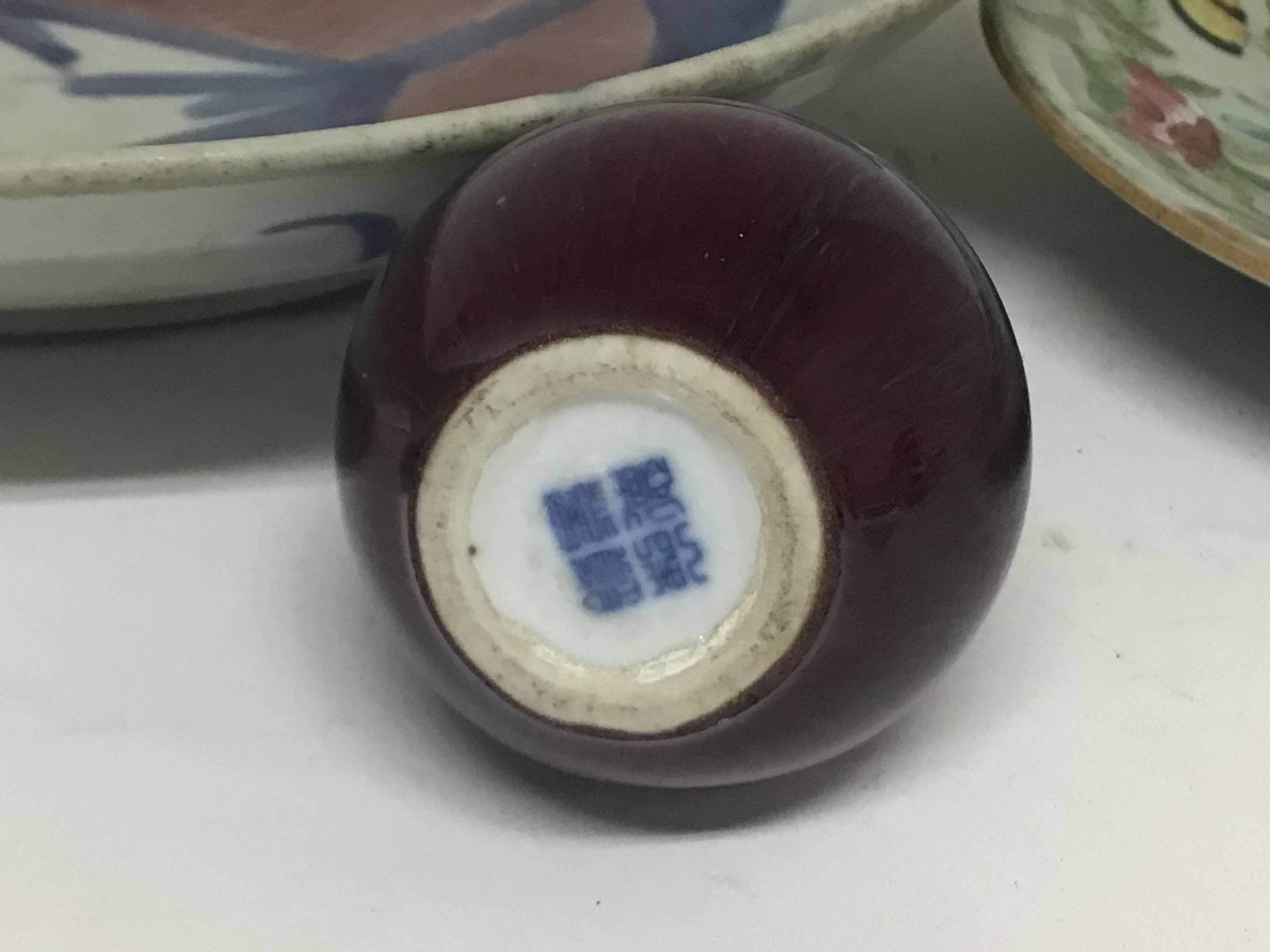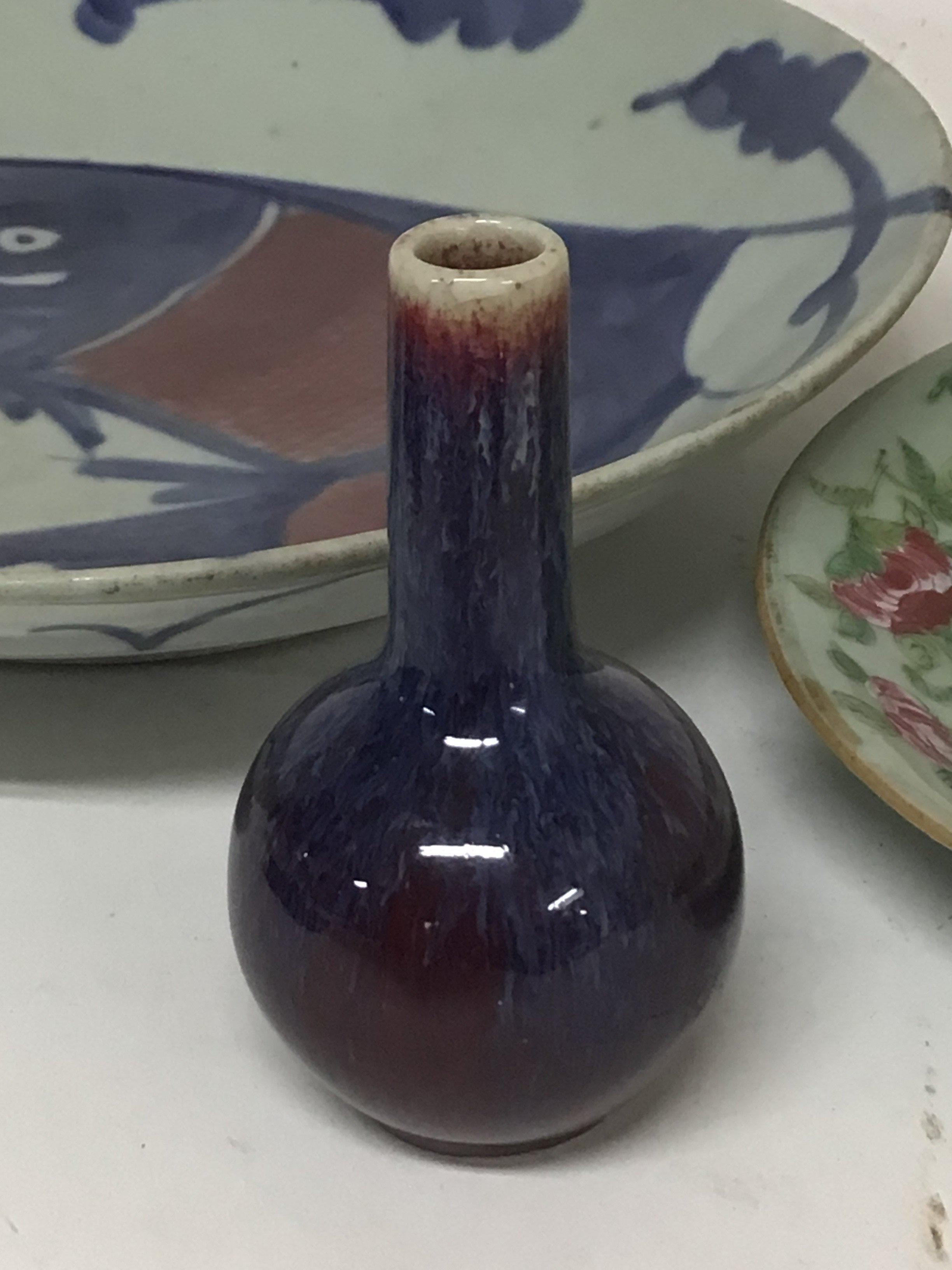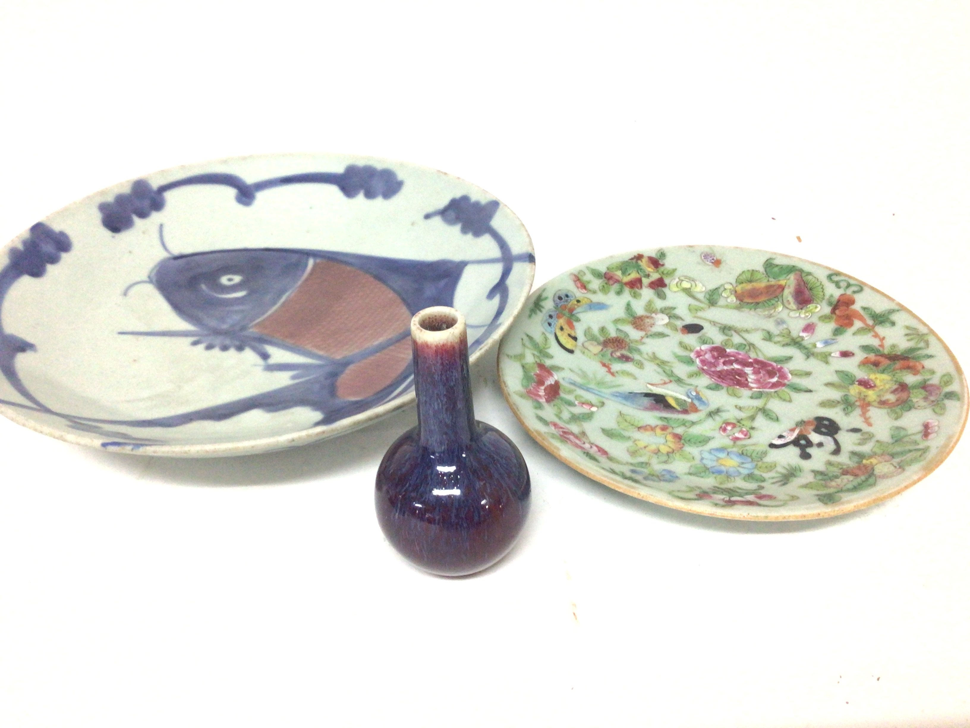 A Chinese red glazed small bottle vase with caricature marks to the base a 19th century Celadon dish and an Eport porcelain dish decorated with a Carp fish. (3) NO RESERVE