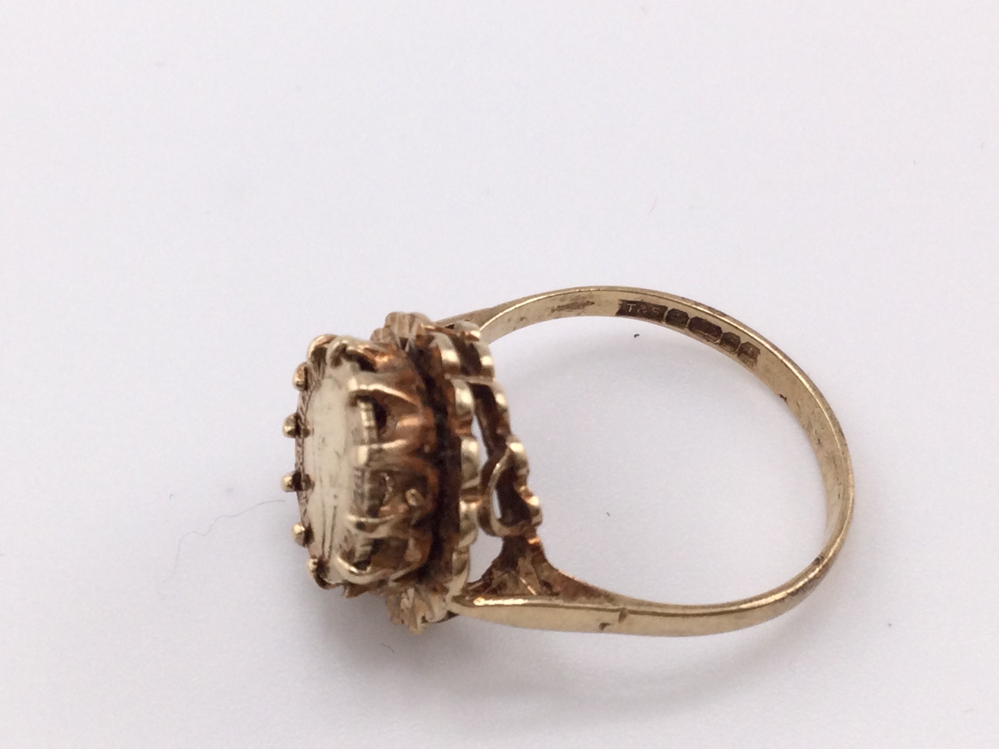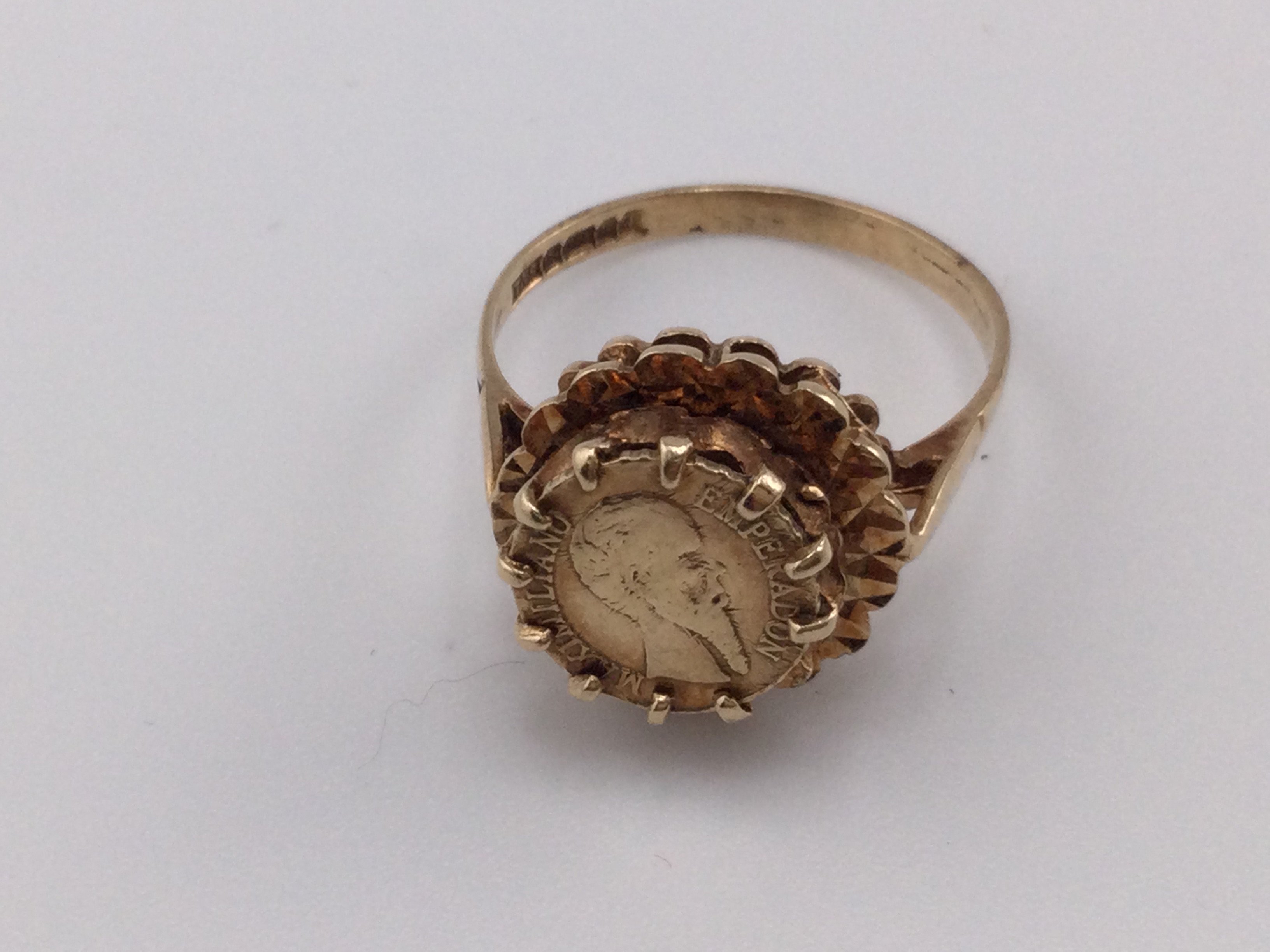 A 9ct gold ring set with an 1865 Maximiliano coin. Size P and 3.49g