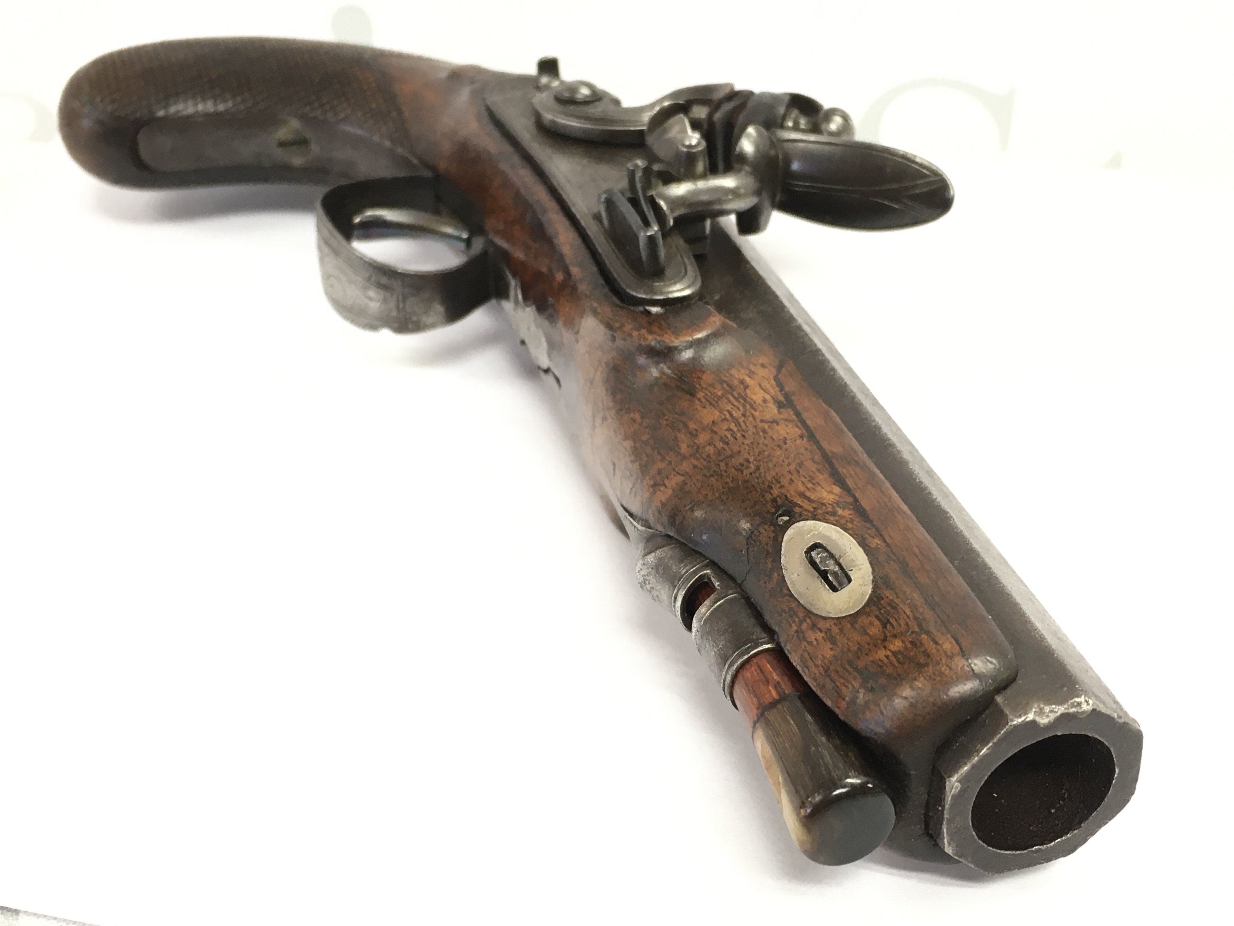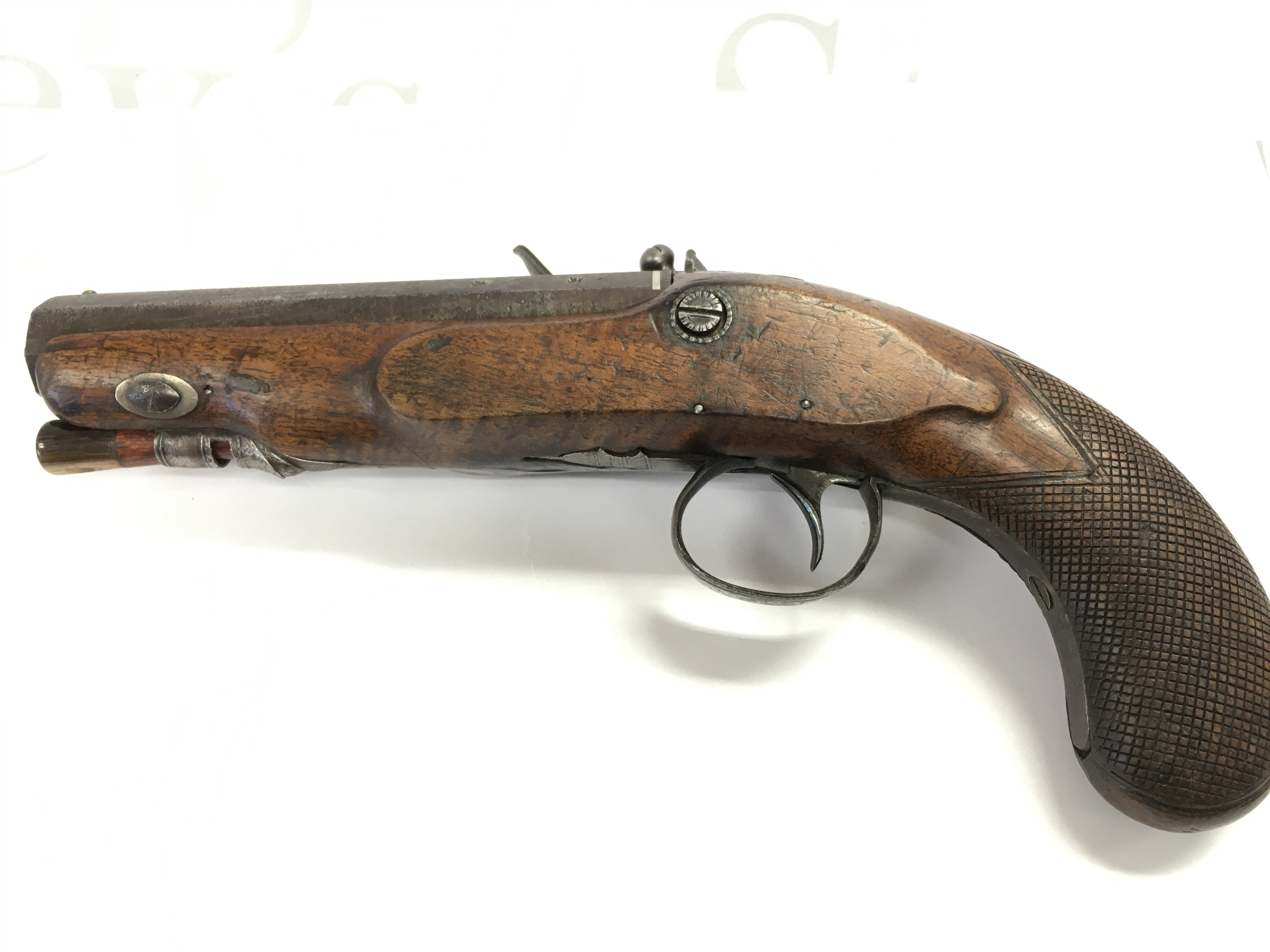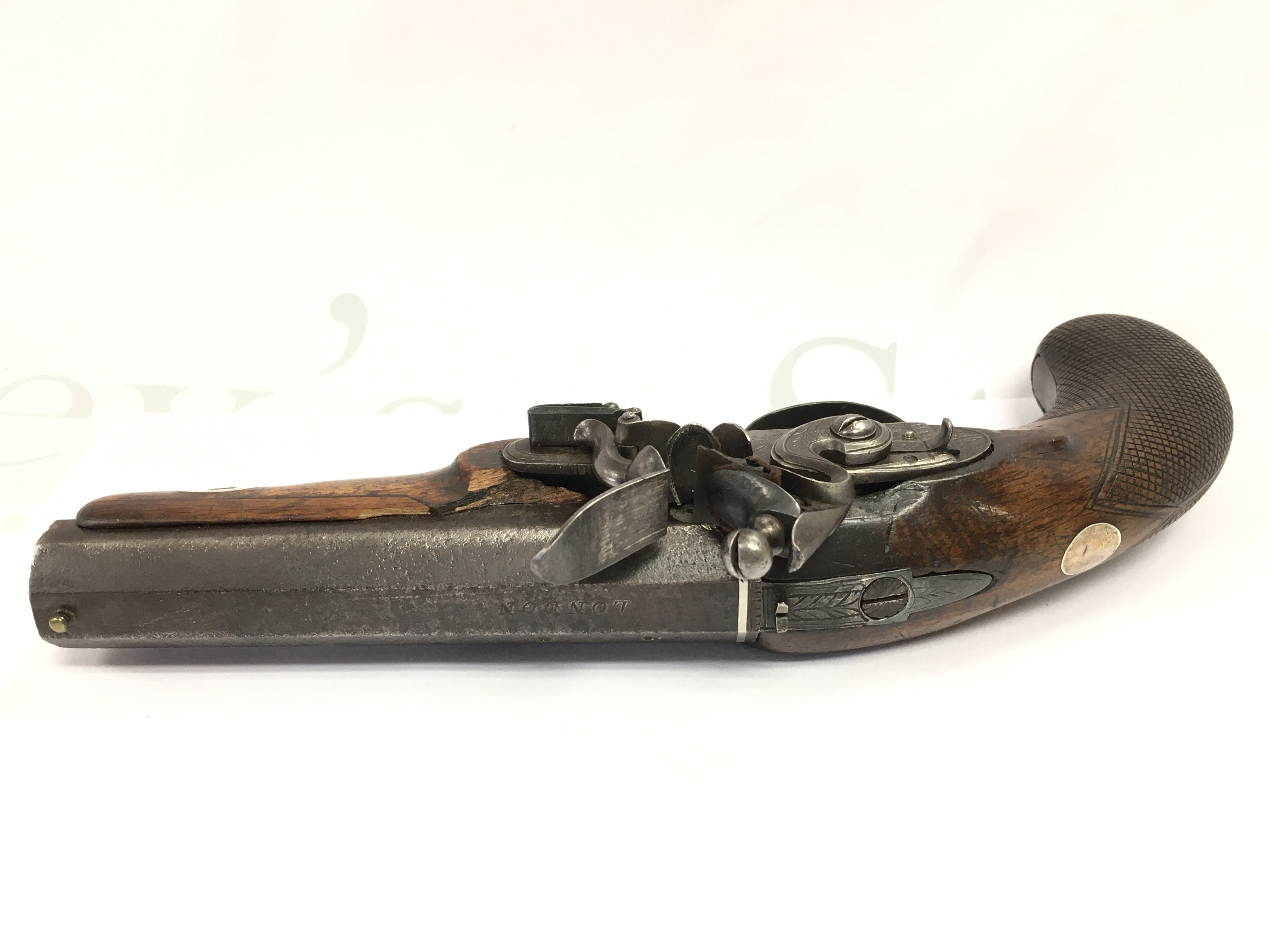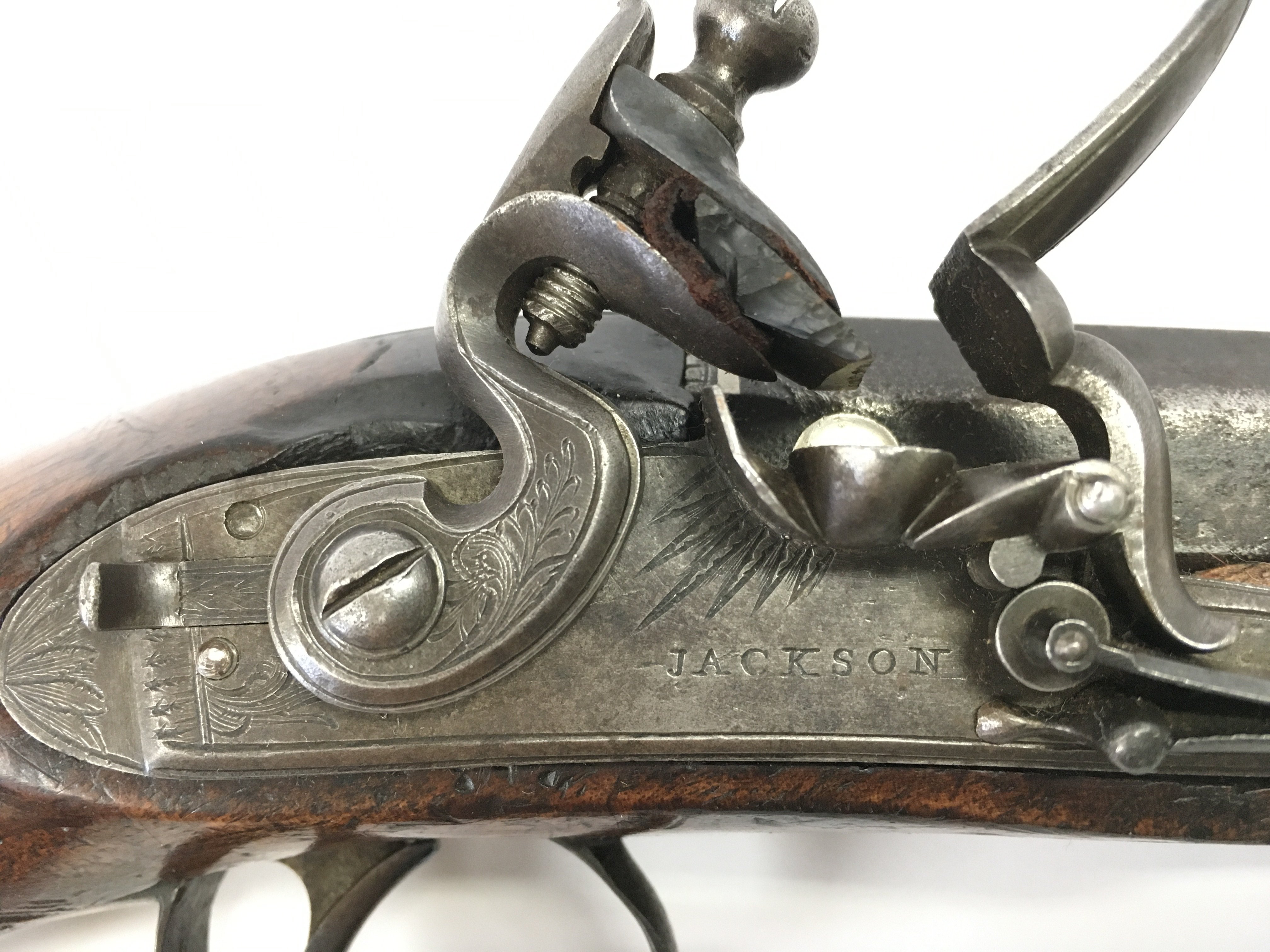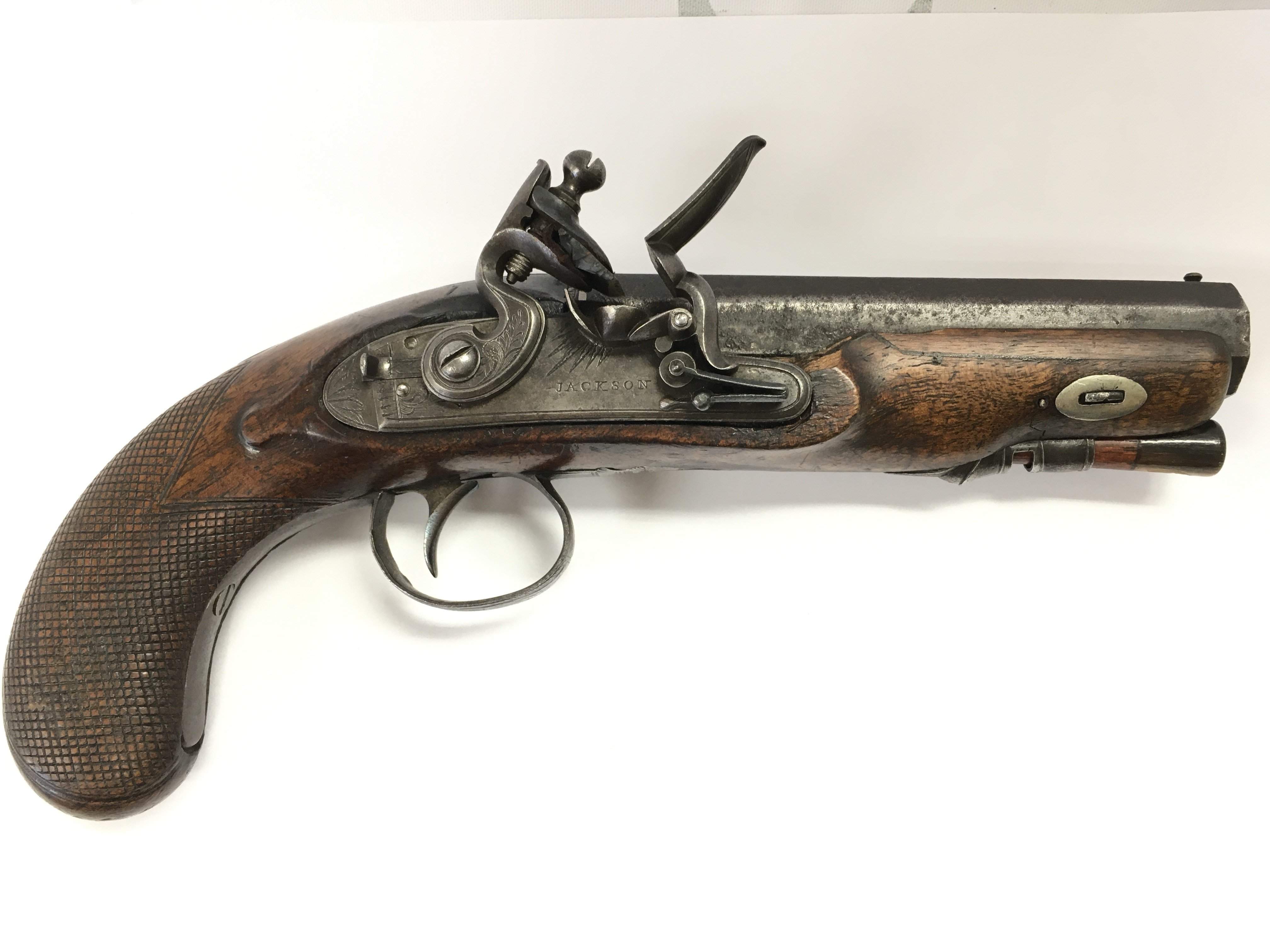 An early 19th century flintlock pistol with an octagonal barrel. Maker Jackson (possibly before partnership with Jackson Mortimer & Son makers to the crown) . Total length 23cm long ,barrel approximately 12.5cm long .