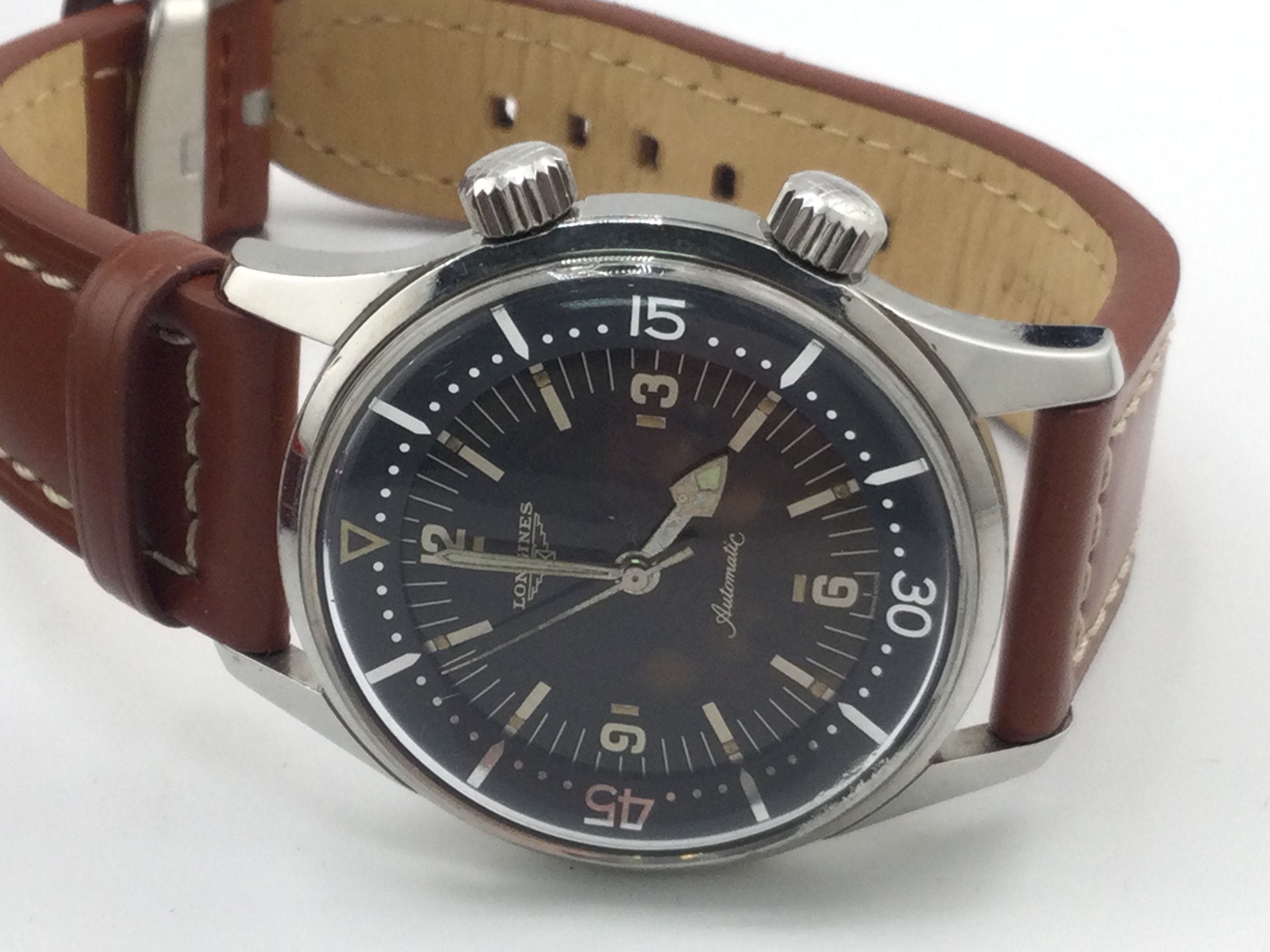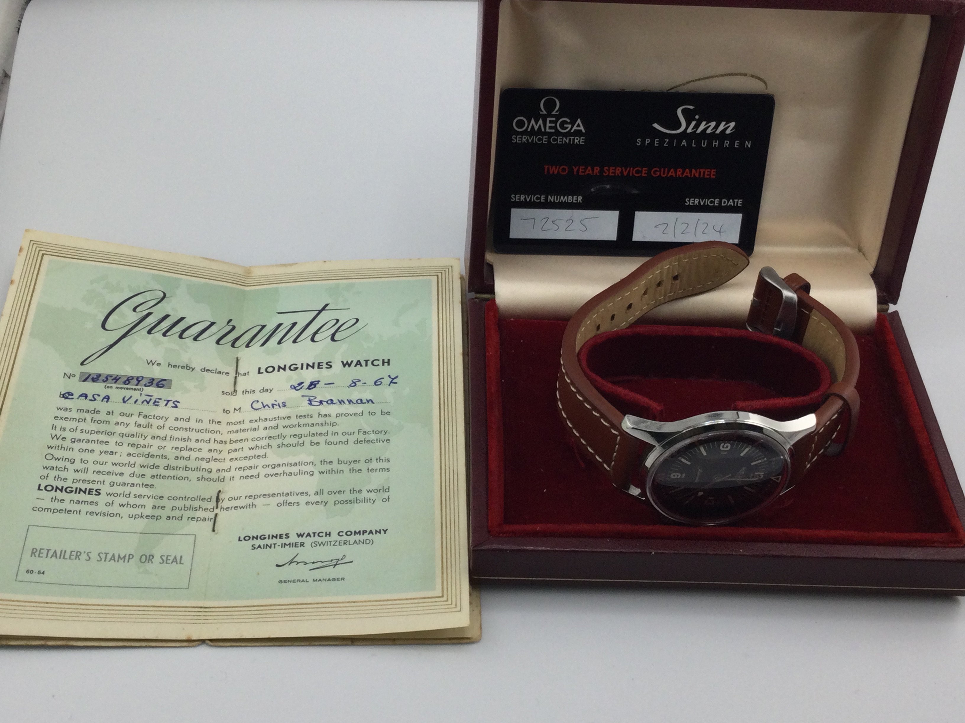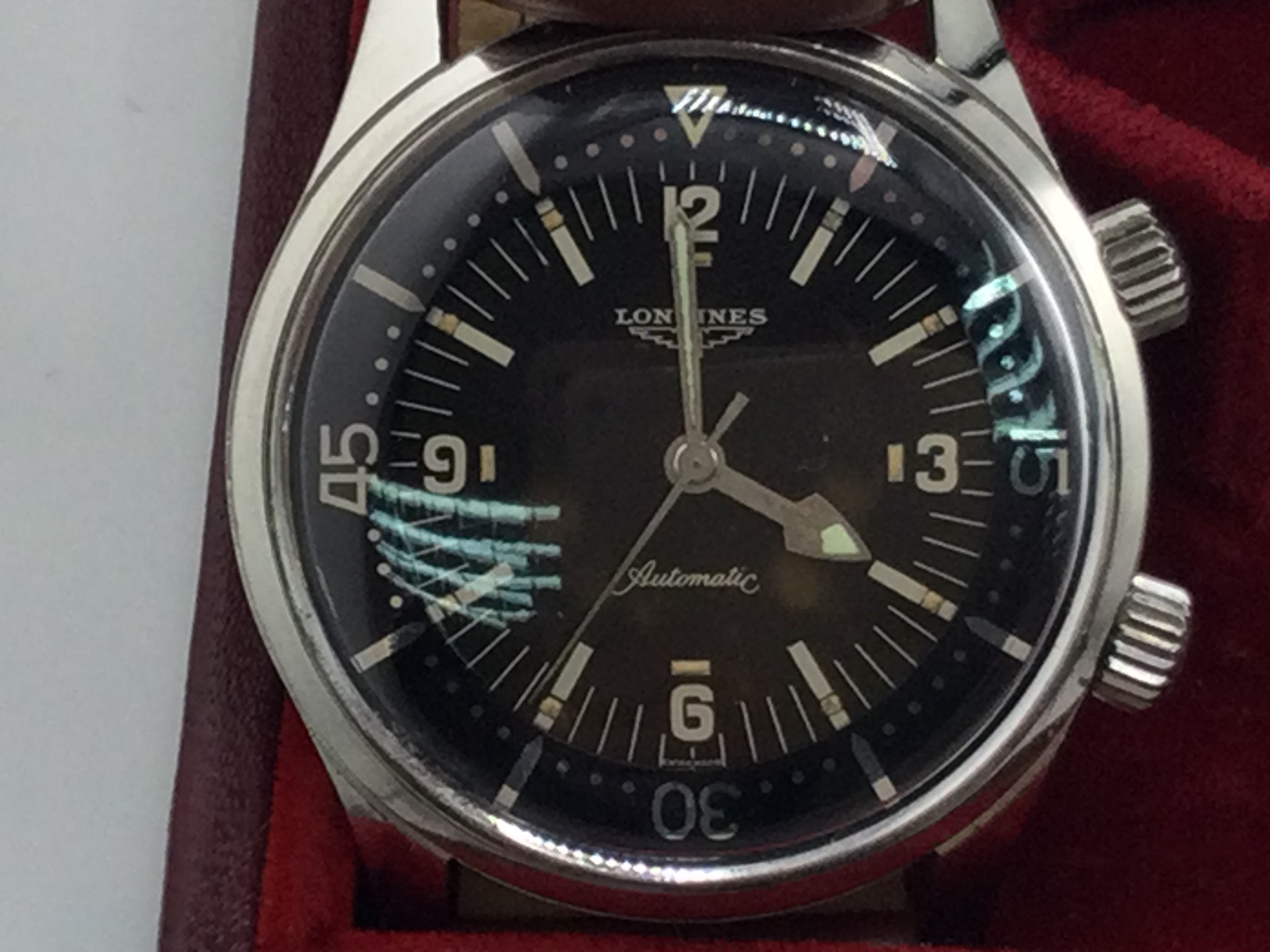 A rare and sought after longines super compressor automatic gents watch. Black dial is showing nice marks. Winds and runs. Comes with box and papers and a service card from 2024.