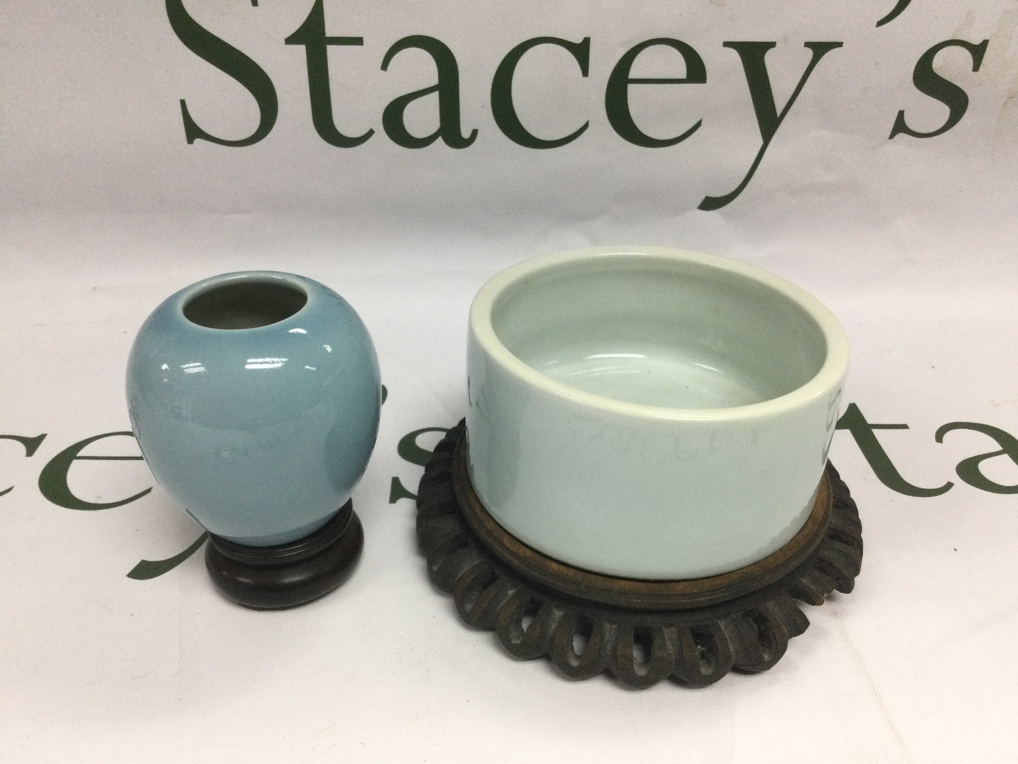 A small Oriental vase raised on a hardwood base, approx total height 8cm plus one other (2). Shipping category D. NO RESERVE