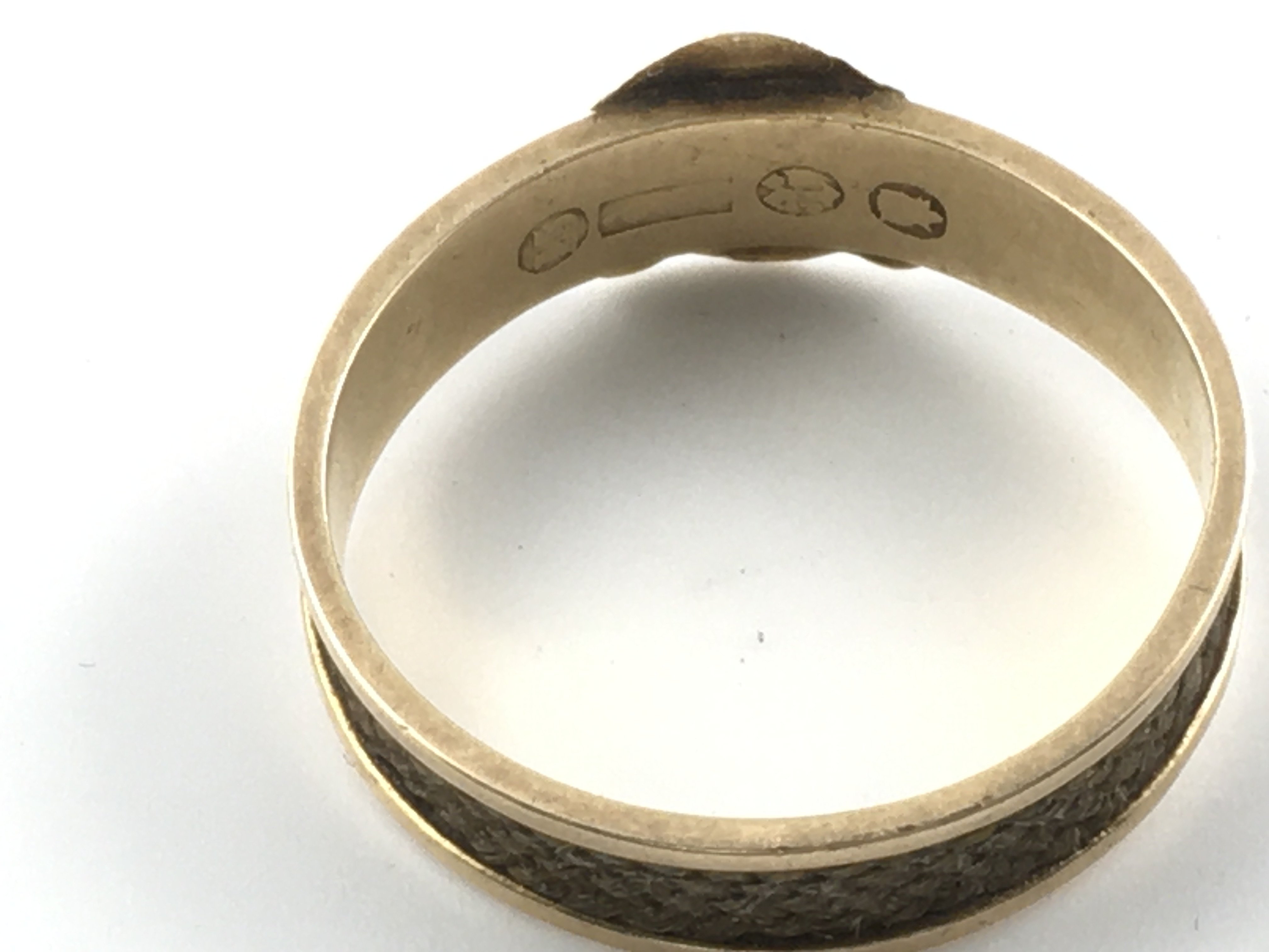 A 15ct gold Victorian memorial ring with plated hair. Size S and 2.21g.