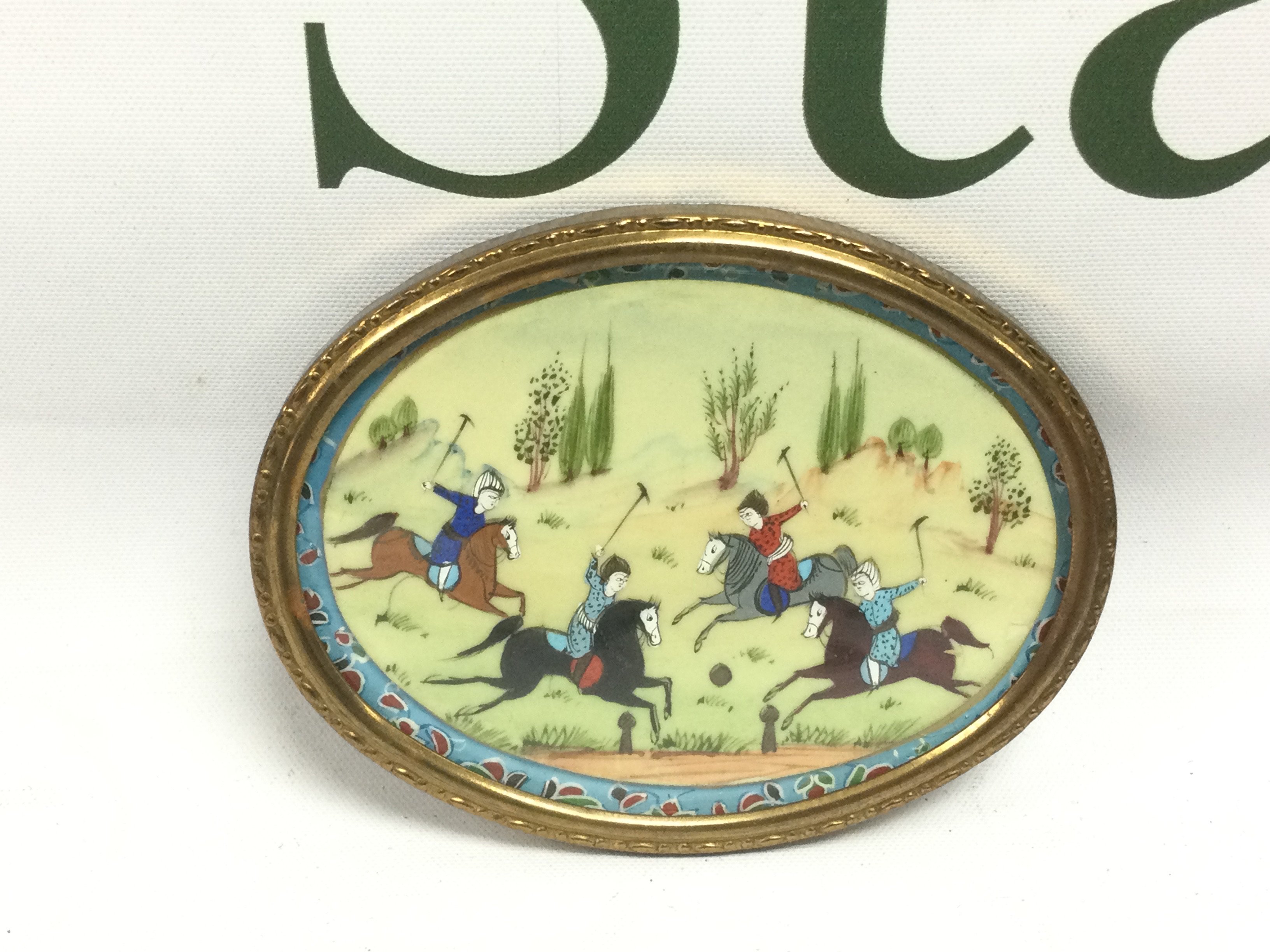 A framed miniature painting of a polo match, approx width 9cm. Shipping category D. NO RESERVE