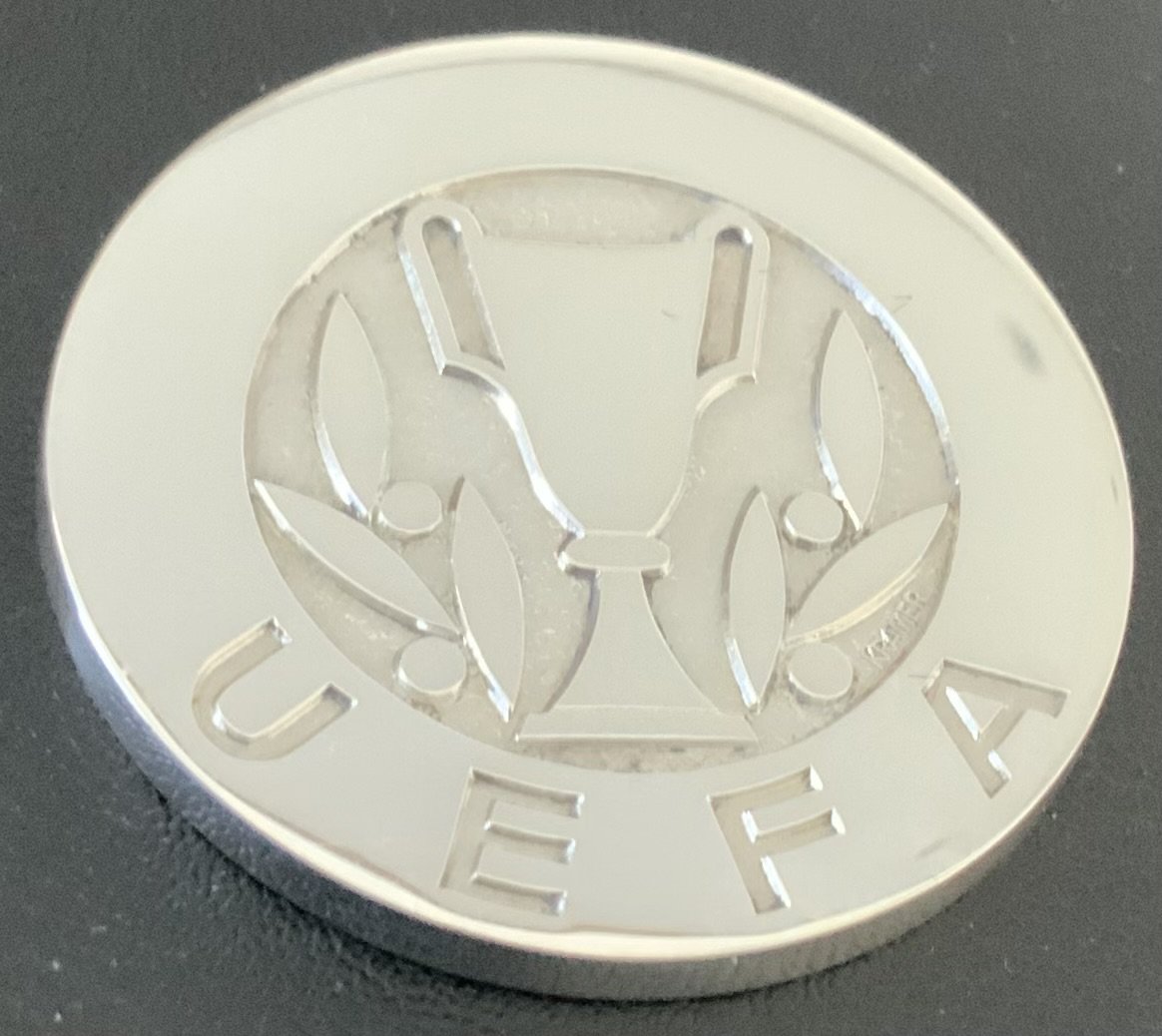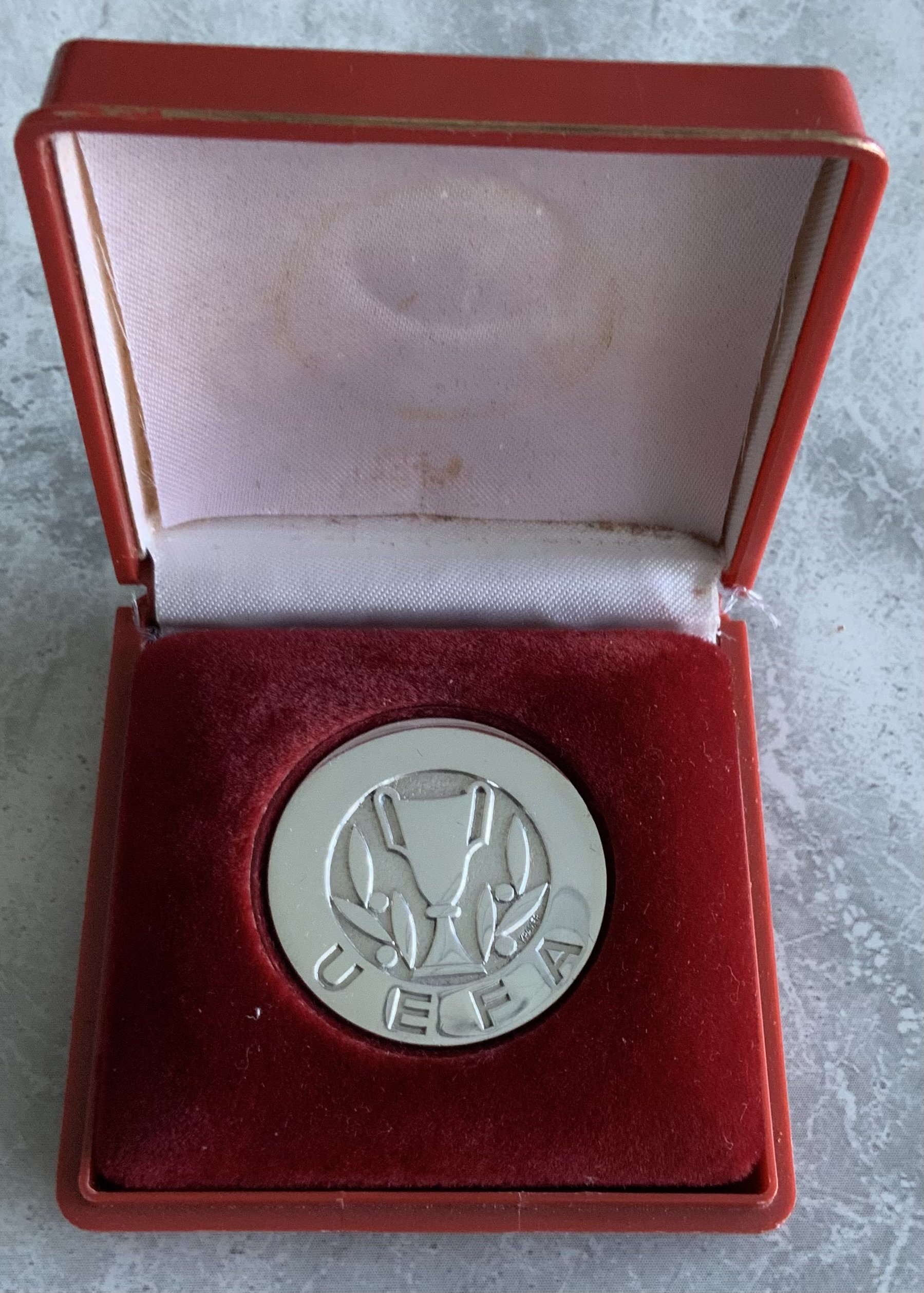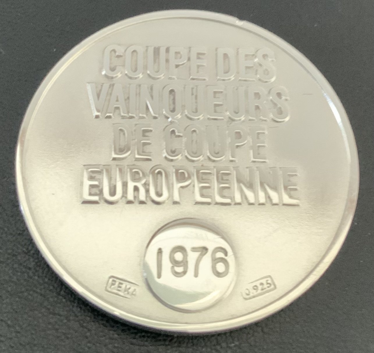 1976 West Ham ECWC Final Runners Up Football Medal: European Cup Winners Cup Final boxed runners up medal awarded to Alan Taylor who came on as substitute on 47 minutes at the Heysel Stadium v Anderlecht. Silver medal has UEFA to one side the reverse reading Coupe Des Vainqueurs De Coupe Europeenne 1976 and 925 hallmark. COA from Alan Taylor whose goals the season before got them into this competition.