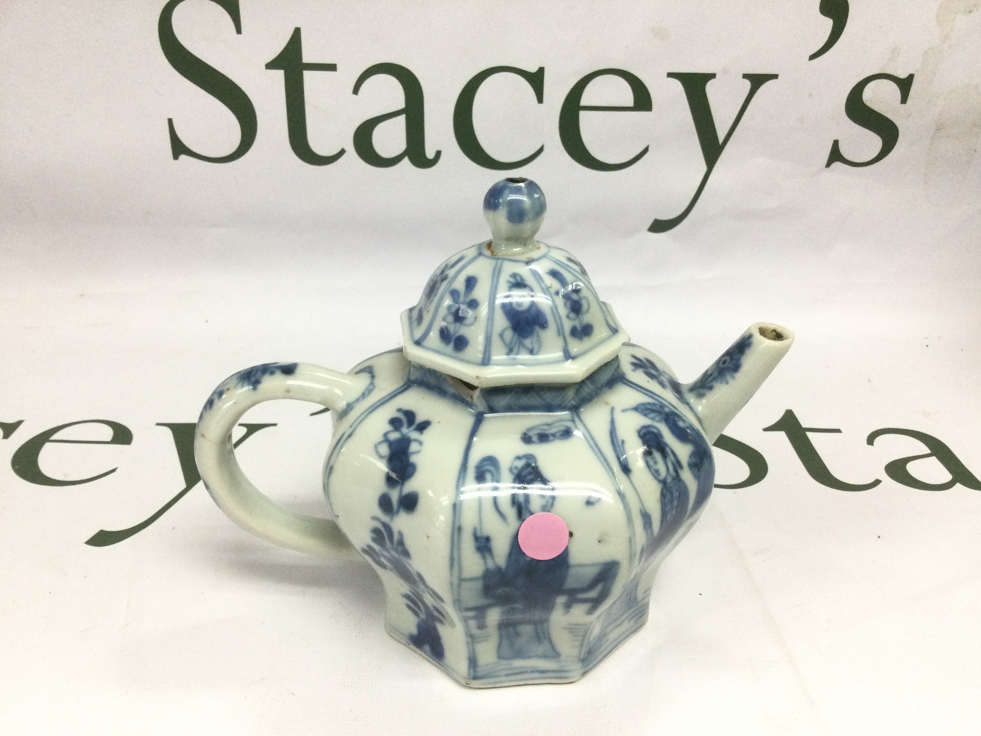 A small blue and white teapot decorated with various figures, approx height 11.5cm, some damage. Shipping category D.