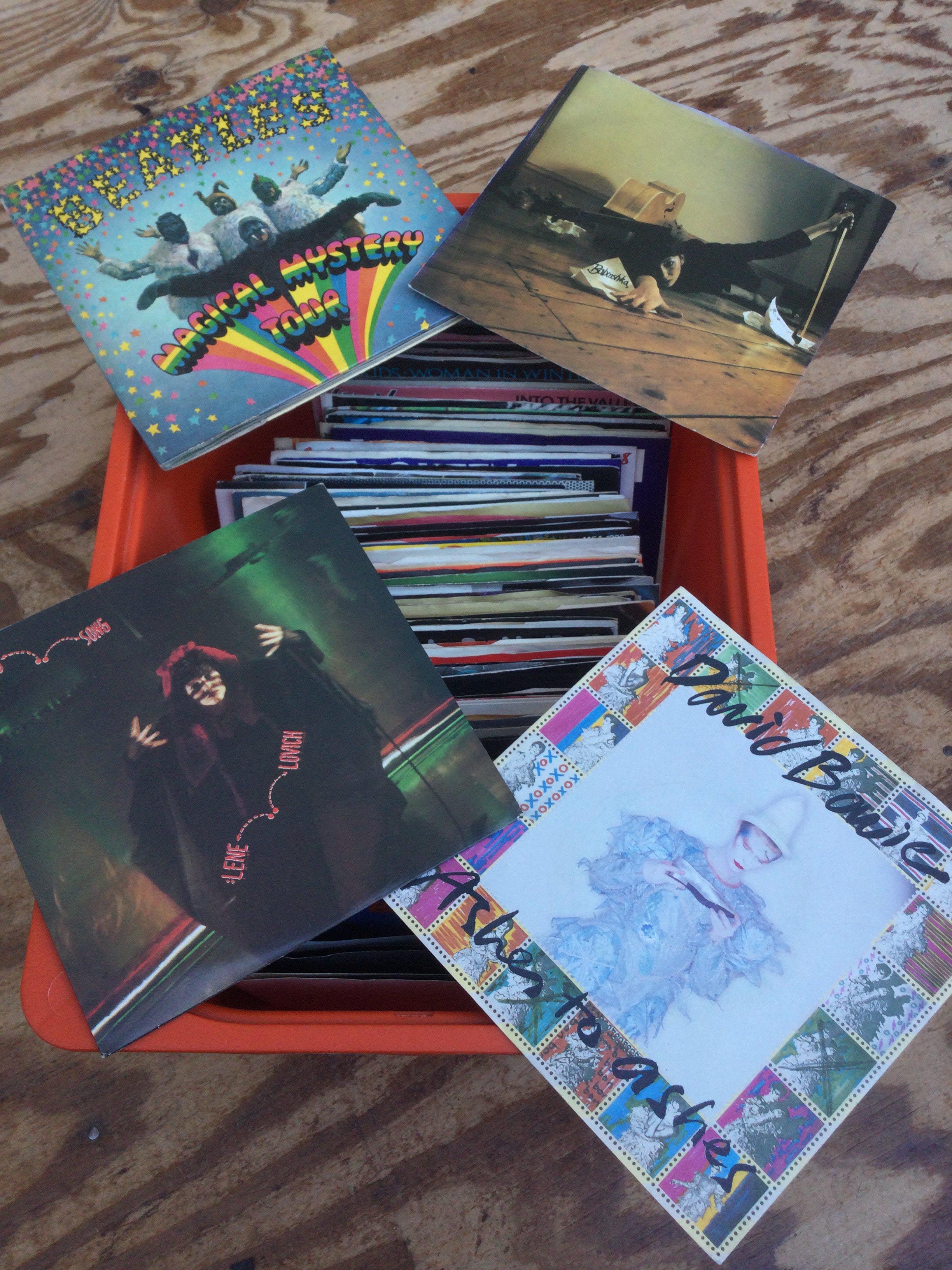 A box of 7" singles and EPs by various artists including The Beatles, David Bowie, Kate Bush and many more.