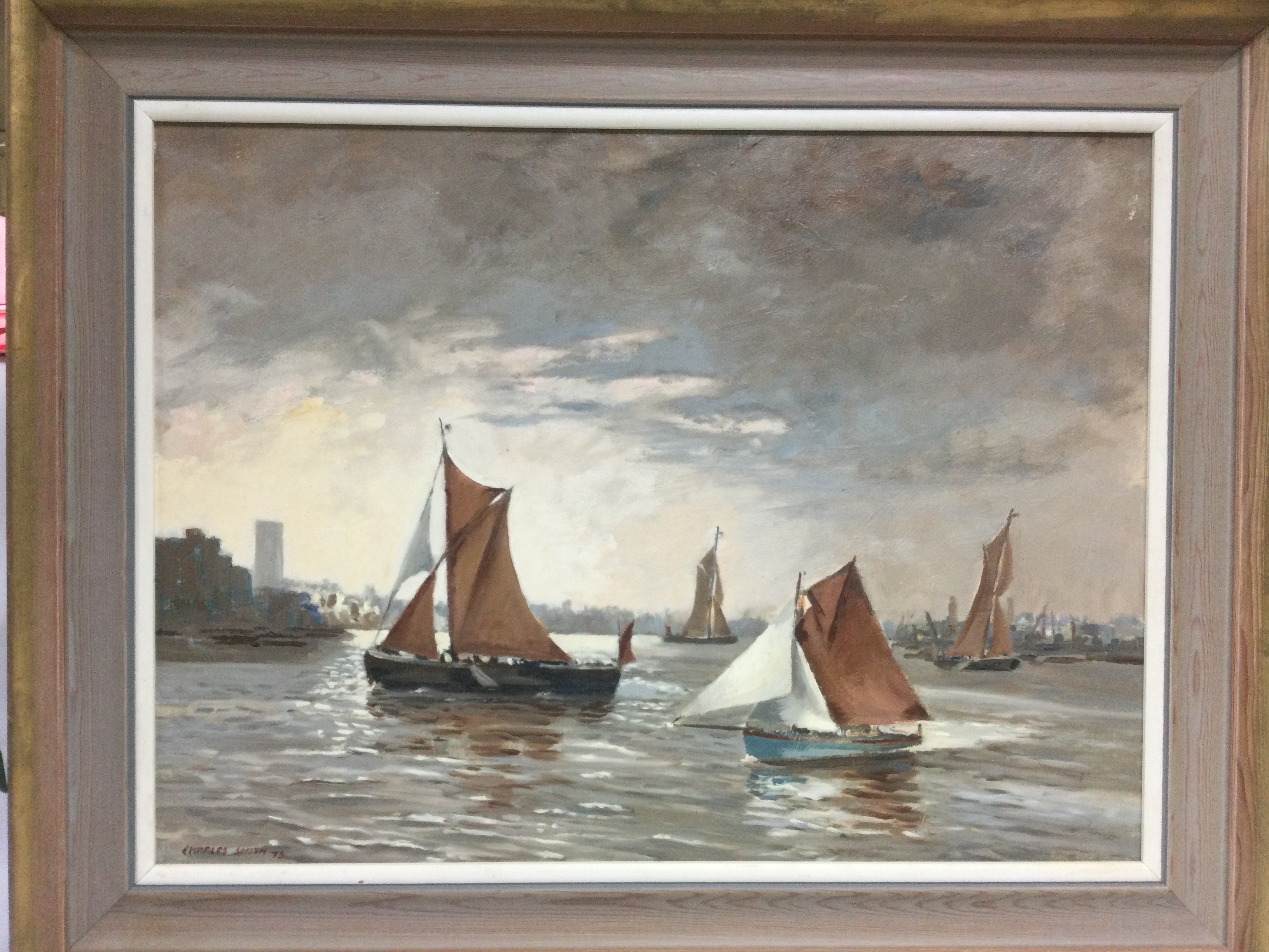 An oil on board painting study of sailing boats on the Thame, approx 74cm x 59cm. Shipping category D. NO RESERVE