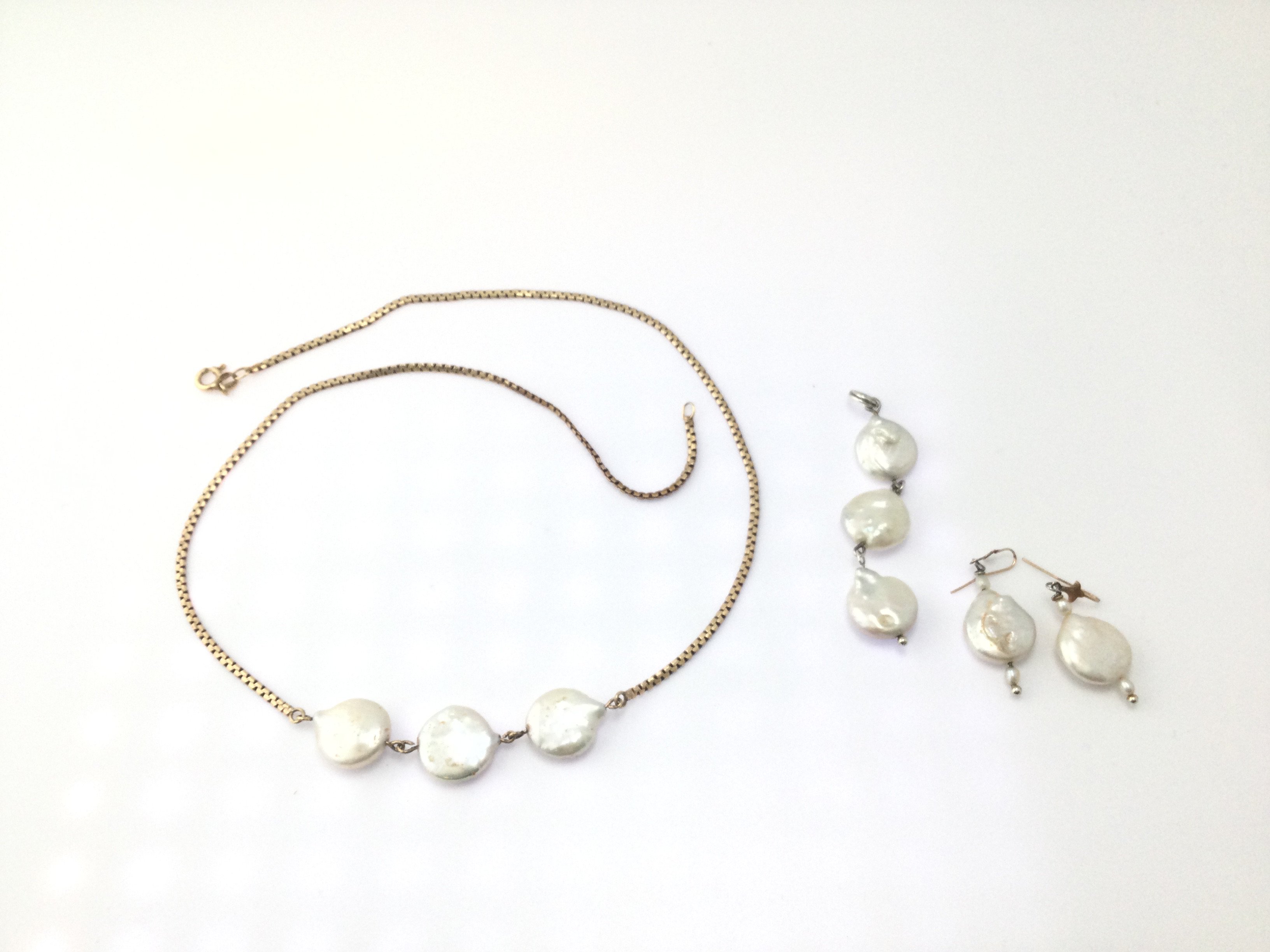A 9ct gold flat pearl necklace and earrings. Postage B