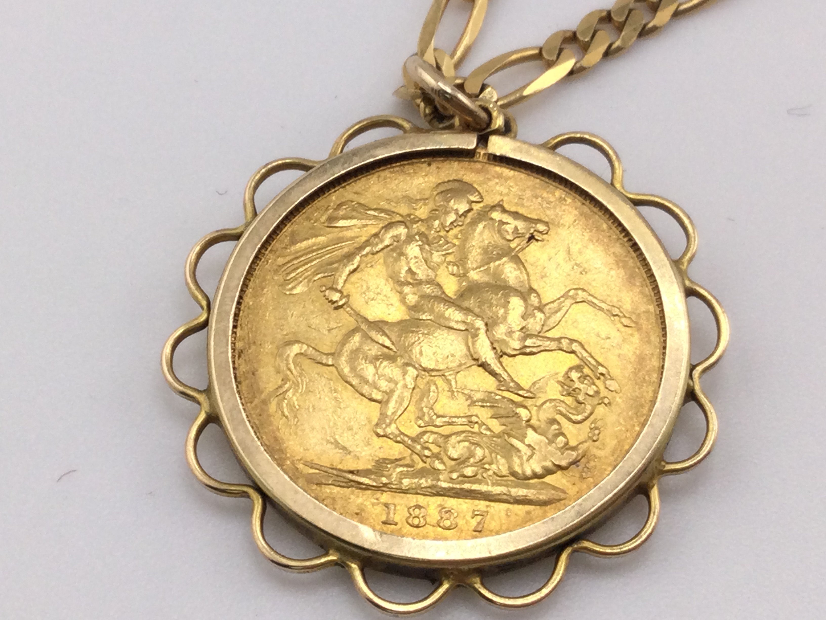 An 1887 full sovereign in mount with a 9ct gold chain. 16.42g