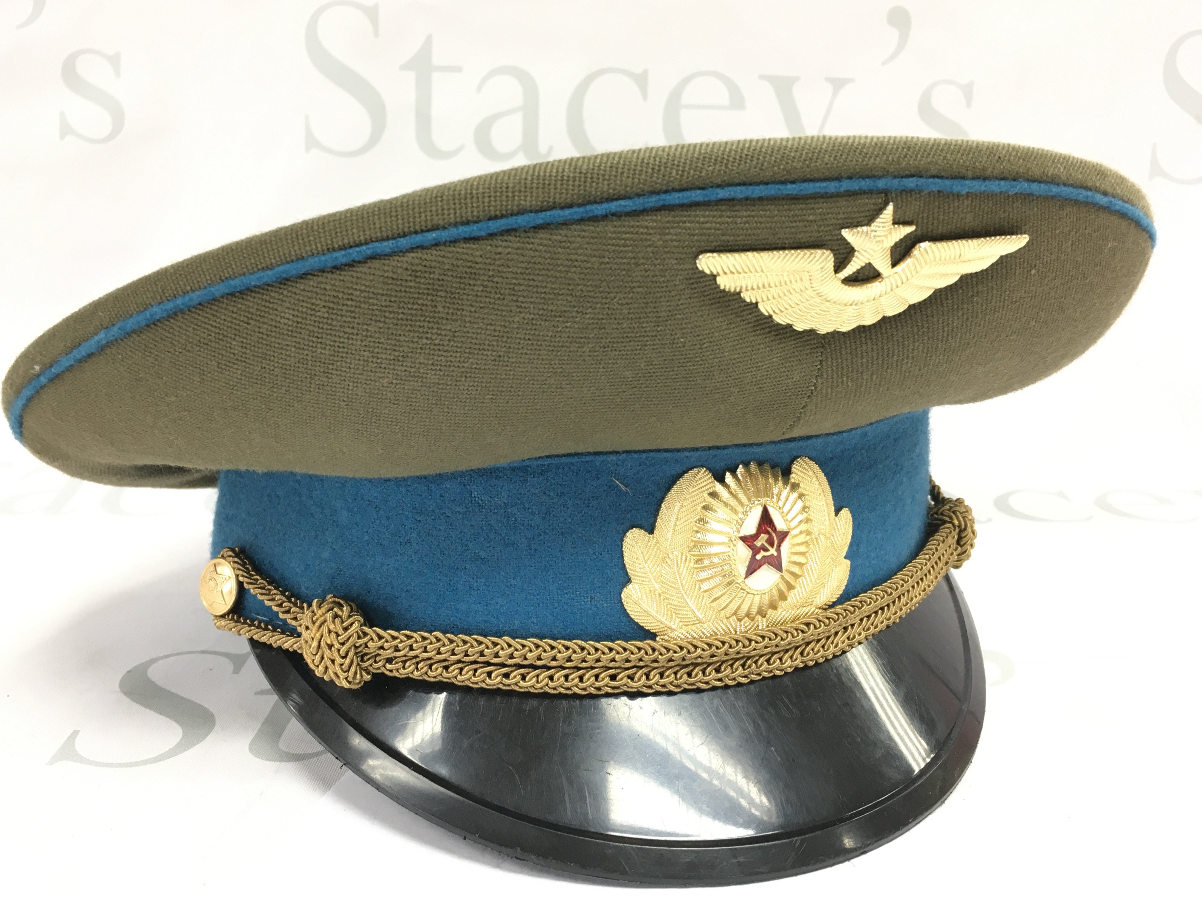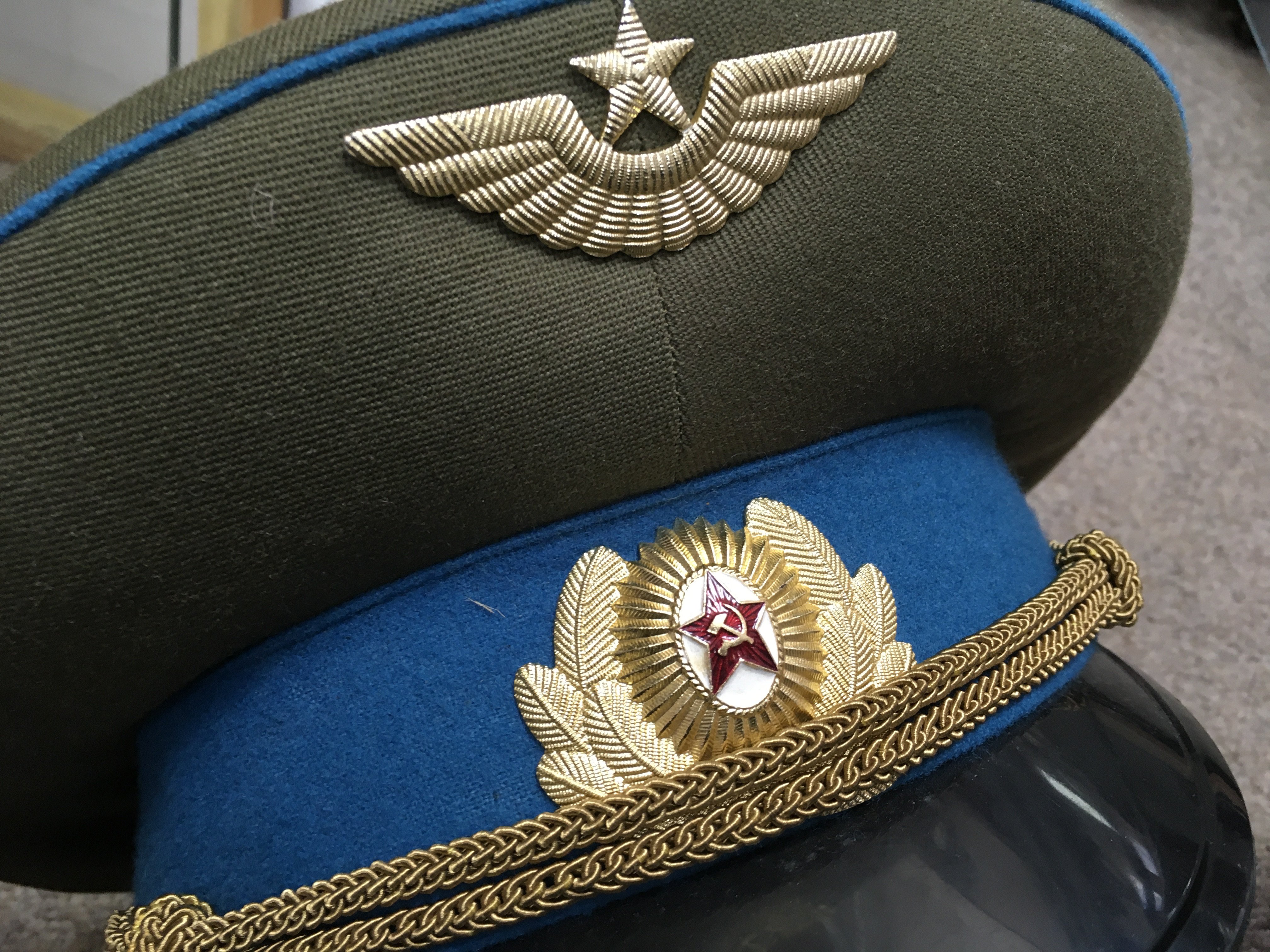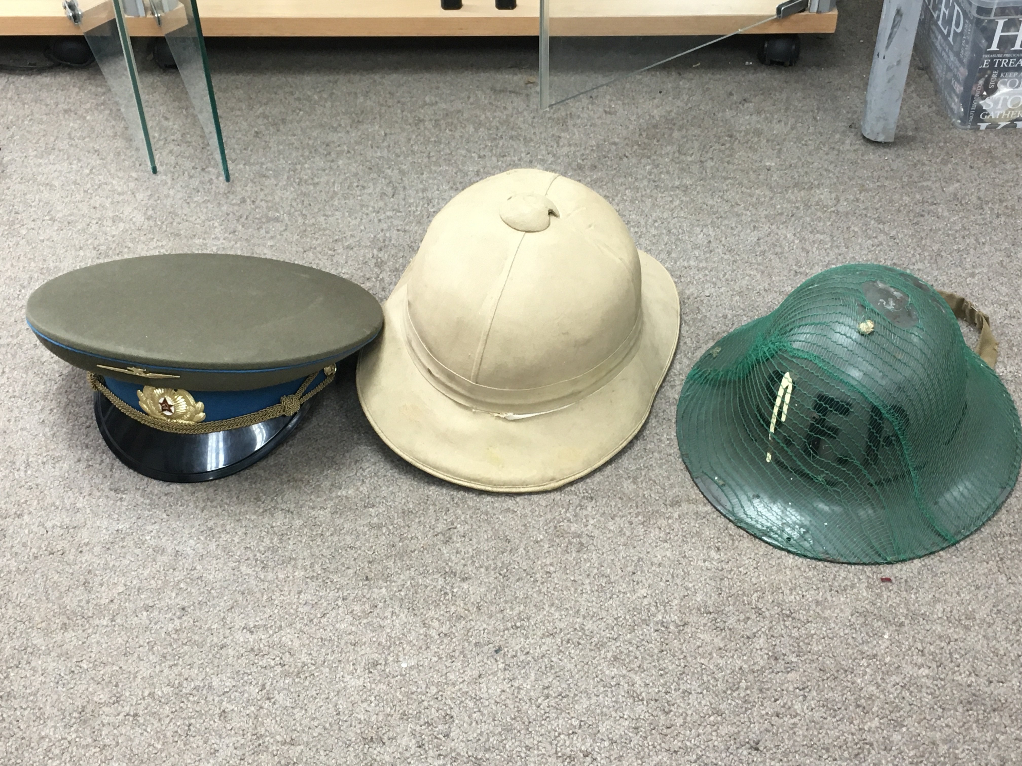 A collection of military hats consisting of a USSR Aviation cap, a WW2 Pith helmet marked 1943 and a steel helmet. Postage category C