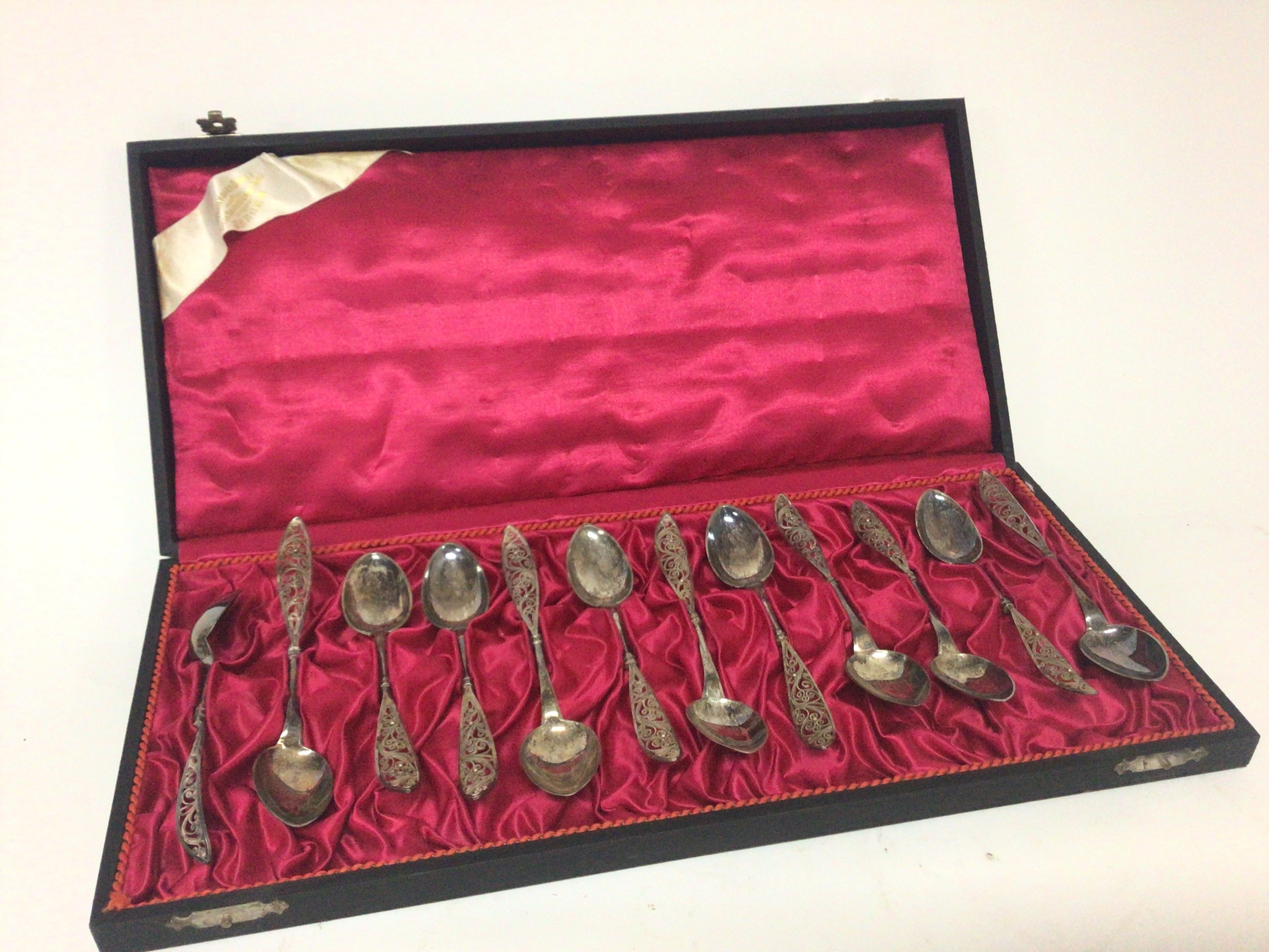 A cased set twelve of white metal Norwegian teaspoons with filigree decoration NO RESERVE