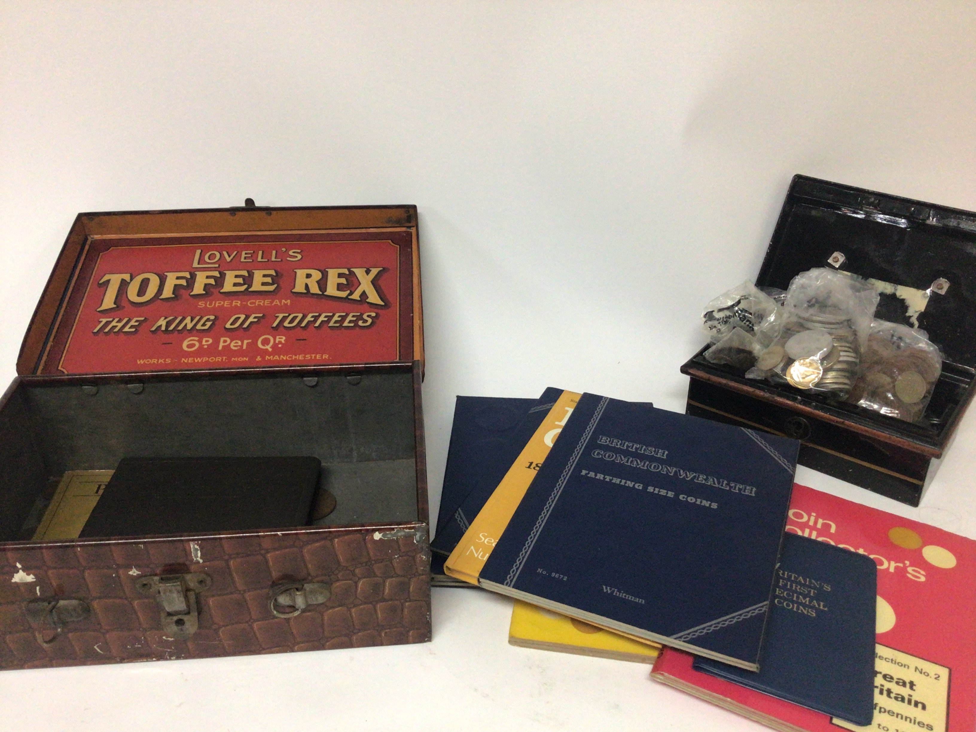 A Vintage Lovells Toffee tin in the form of a crocodile skin case and a collection of British coins in blue albums and world coins all used circulated. NO RESERVE