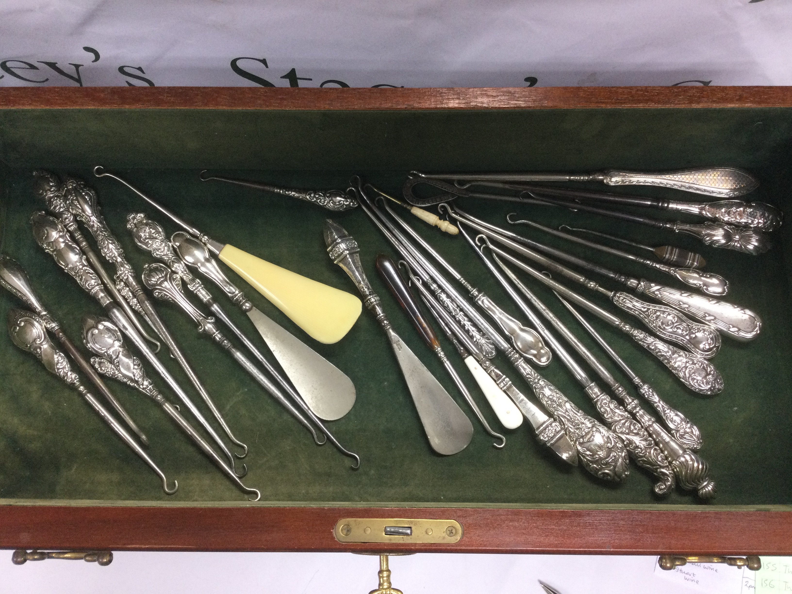 A collection of silver handled button hooks in a display case. Shipping category D.