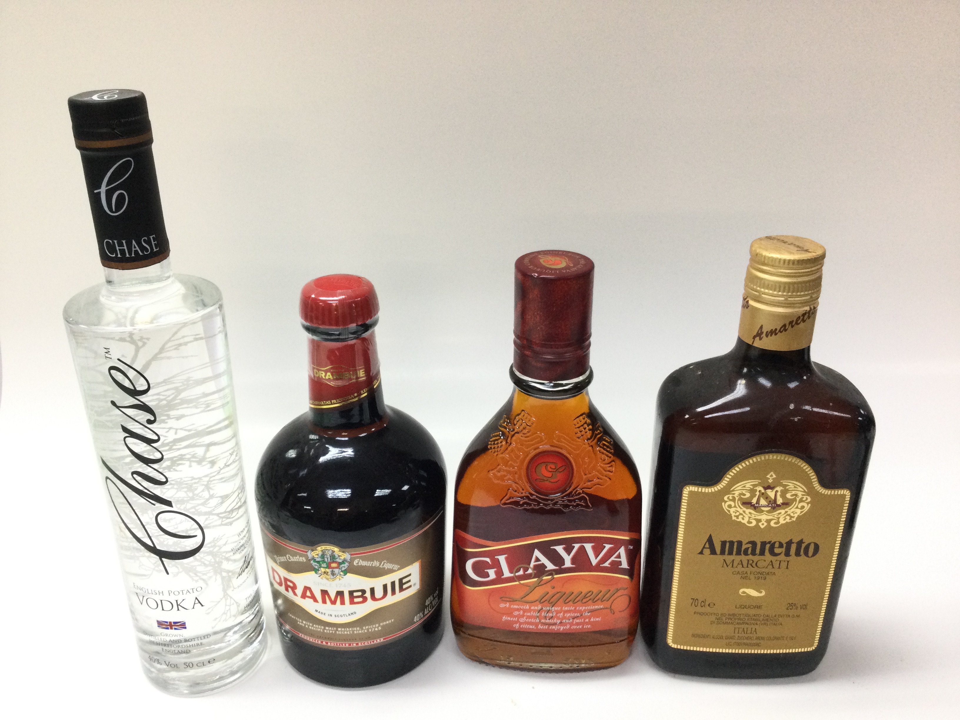 Four bottle of spirits including chase vodka Drambuie Glayva and an amaretto. NO RESERVE