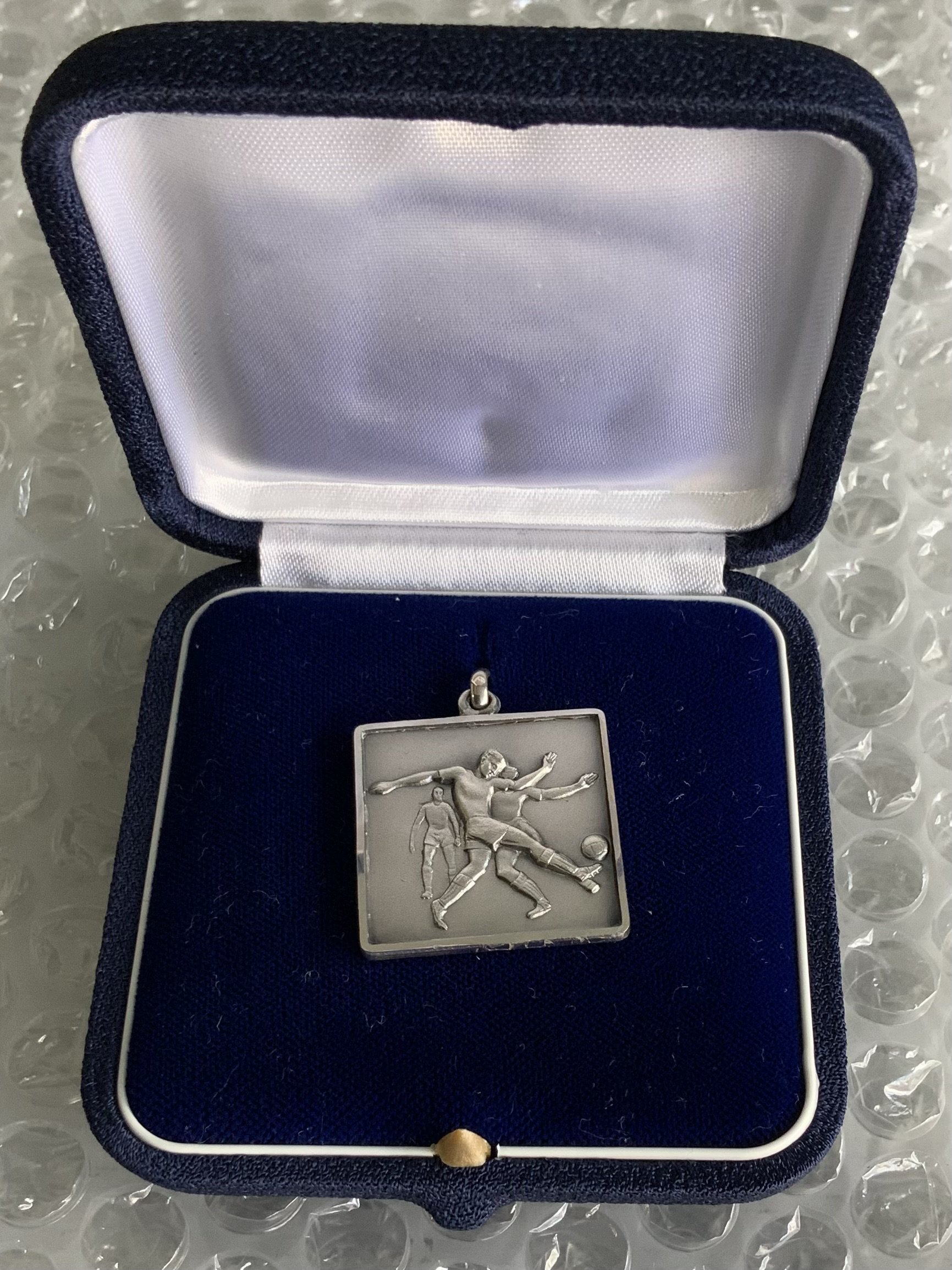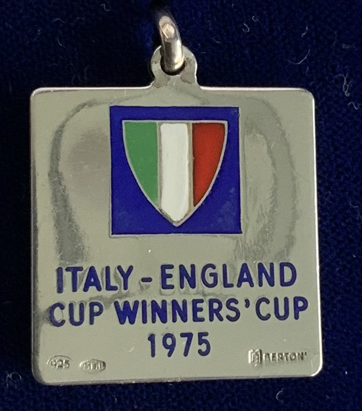 1975 West Ham Anglo Italian Cup Winners Cup Final Football Medal: Silver 925 boxed runners up medal for the two legged final. Match was winners of the FA Cup v winners of Coppa Italia Fiorentina and not to be confused with the Anglo Italian Cup. Football action scene to one side and below Italian flag to reverse are the words Italy- England Cup Winners Cup 1975. Awarded to Alan Taylor who has provided a COA.