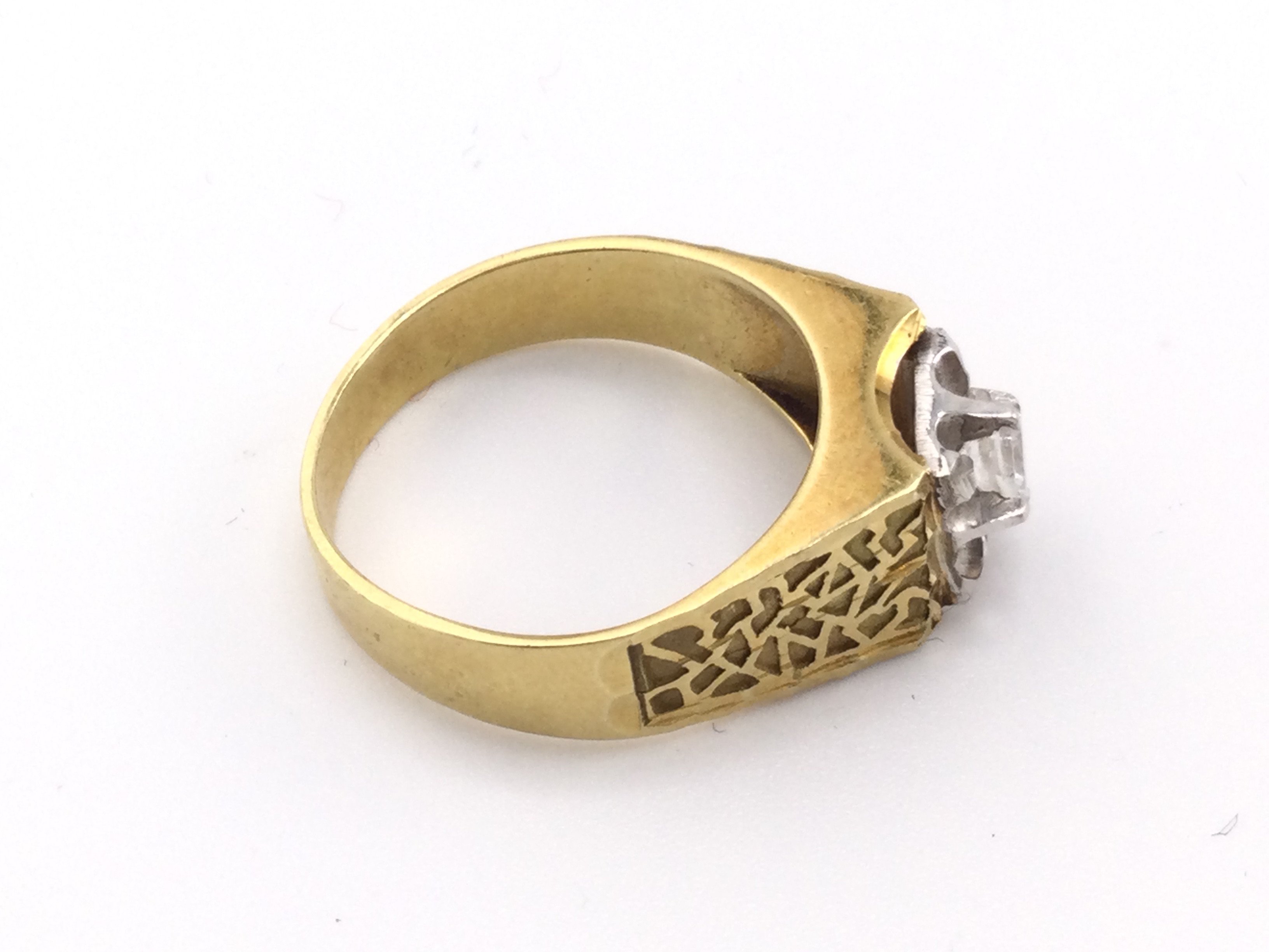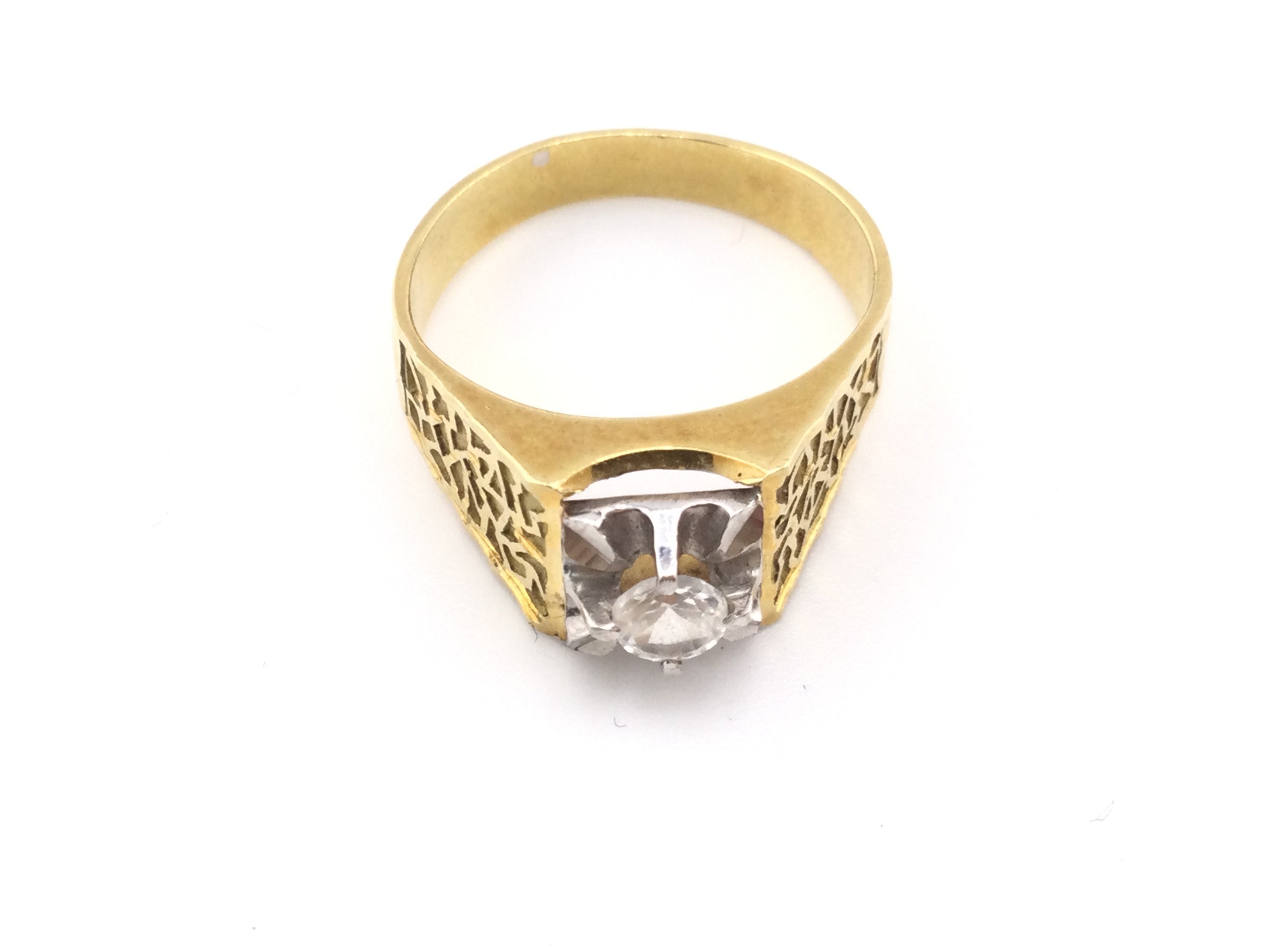 An unmarked high ct gold ring set with white sapphire. 5.53g and R 1/2